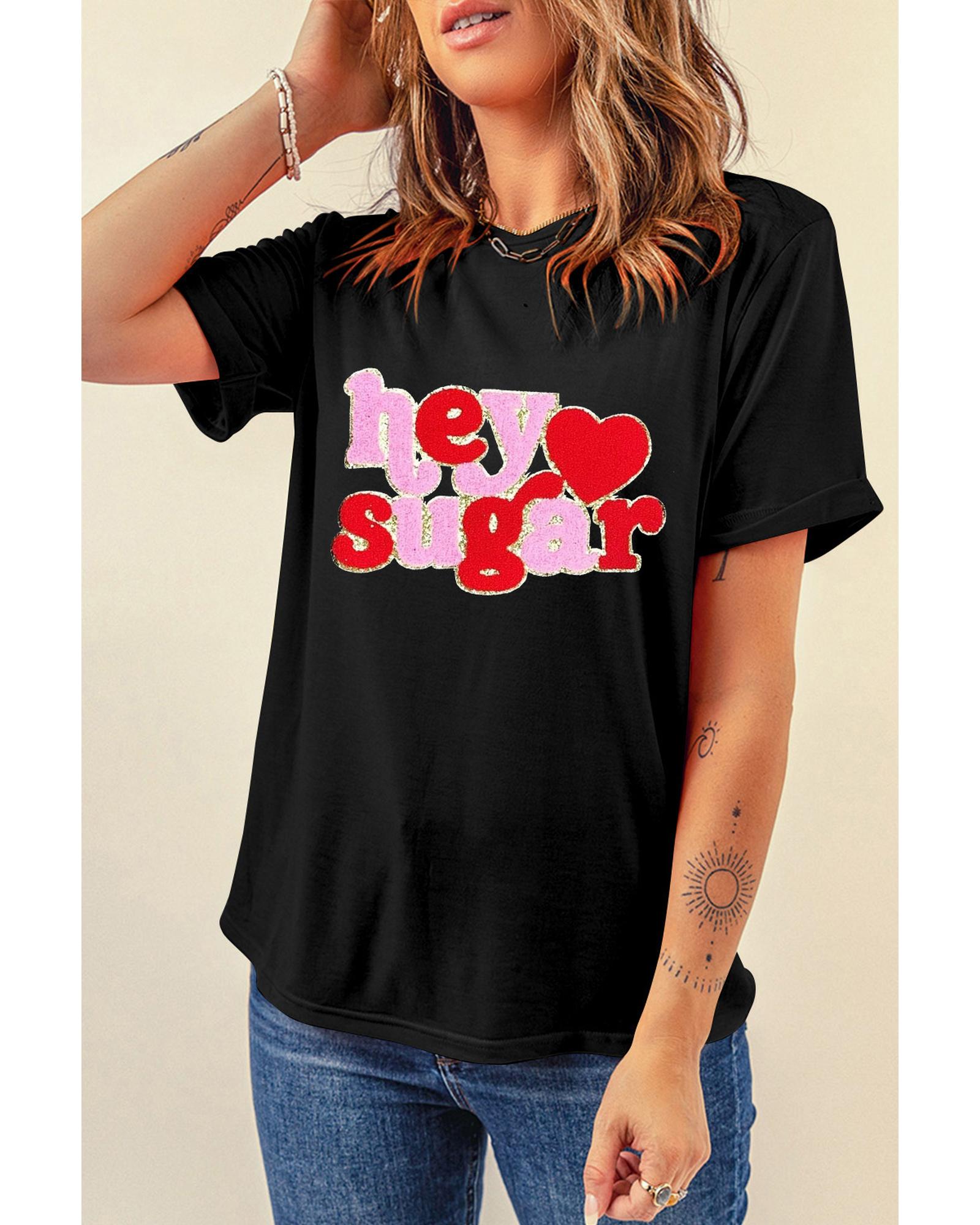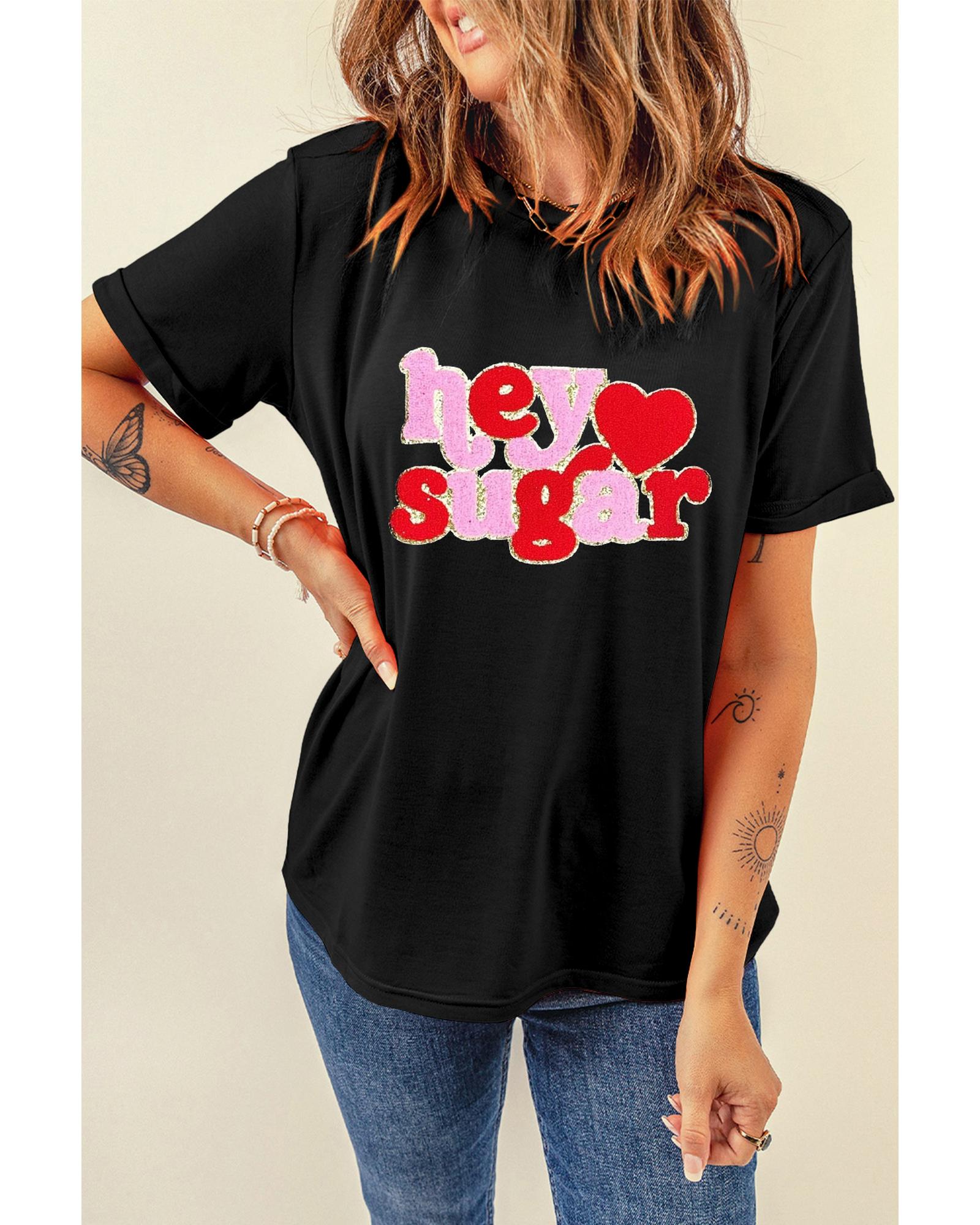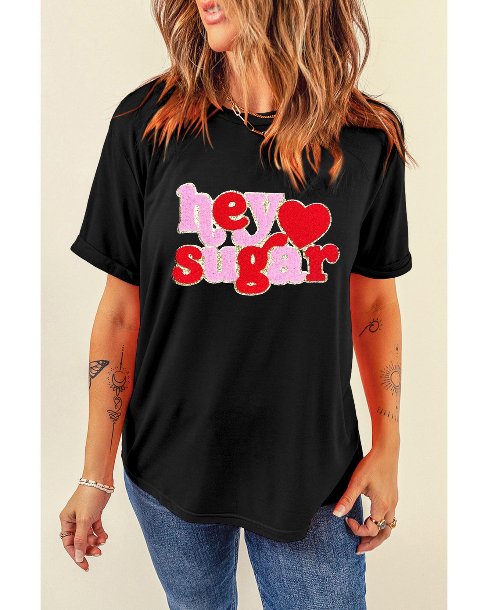 Black Chenille Heart hey sugar Patched Crewneck Valentines Tee – XL