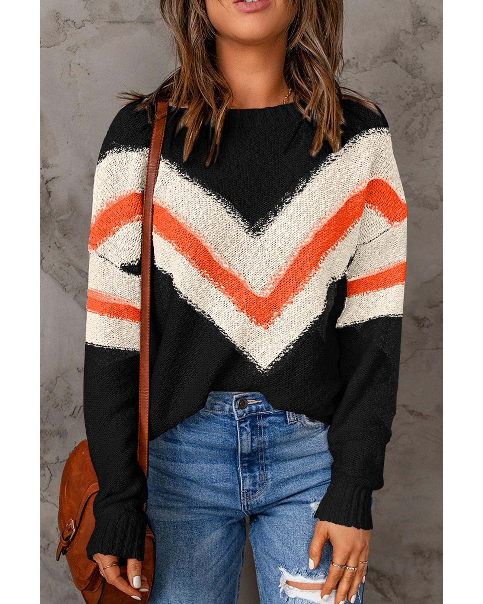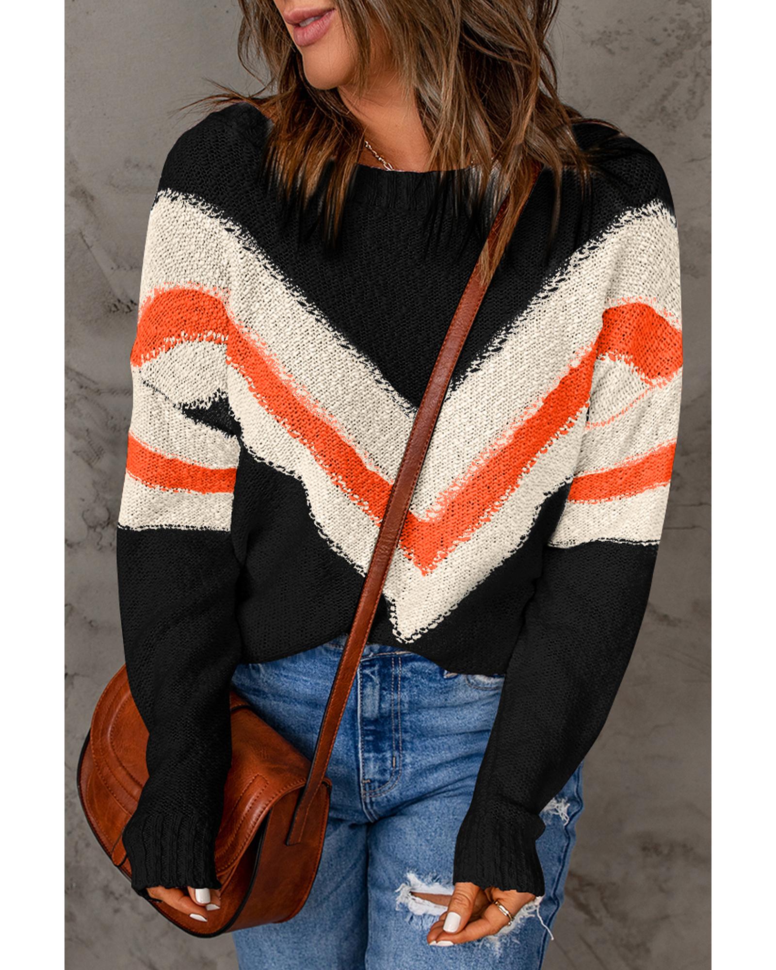 Black Chevron Striped Drop Shoulder Sweater – S
