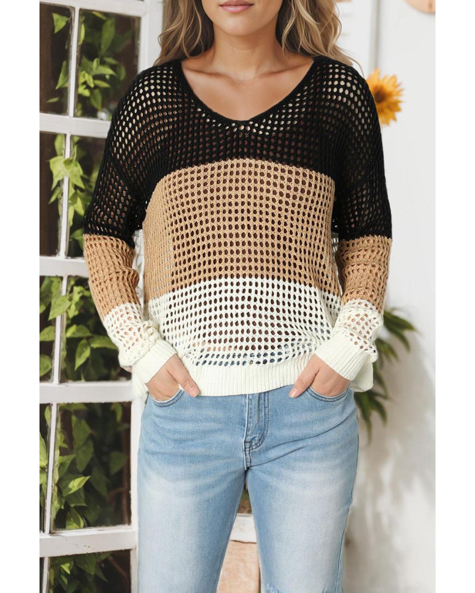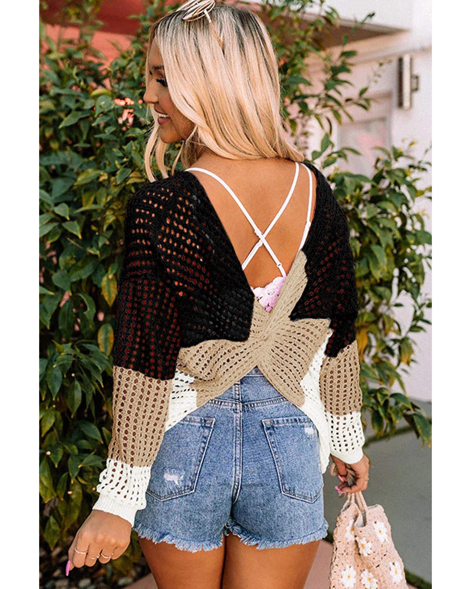 Black Color Block Eyelet Long Sleeve Twisted Back Knit Top – M