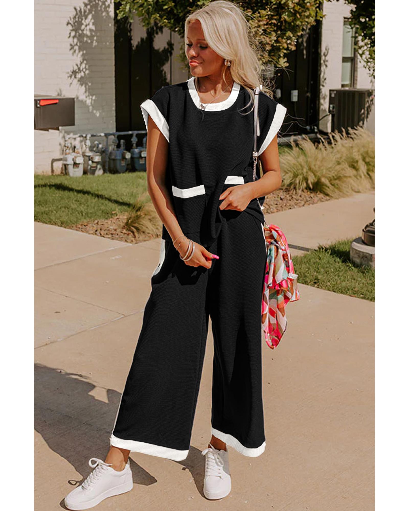 Black Color Block Pocketed T Shirt and Wide Leg Pants Set – L
