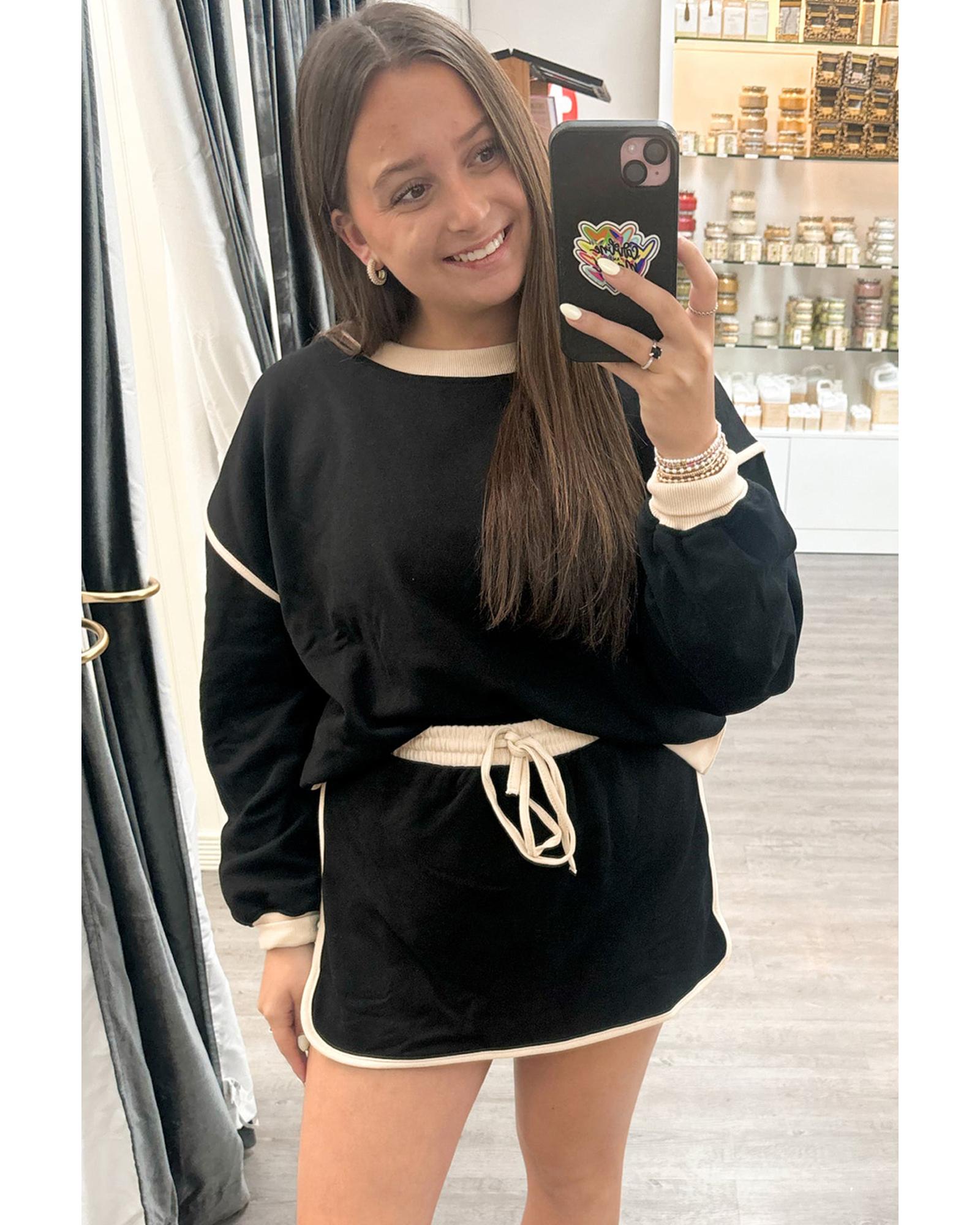 Black Color Contrast Loose Pullover and Lace-up Waist Skort Set - XL