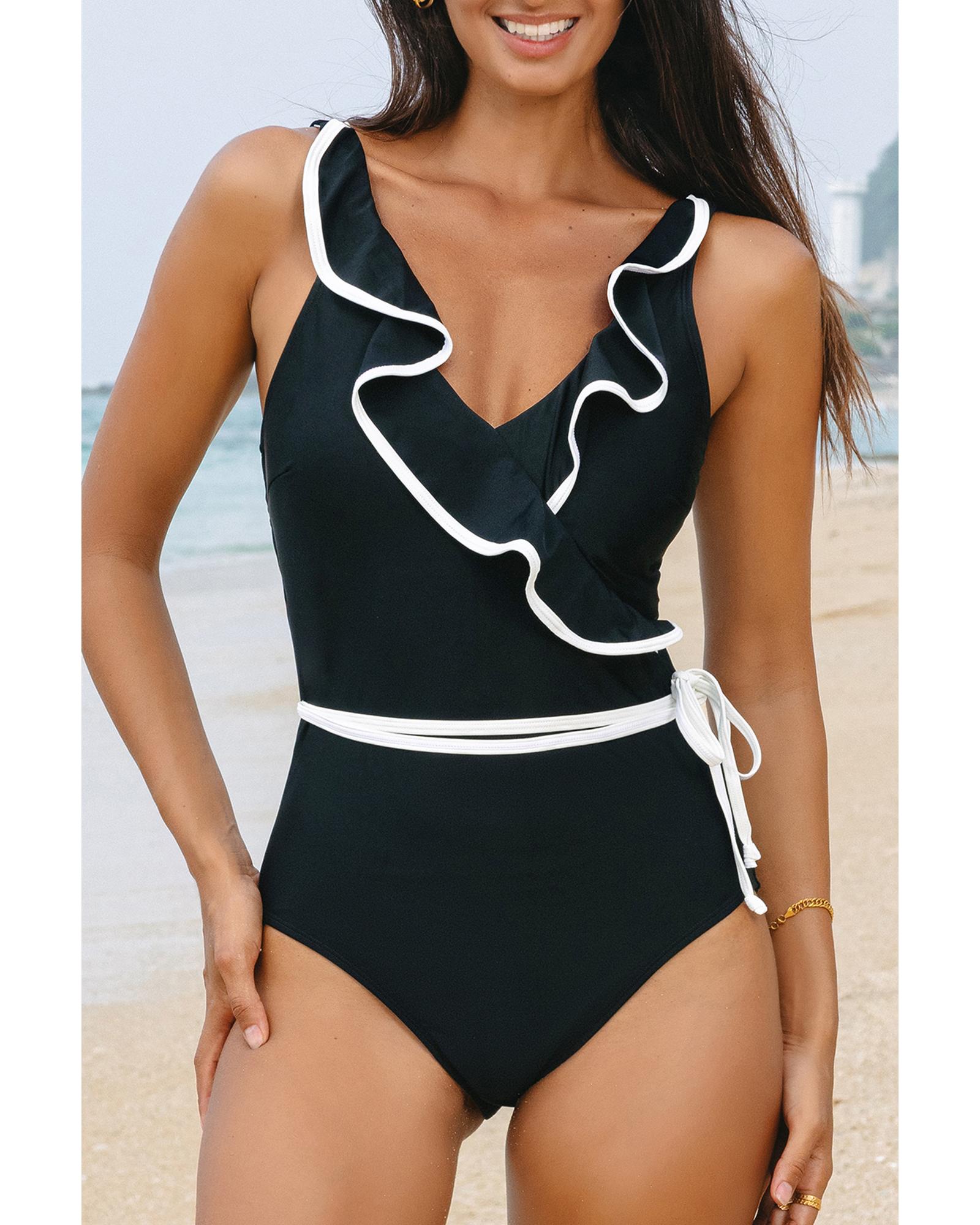 Black Color Contrast Ruffled Wrap V Neck Swimsuit – L
