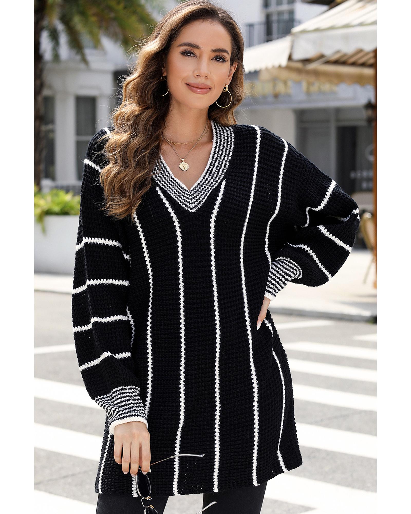Black Colorblock Striped V Neck Knitted Loose Sweater – L