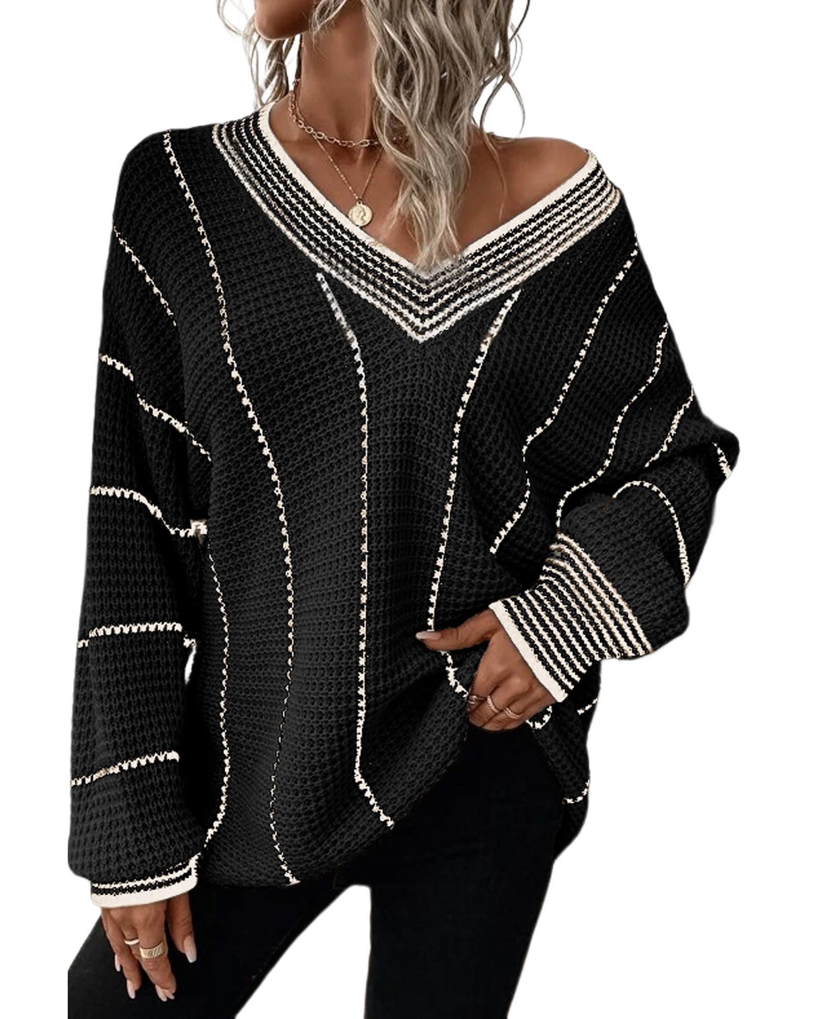 Black Colorblock Striped V Neck Knitted Loose Sweater – XL