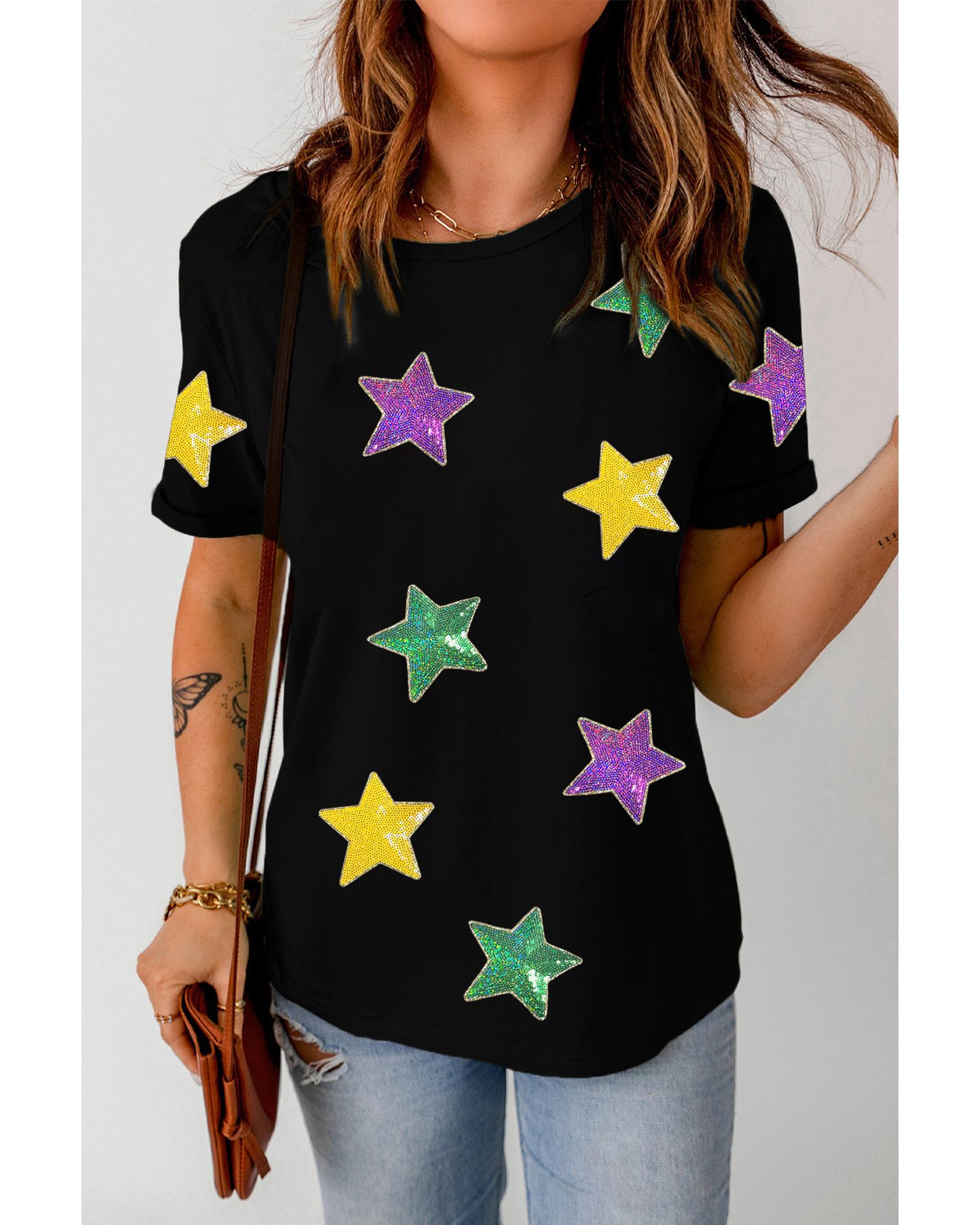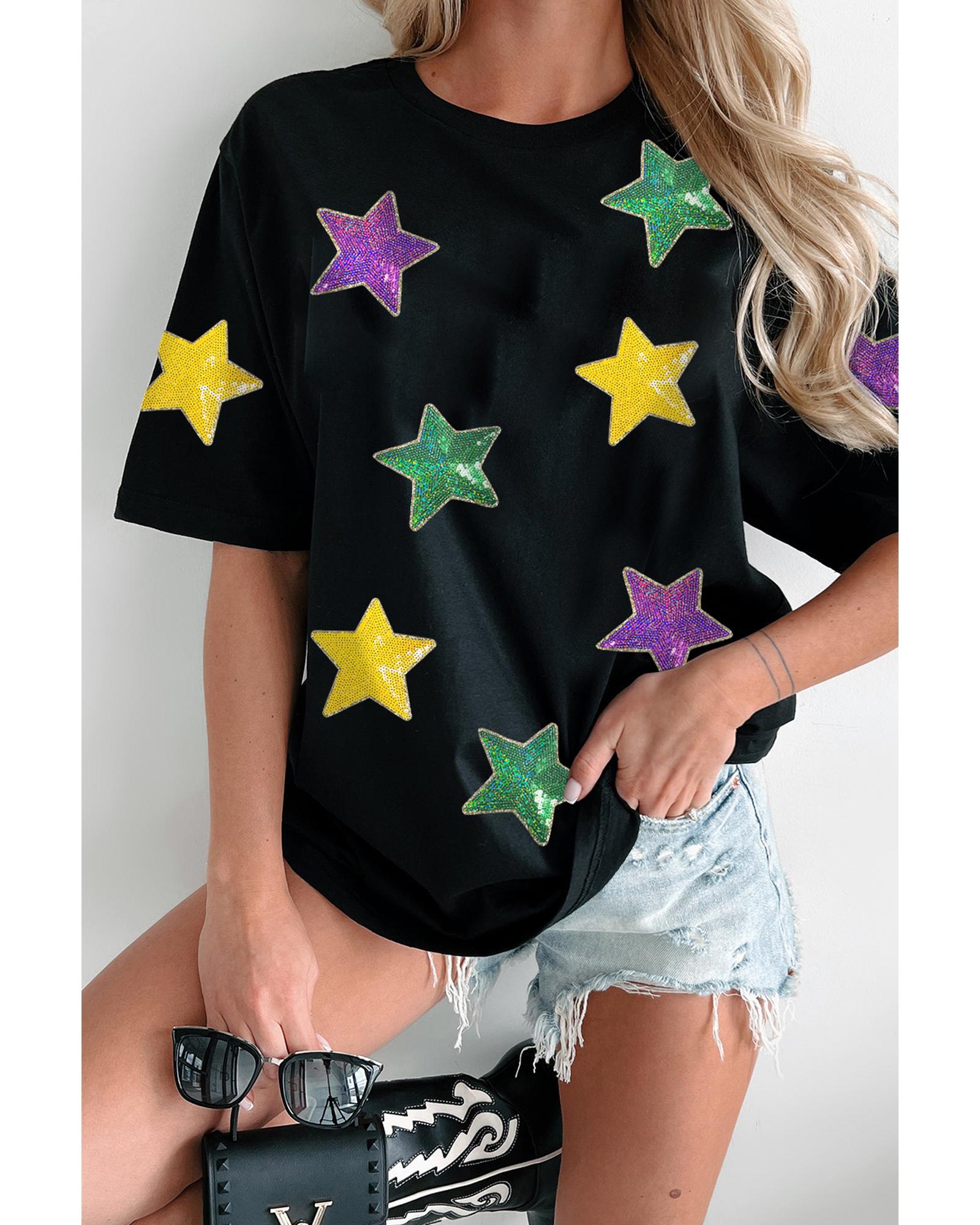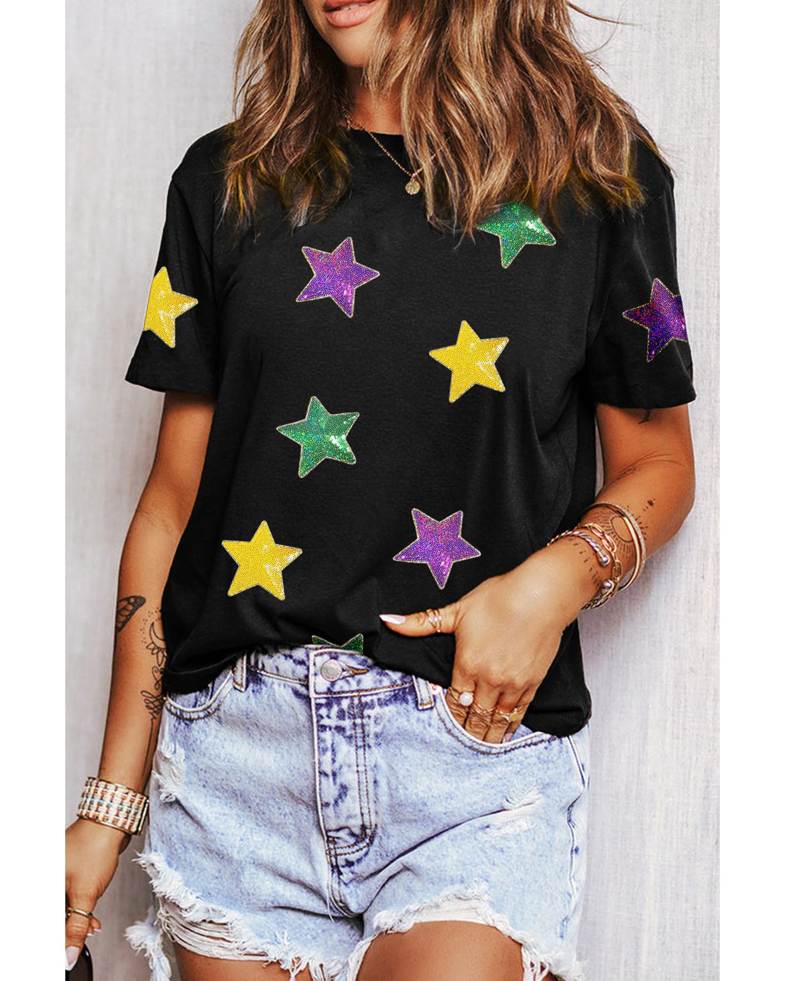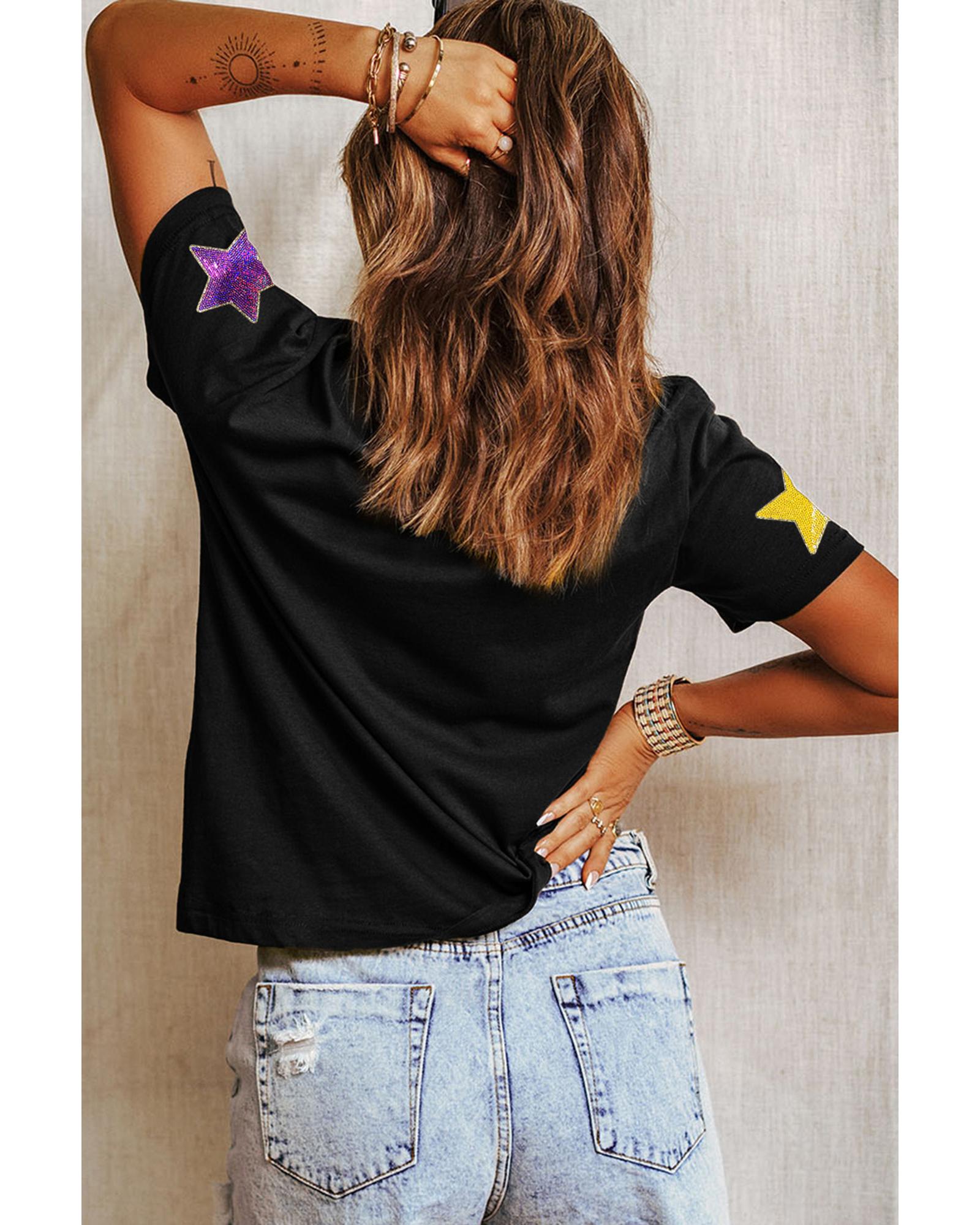 Black Colorful Sequin Stars Patched Relaxed T Shirt – 2XL