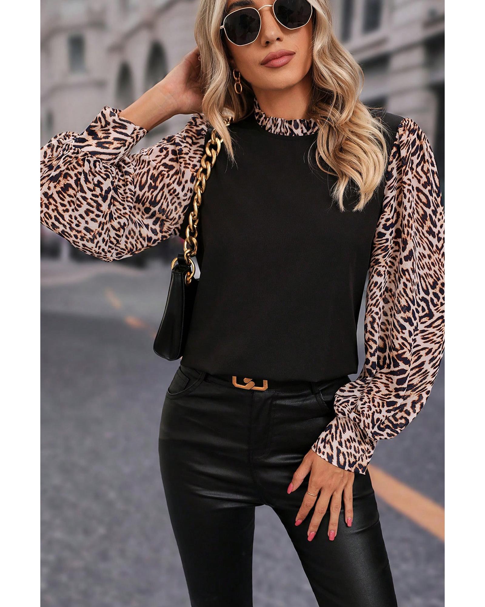 Black Contrast Leopard Print Lantern Sleeve Blouse – M