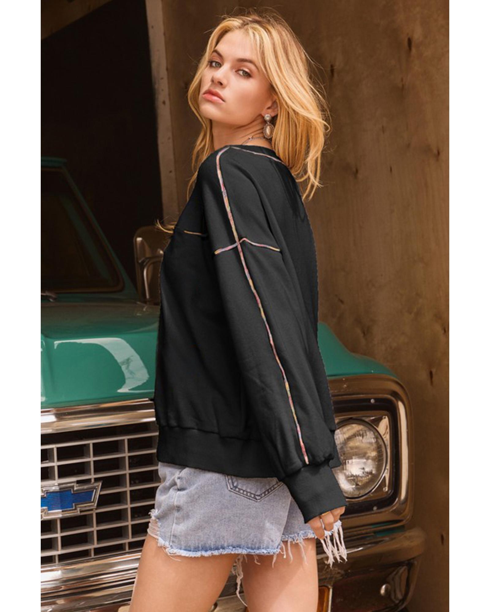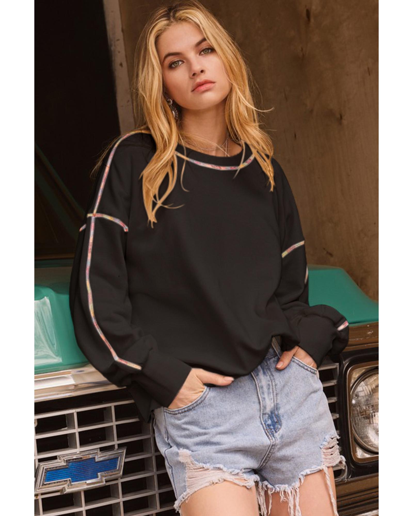 Black Contrast Rainbow Trim Drop Shoulder Pullover Sweatshirt – L