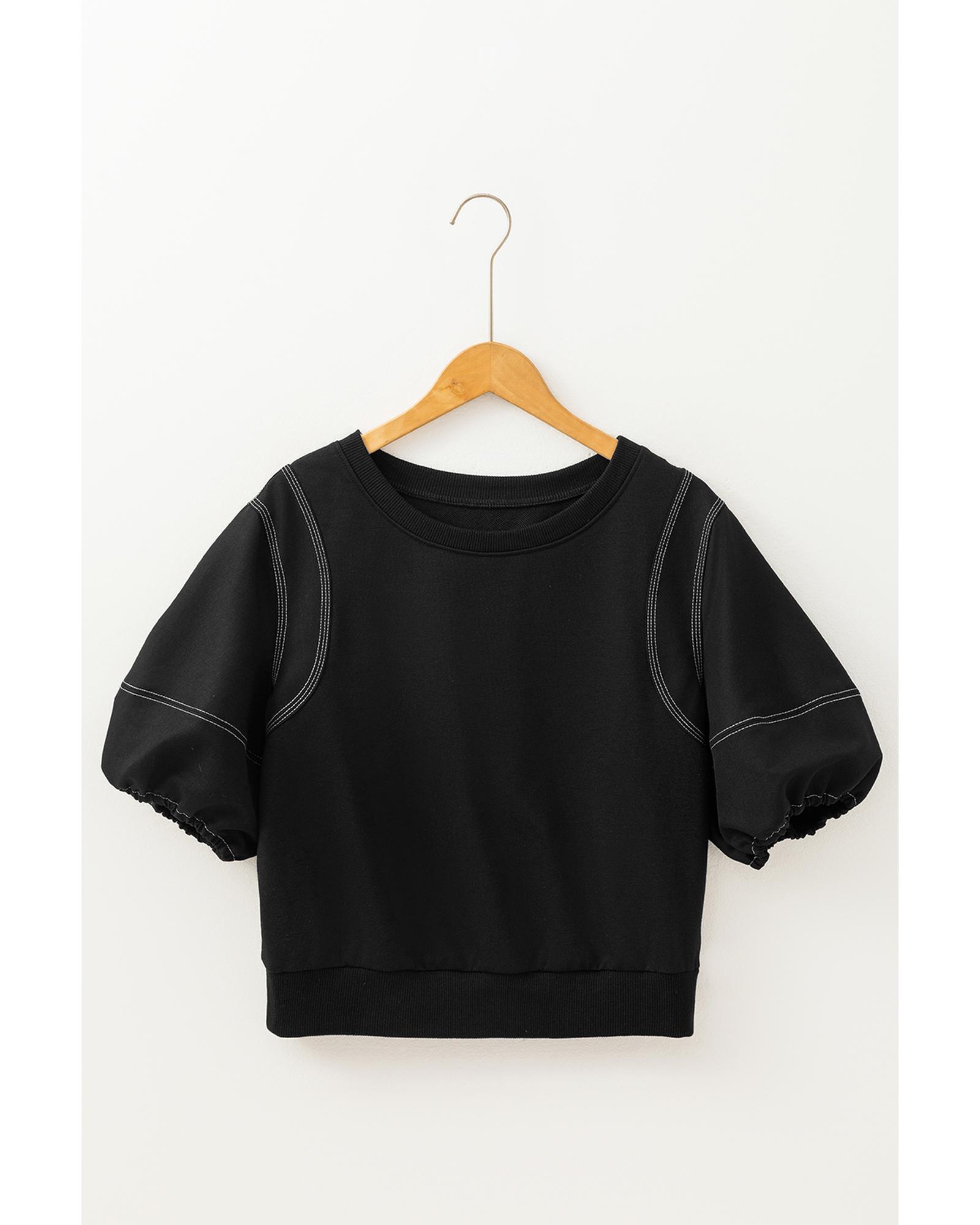 - Black Contrast Stitches Detail Puffy Half Sleeve Blouse