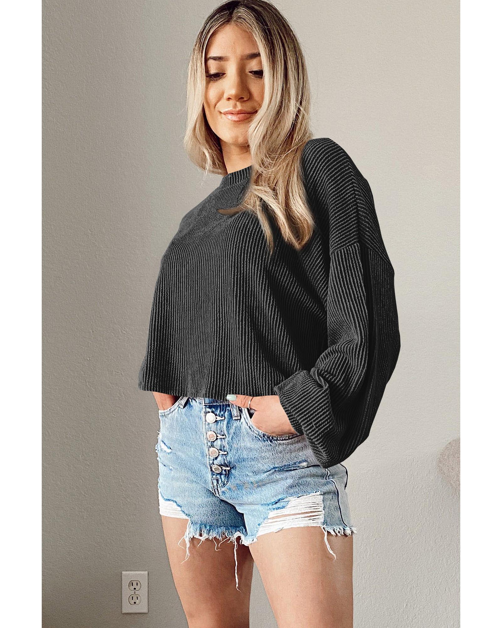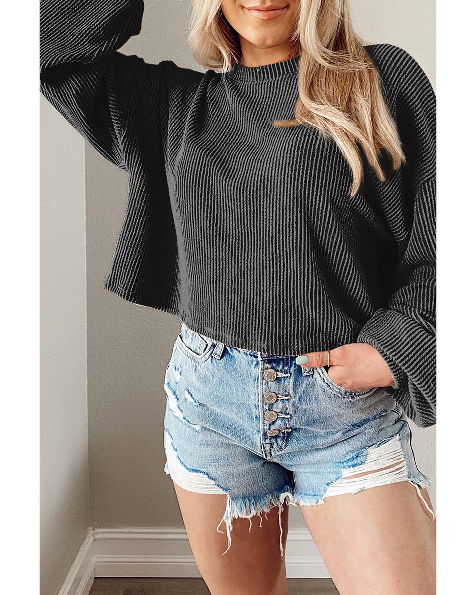 Black Cording Drop Shoulder Puff Sleeve Casual Long Sleeve Top – L