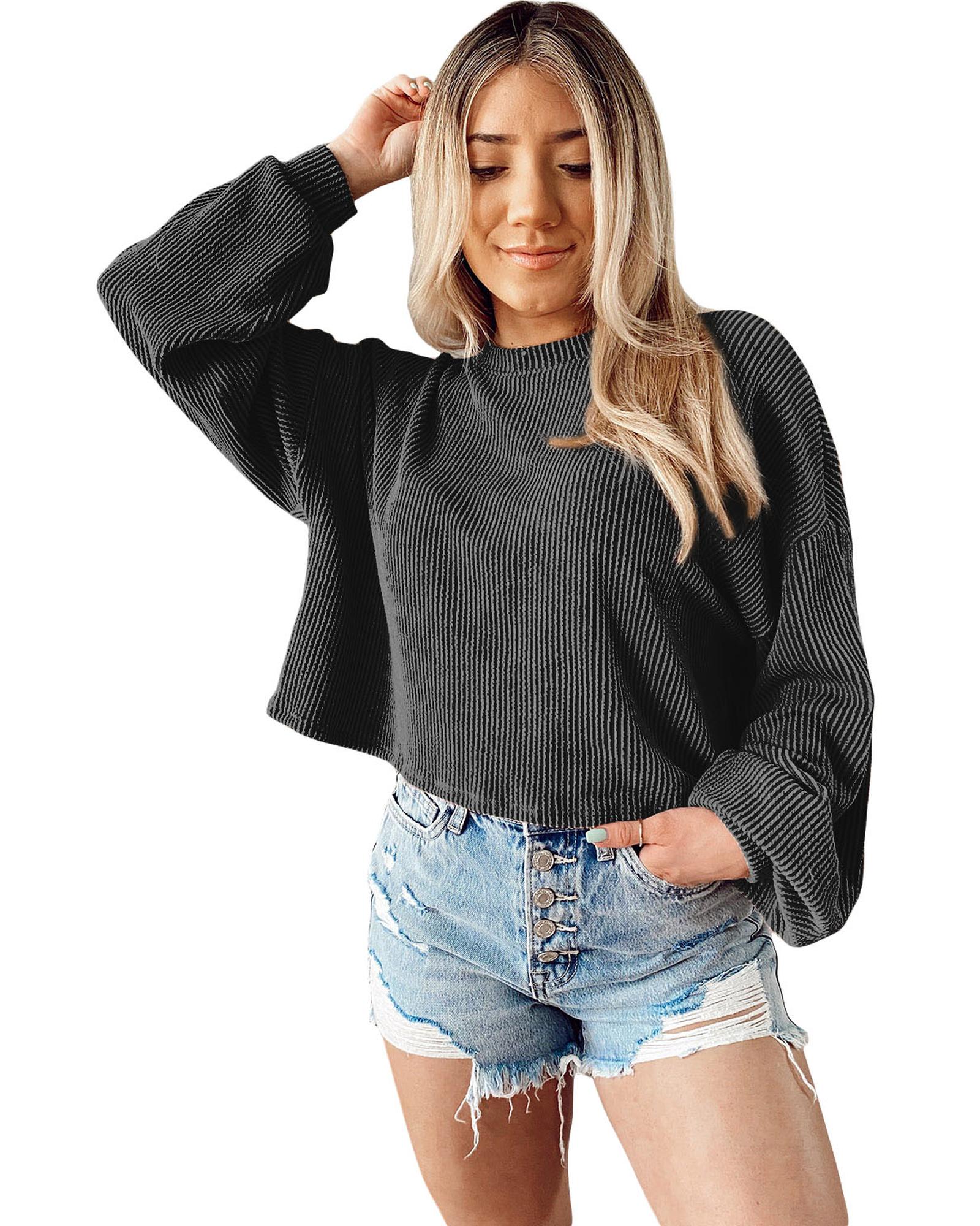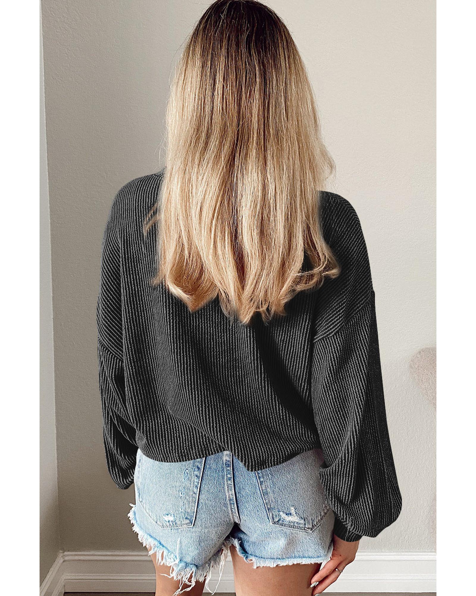 Black Cording Drop Shoulder Puff Sleeve Casual Long Sleeve Top – XL