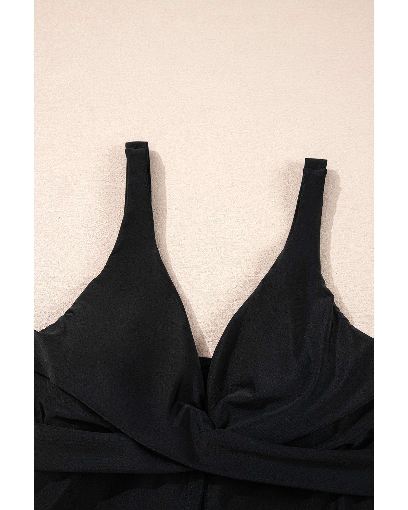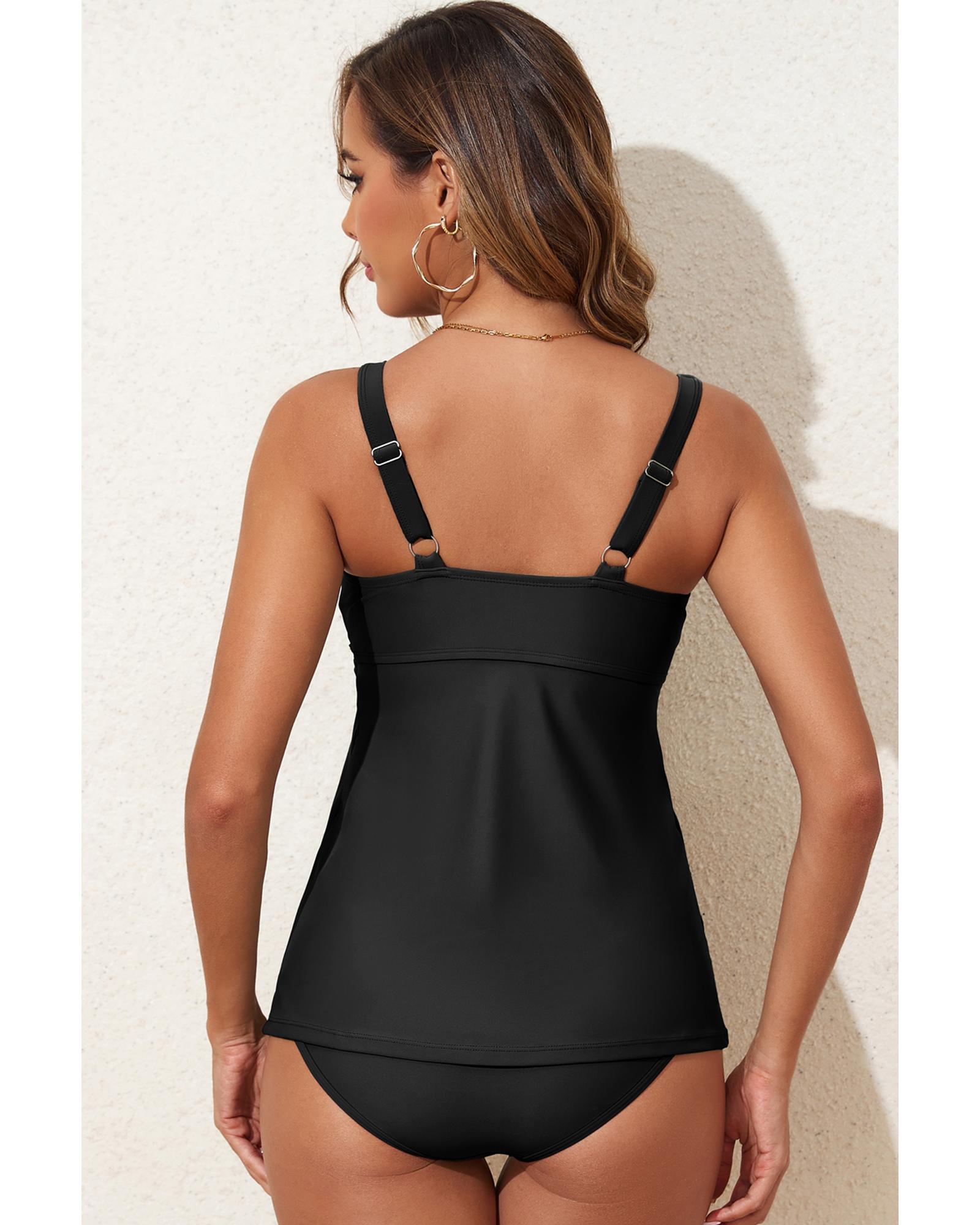 Black Crossed V Neck Adjustable Strap Babydoll Tankini Top – L