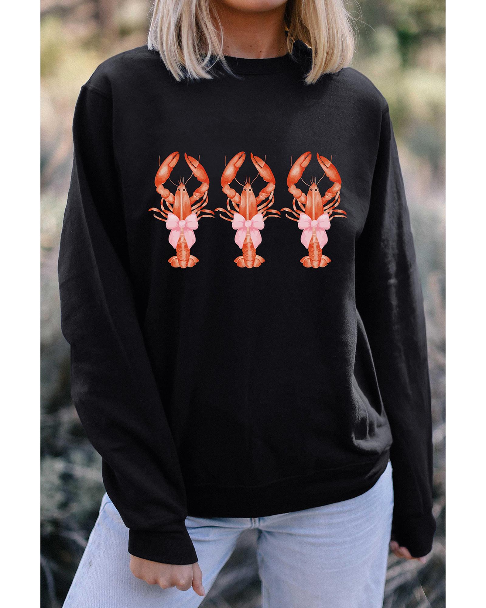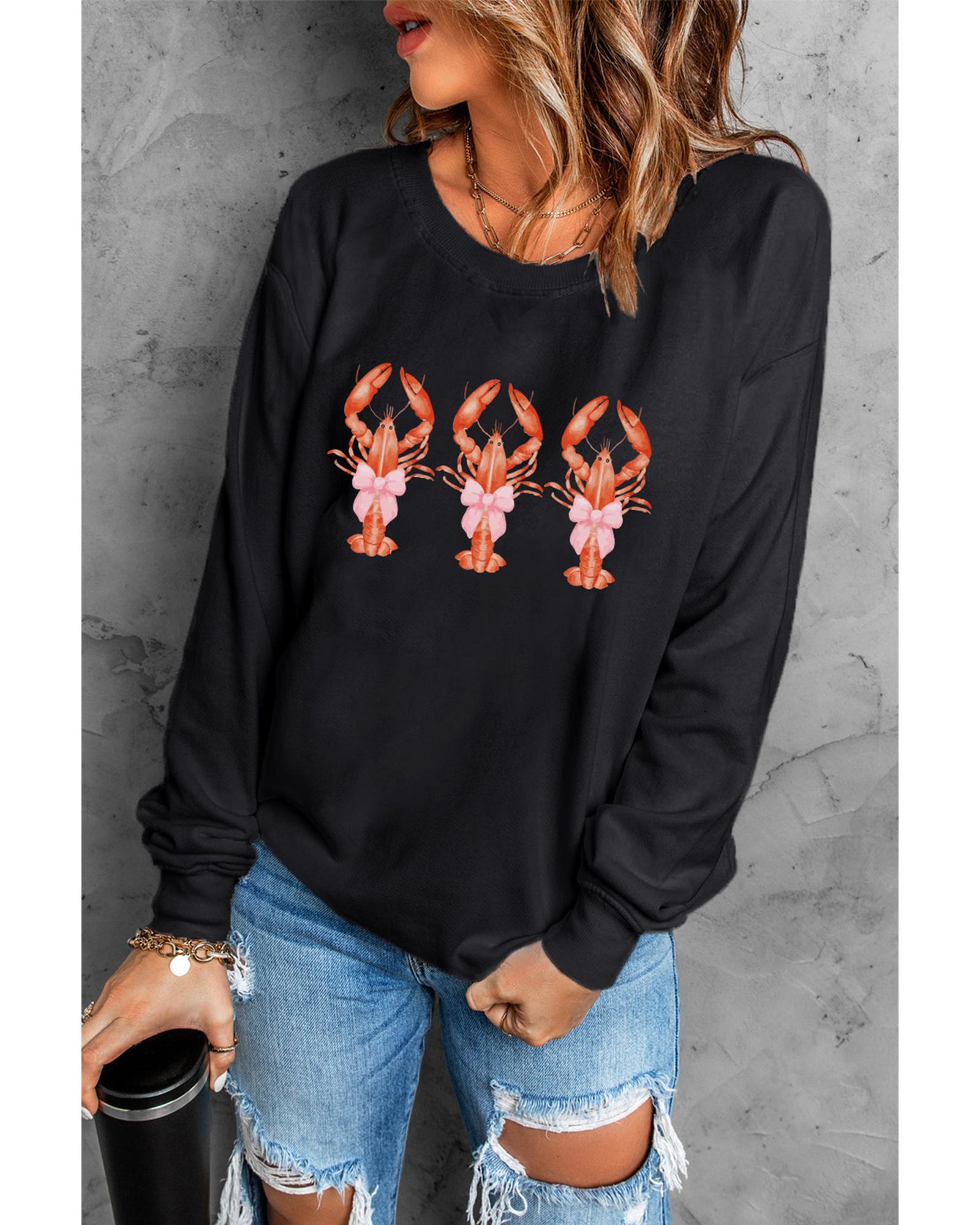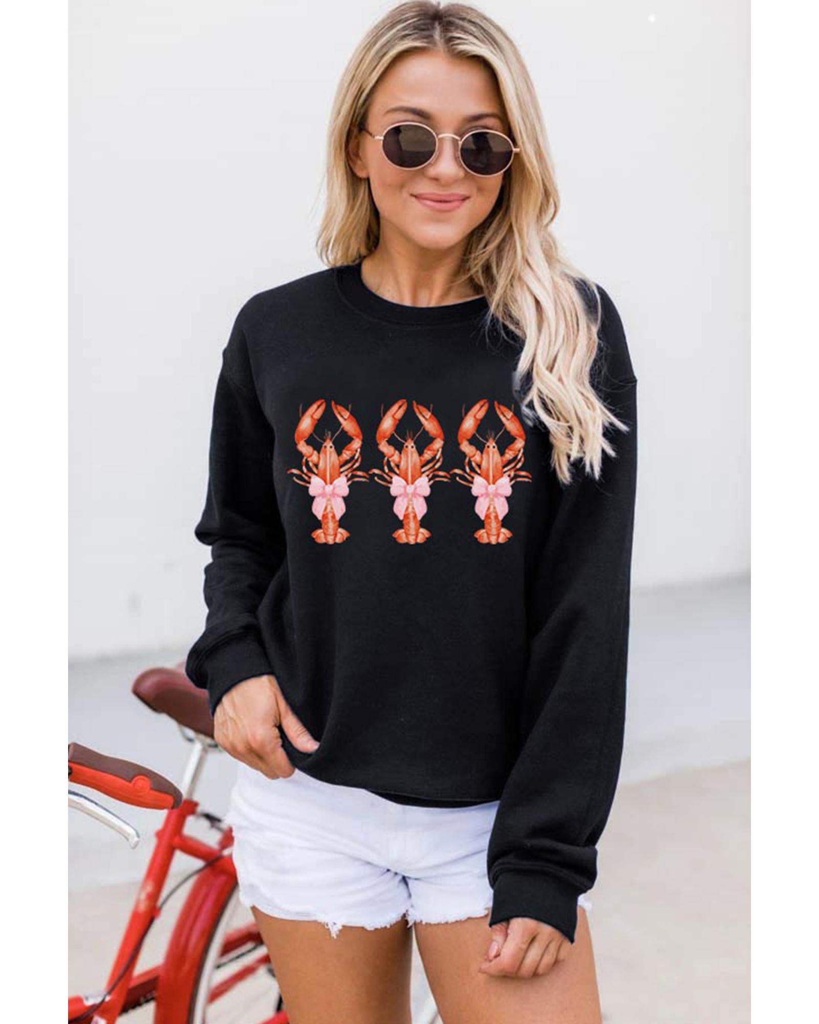 - Black cute bow crawfish printed drop shoulder sweatshirt