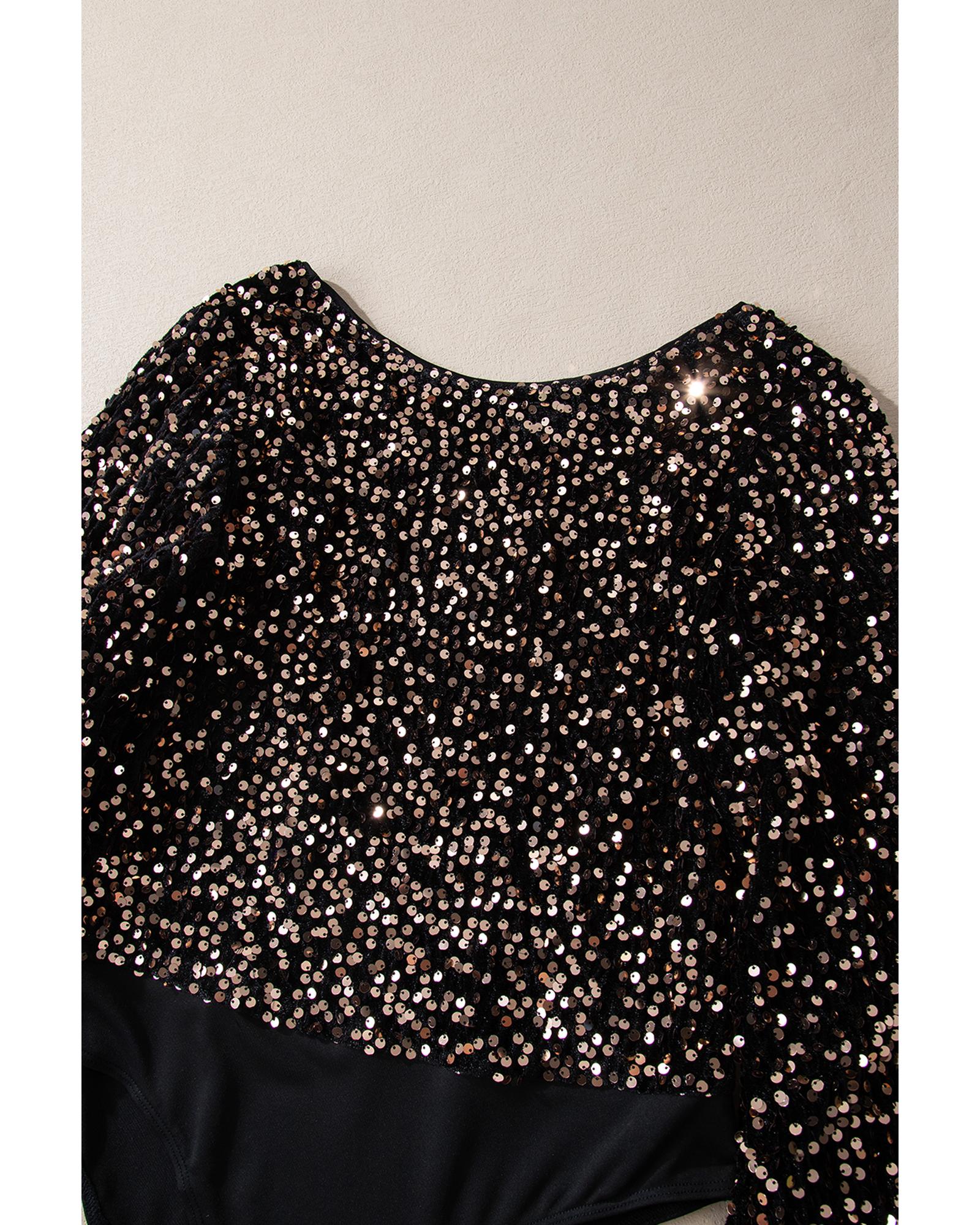 Black Deep V Back Sequin Puff Sleeve Bodysuit – L