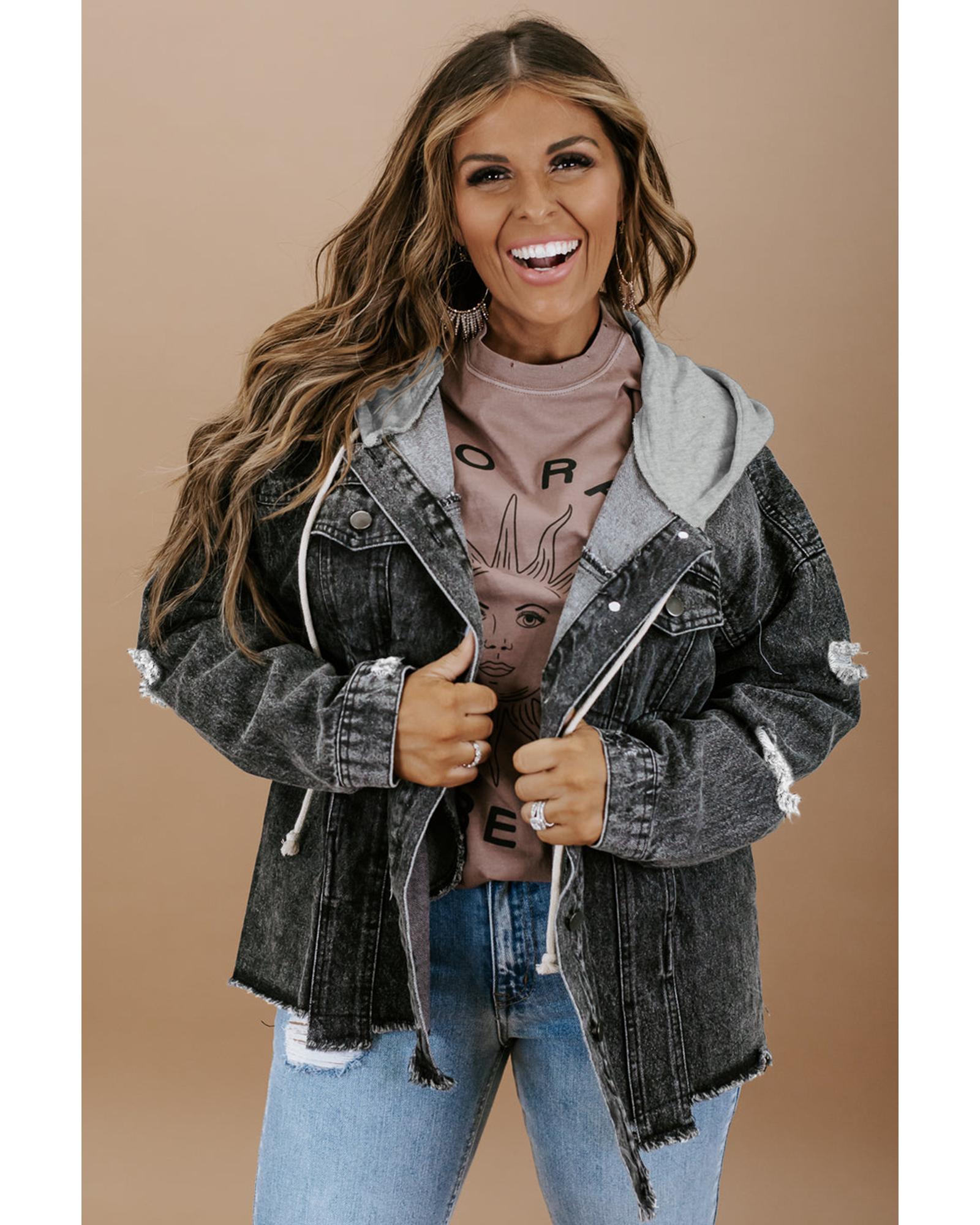 Black Drawstring Hooded Frayed Denim Jacket – M
