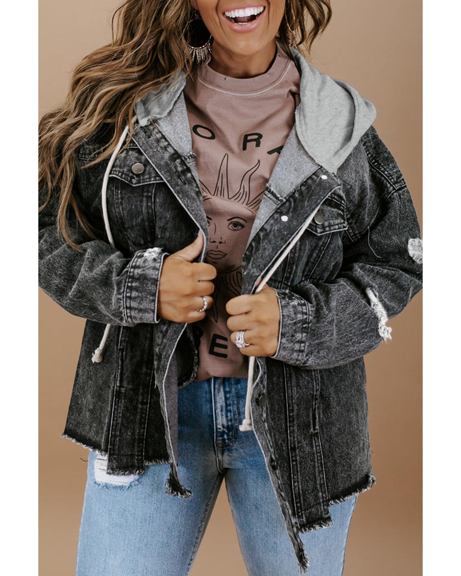 Black Drawstring Hooded Frayed Denim Jacket – XL
