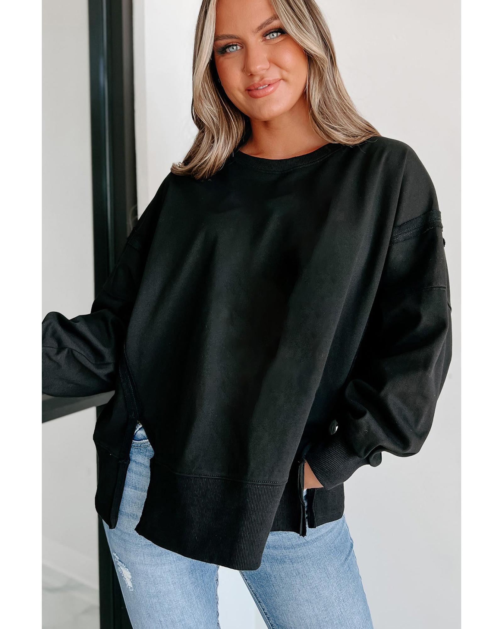 - Black Exposed Seam Drop Shoulder Round Neck Sweatshirt with Slits