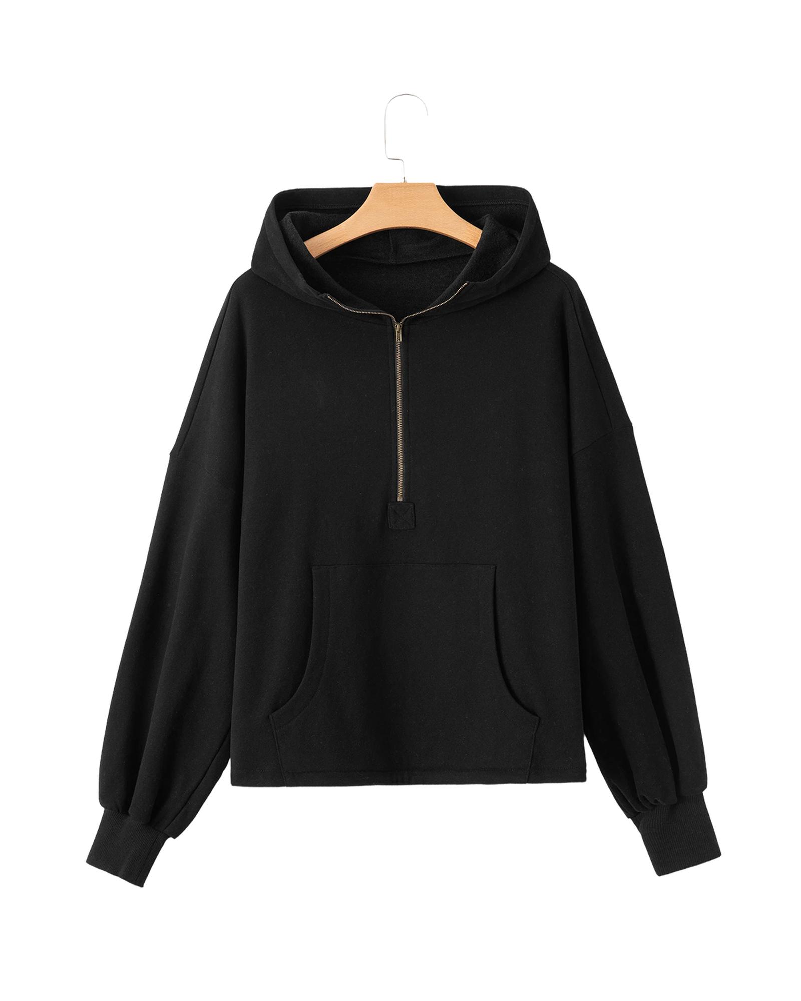 - Black Fleece Lined Half Zipper Kangaroo Pockets Loose Hoodie