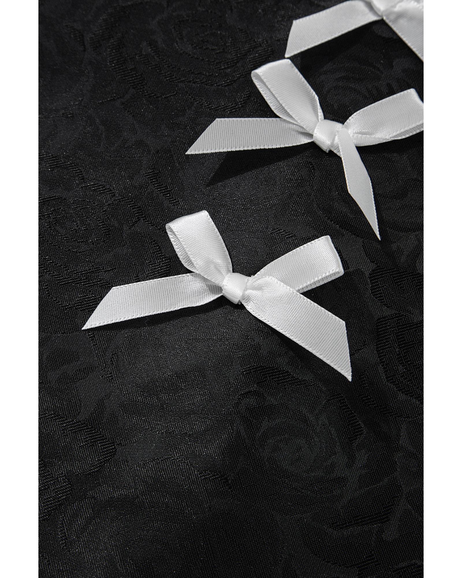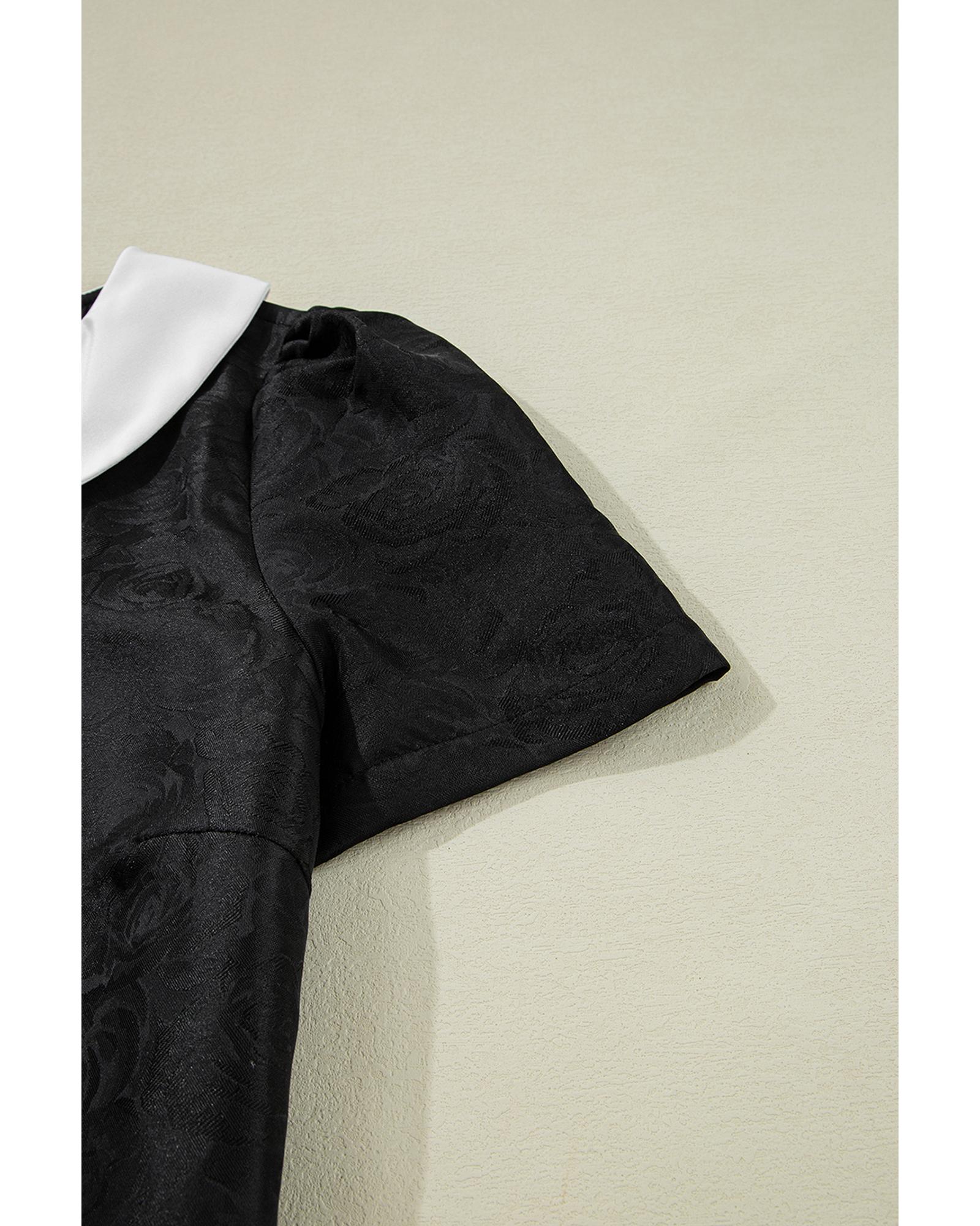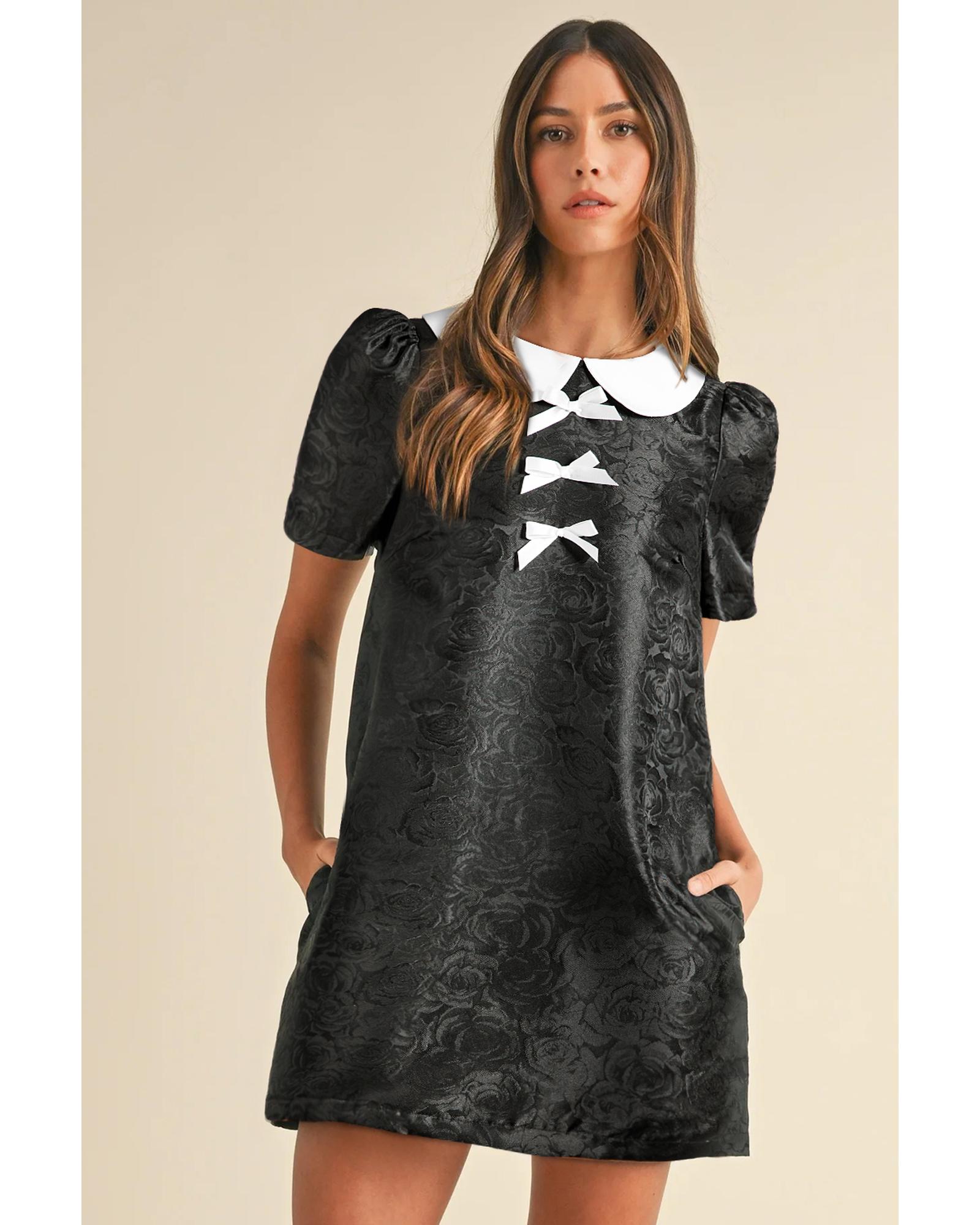 Black Floral Embossed Puff Sleeve Colorblock Bow Collared Mini Dress – XL