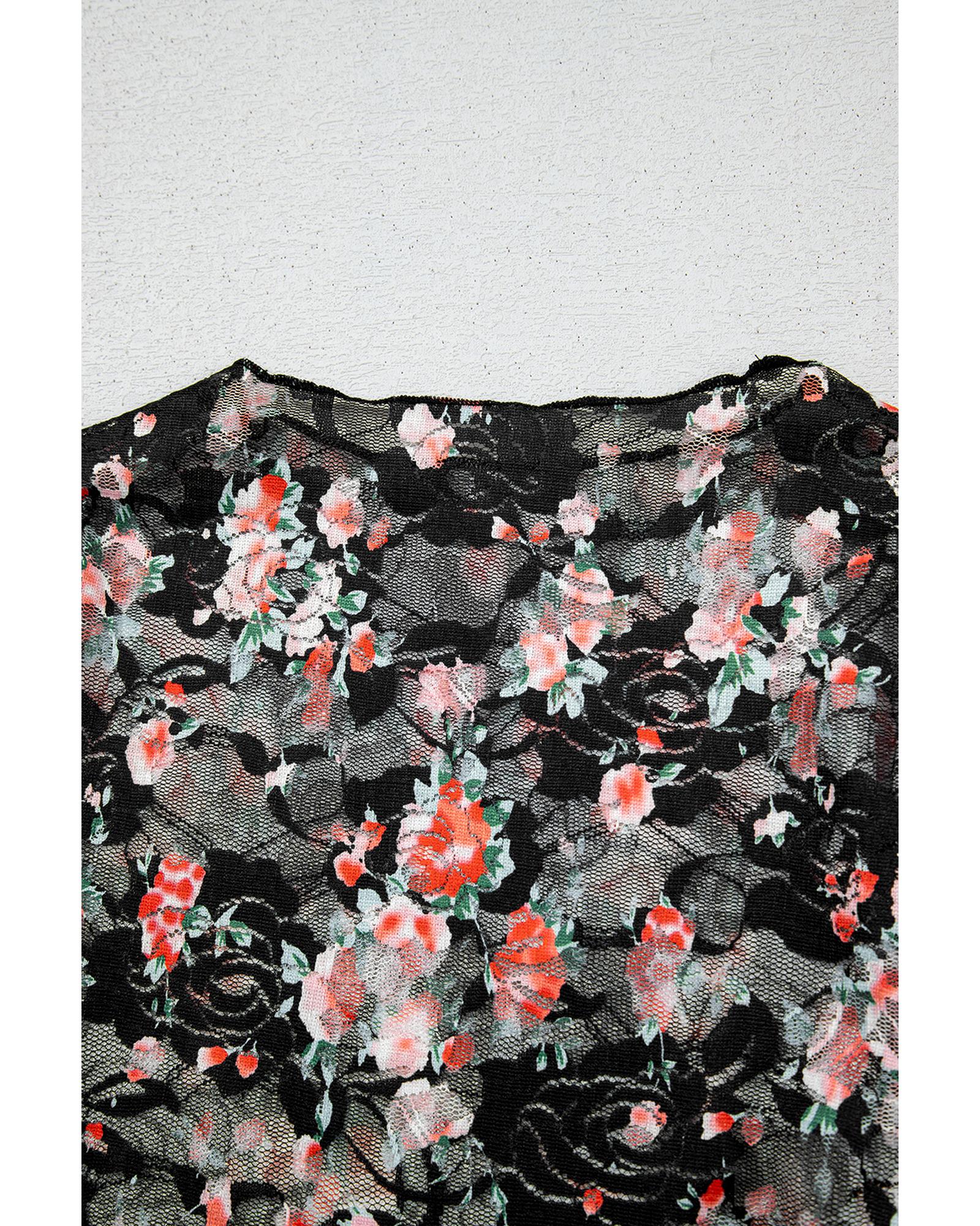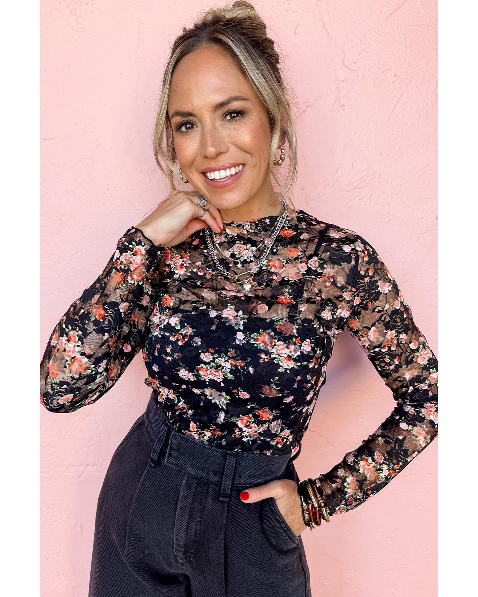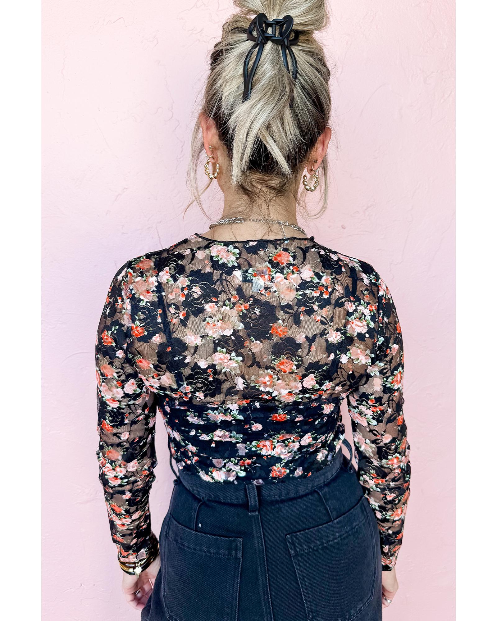 - Black Floral Mesh Sheer Long Sleeve Top with floral pattern