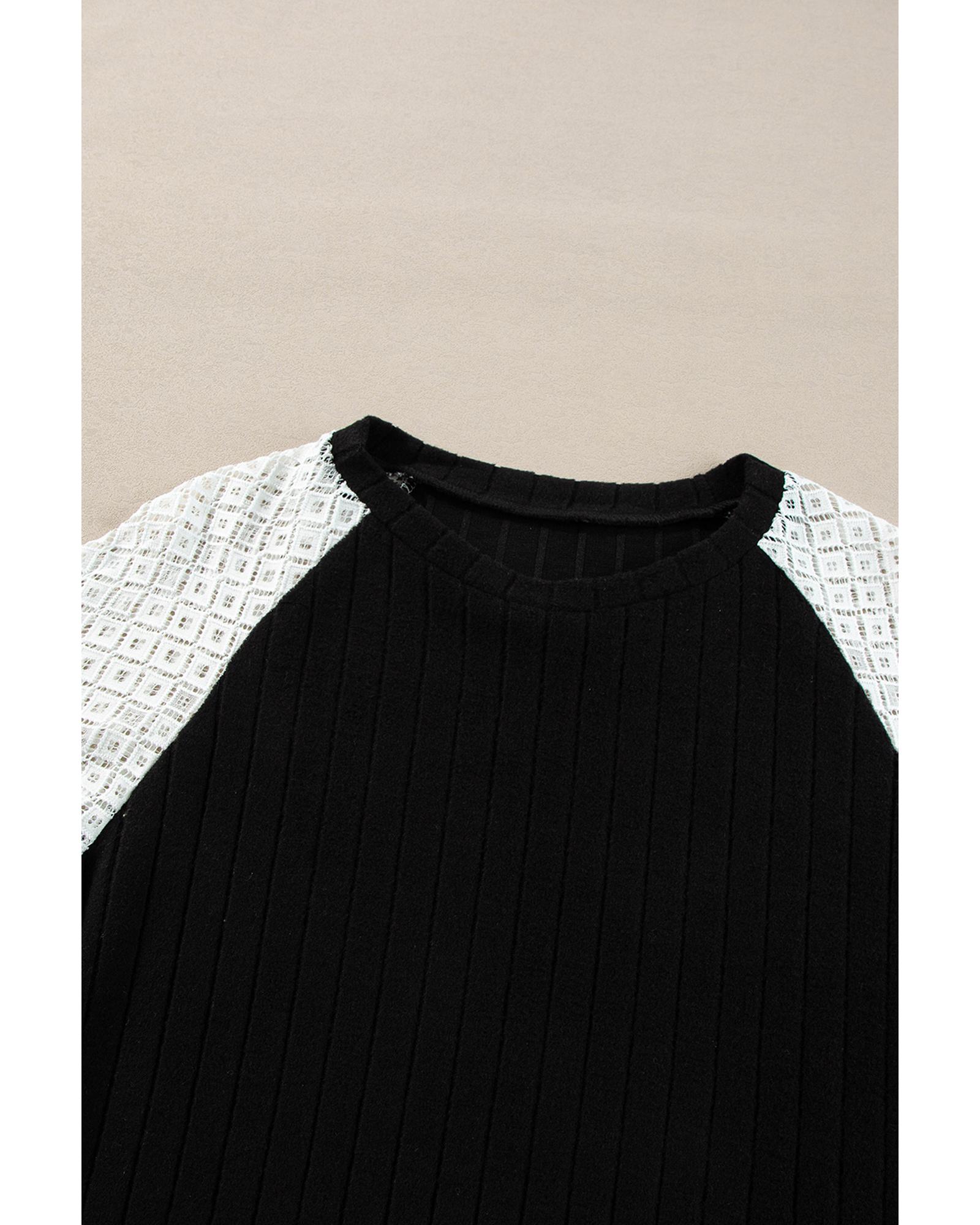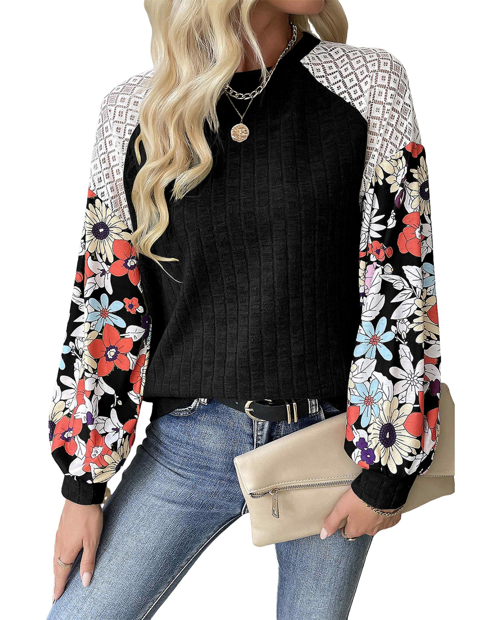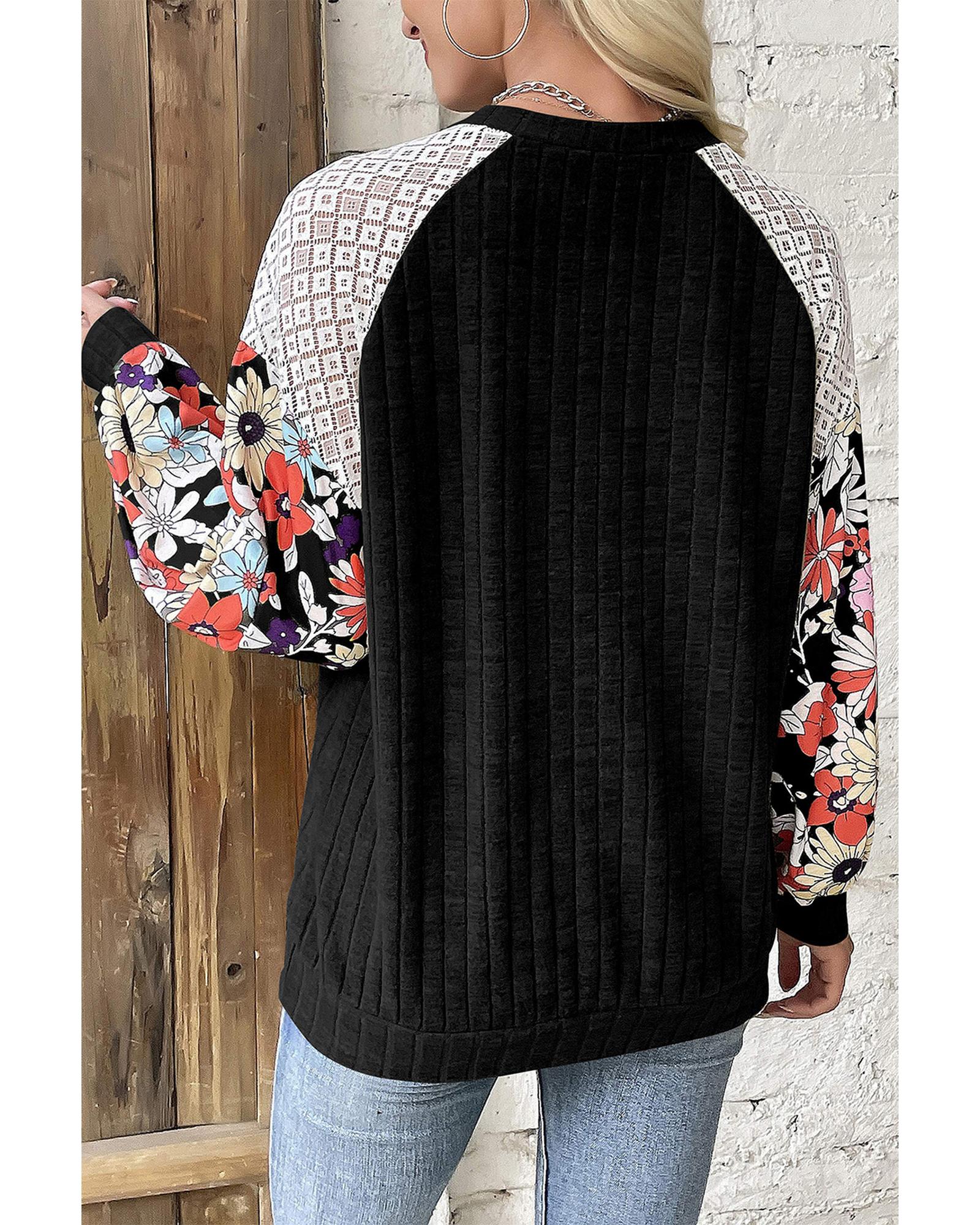 - Black Floral Patchwork Long Sleeve Ribbed Blouse