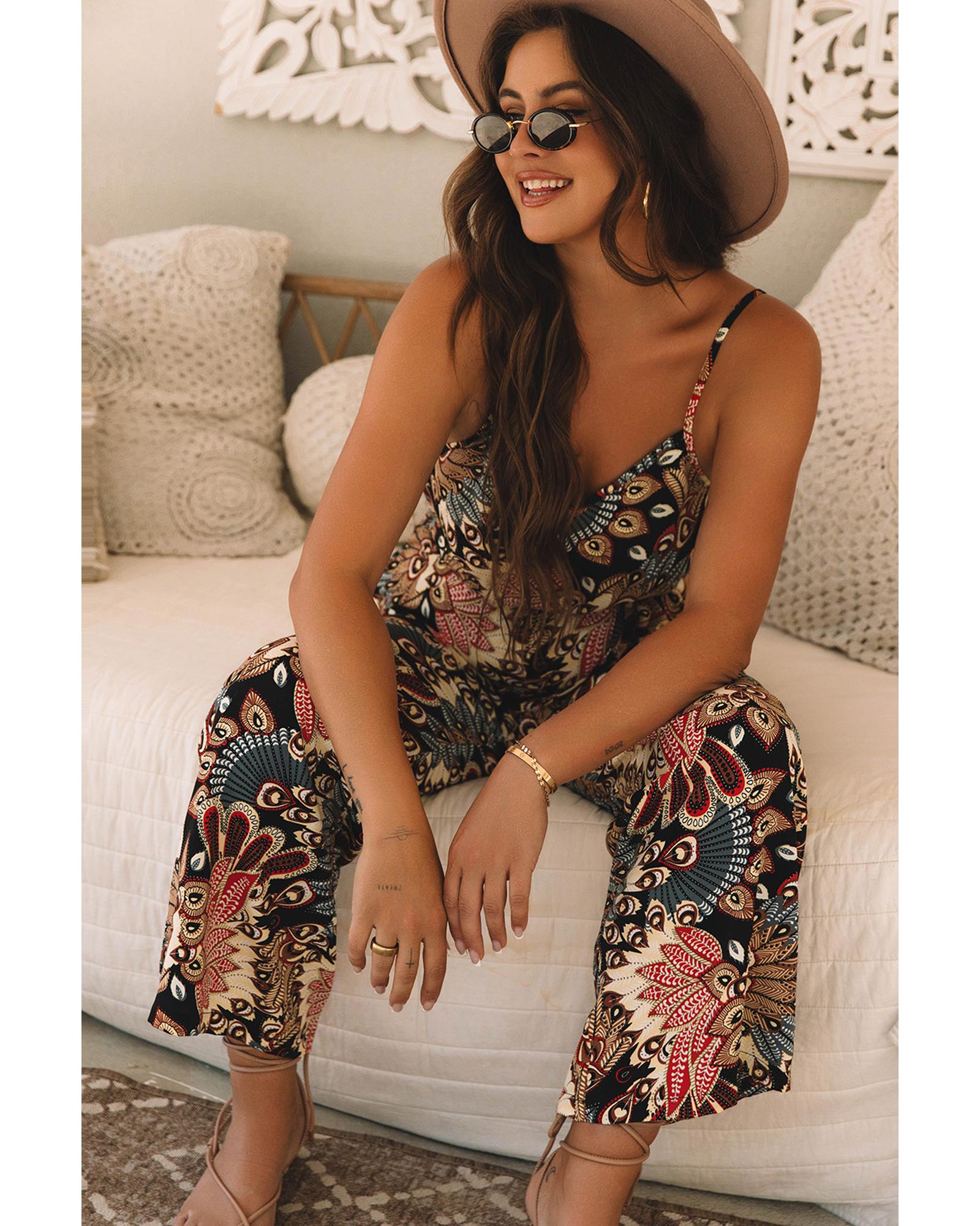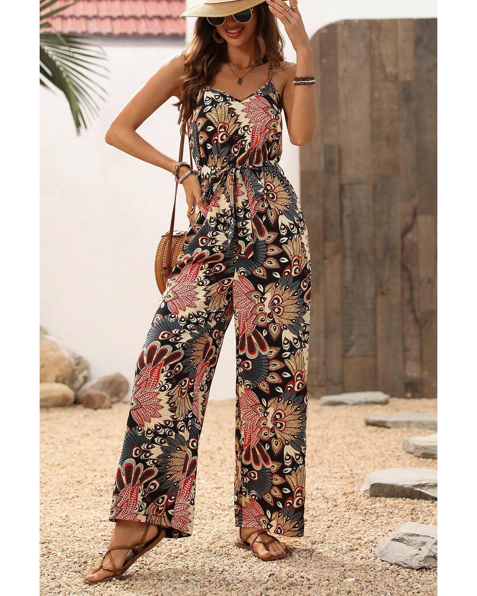 Black Floral Print Belted Sleeveless Wide Leg Jumpsuit – L