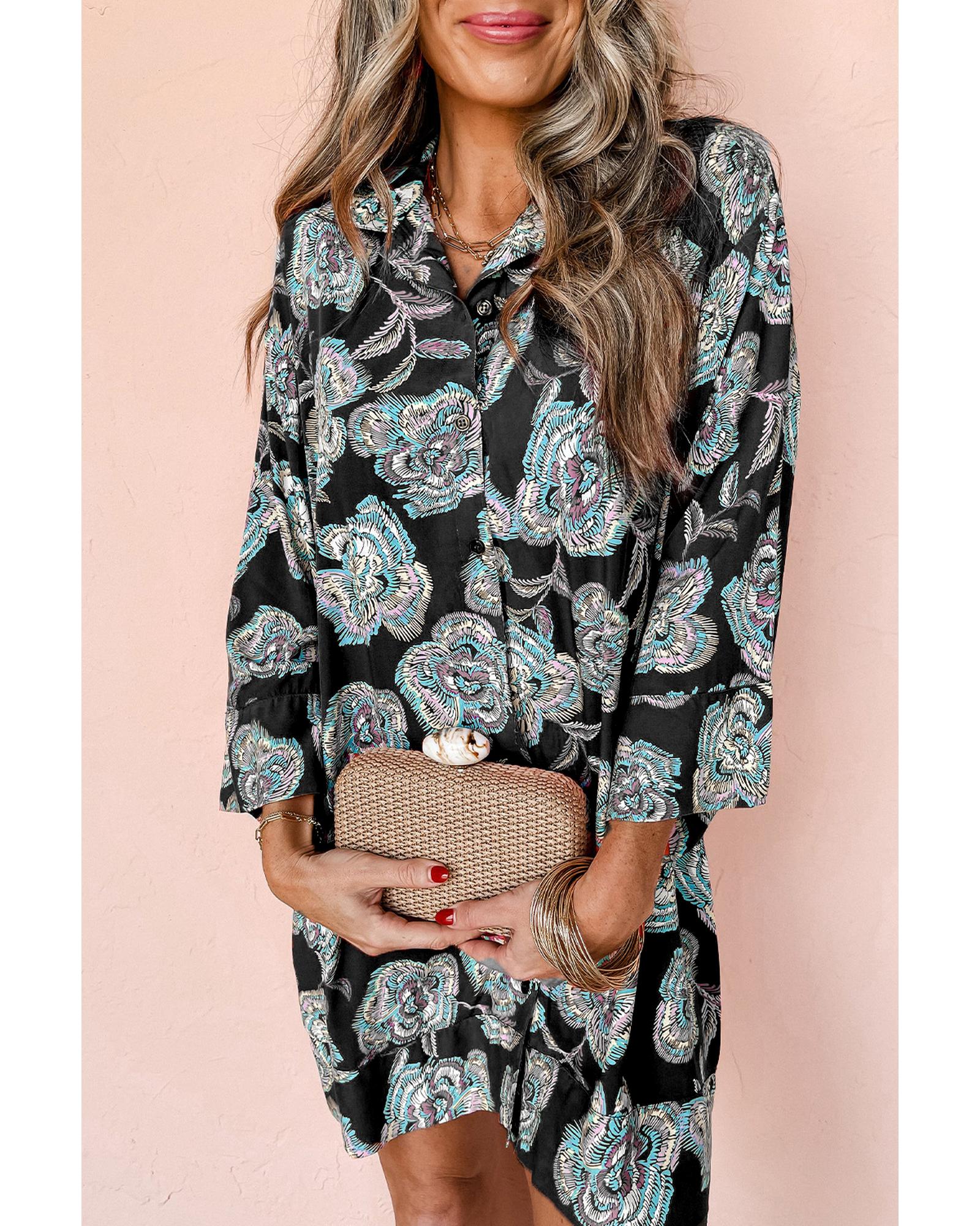 Black Floral Print Lapel Collar Loose Shirt Mini Dress – M