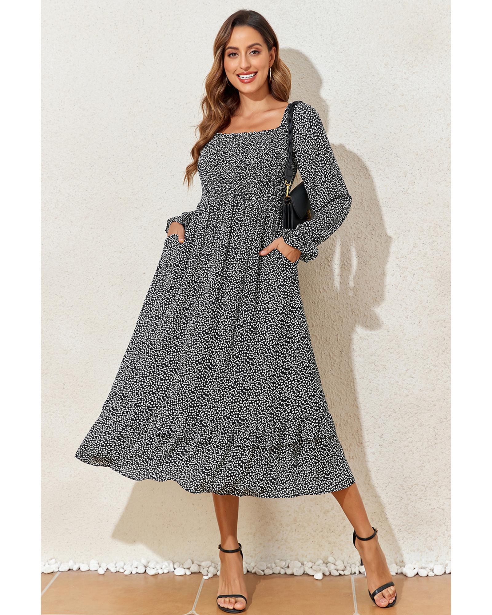 - Black floral printed long sleeve square neck midi dress