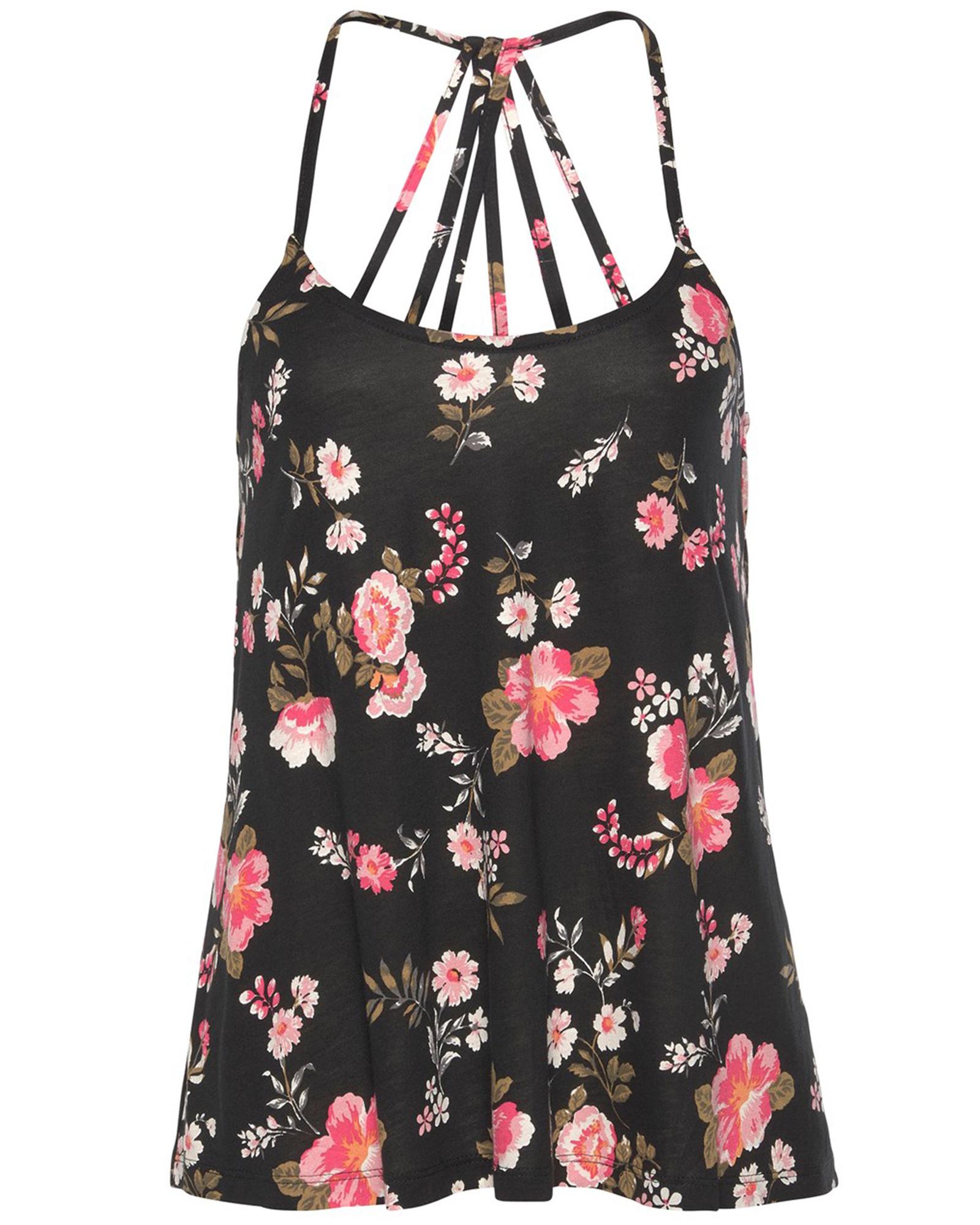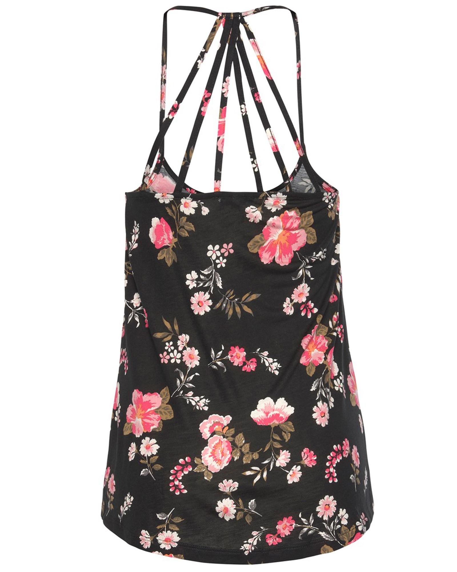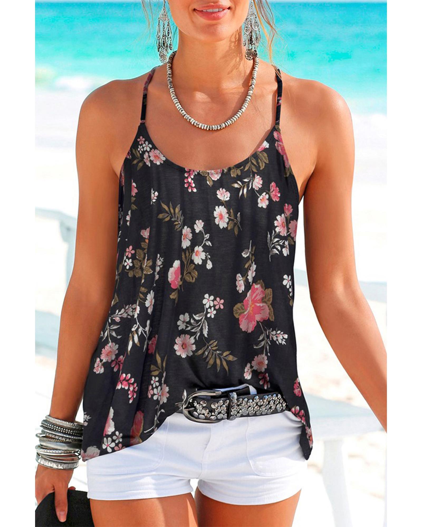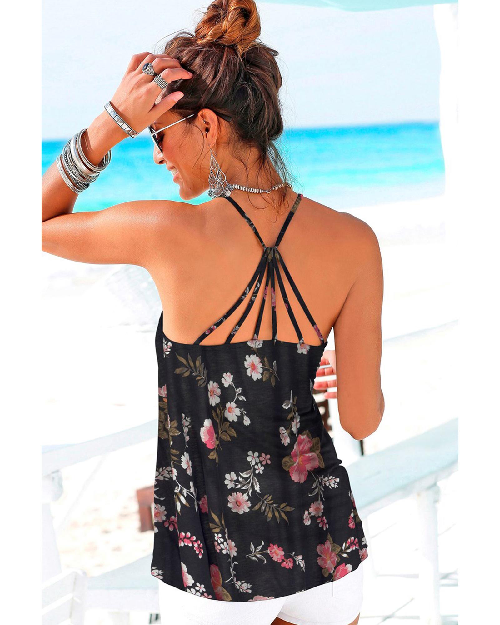 - Black floral tank top with spaghetti straps design