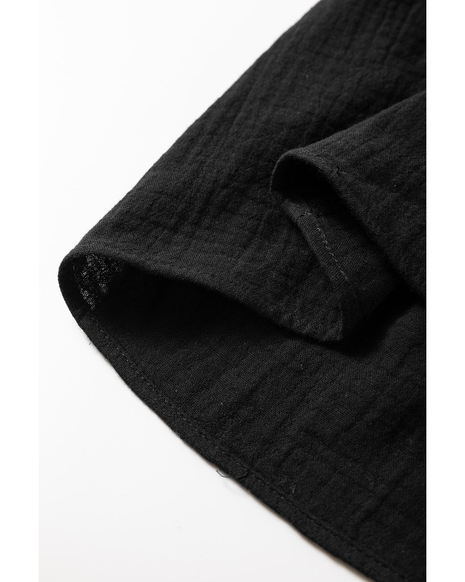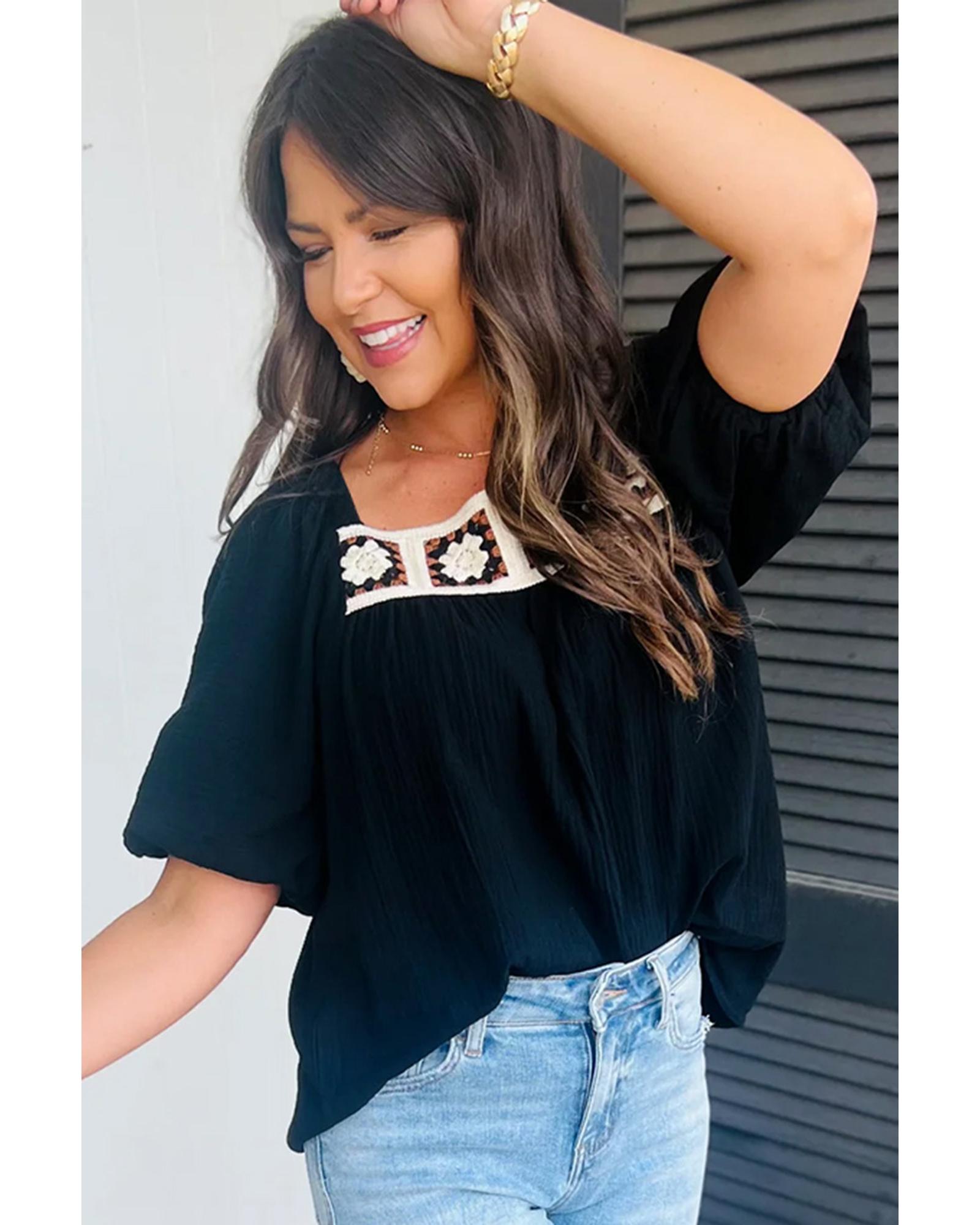 Black Flower Crochet Square Neck Textured Short Sleeve Blouse – L