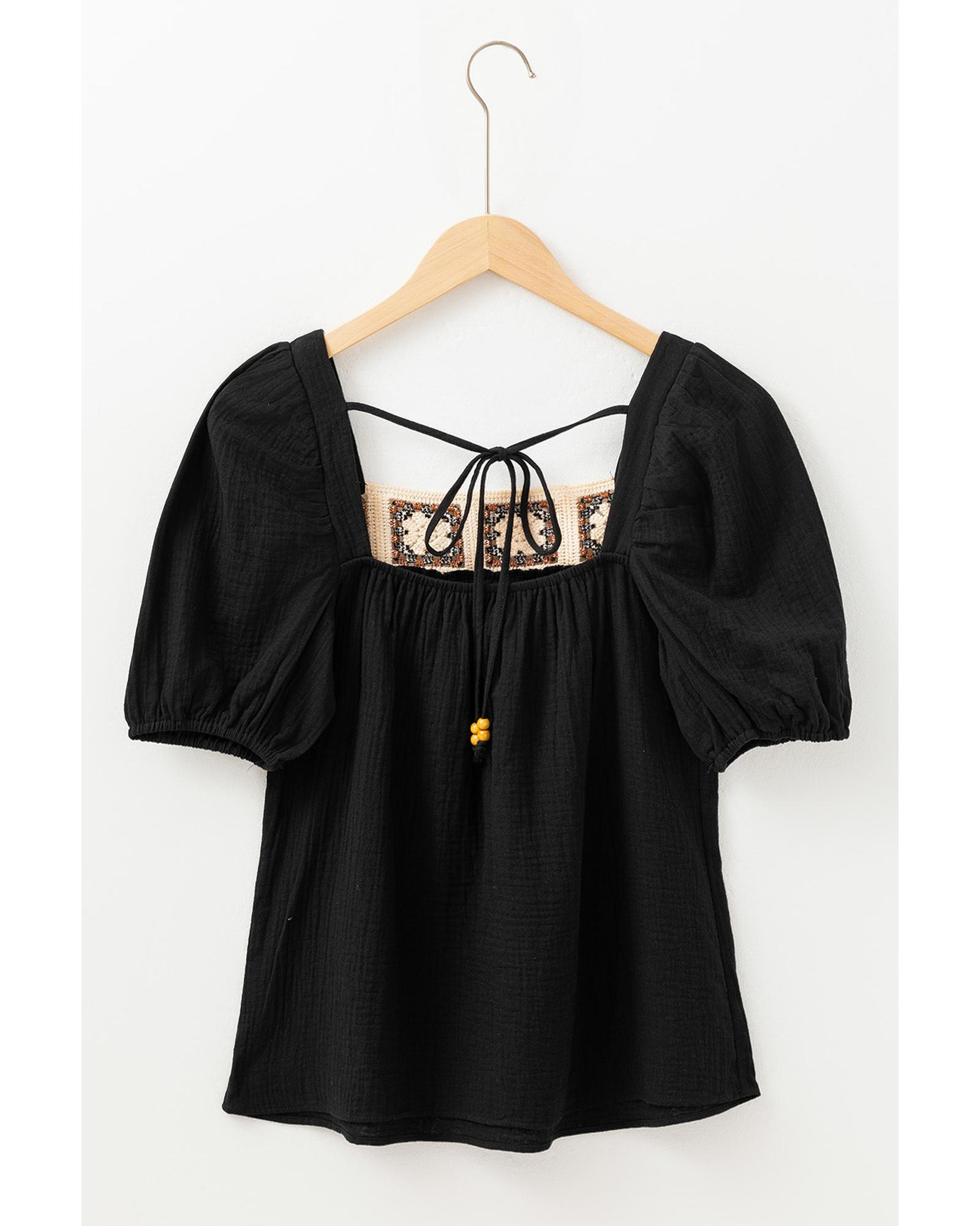 Black Flower Crochet Square Neck Textured Short Sleeve Blouse – XL