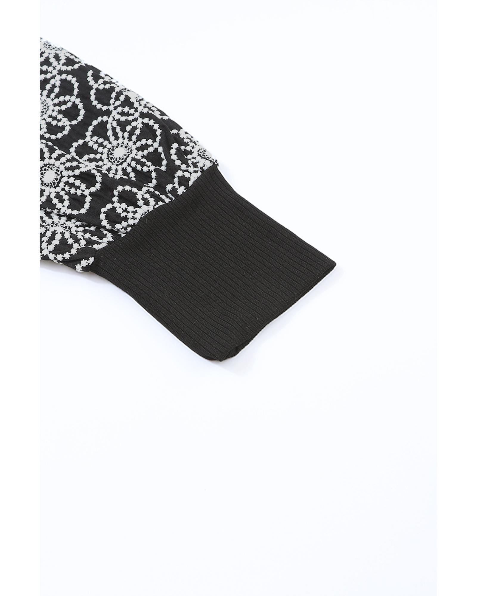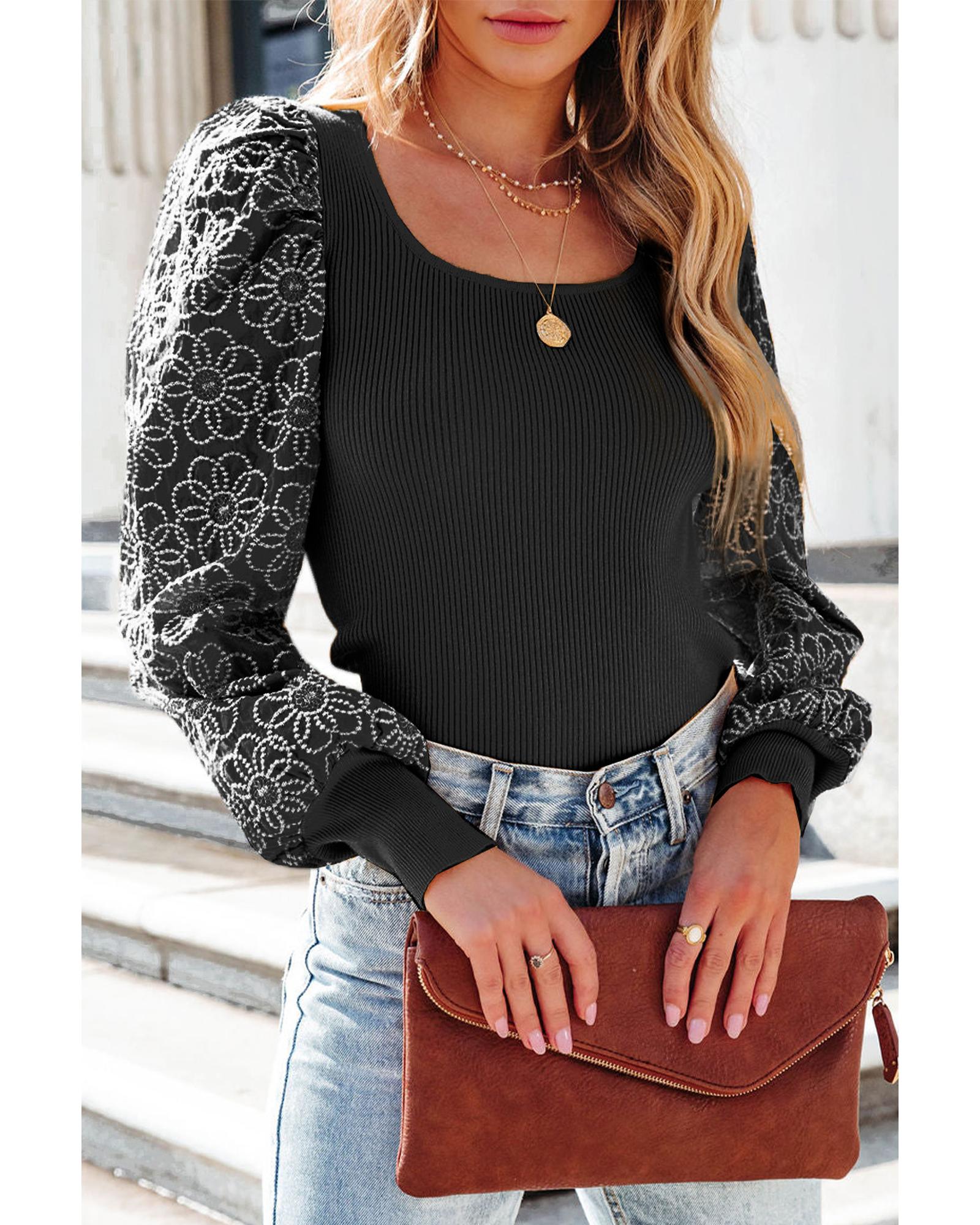 Black Flower Puff Sleeve Ribbed Knit Top – M