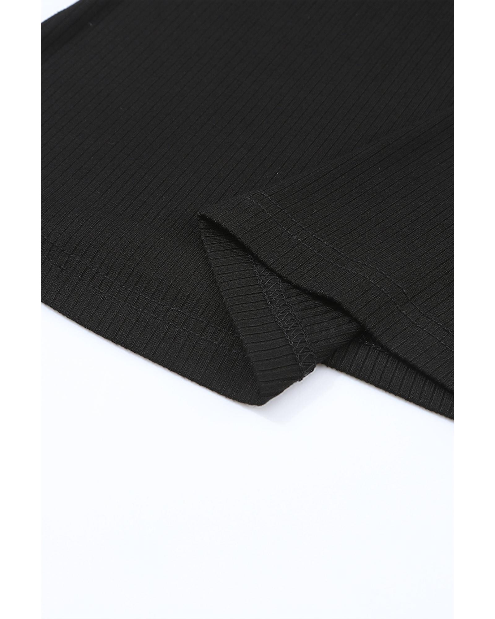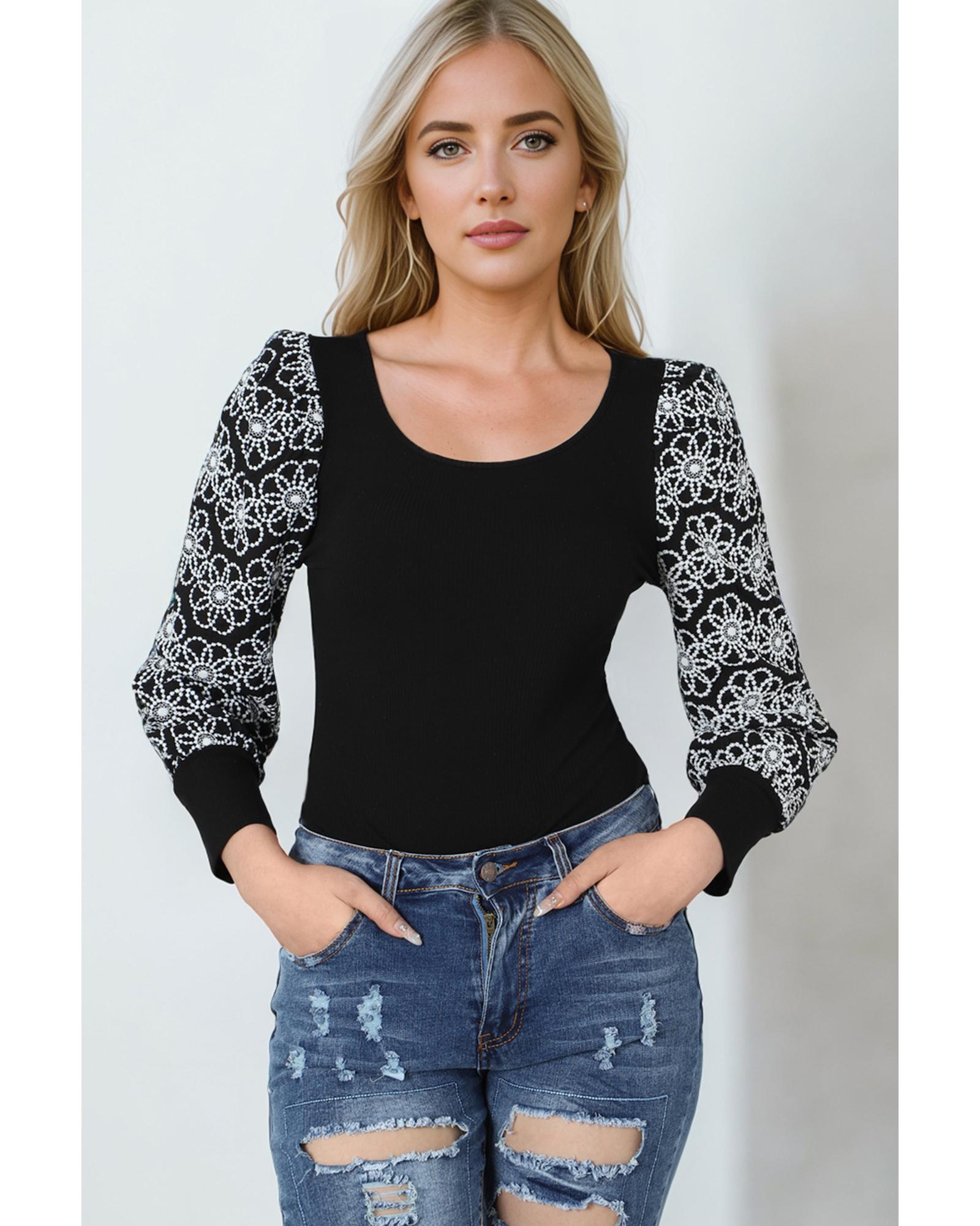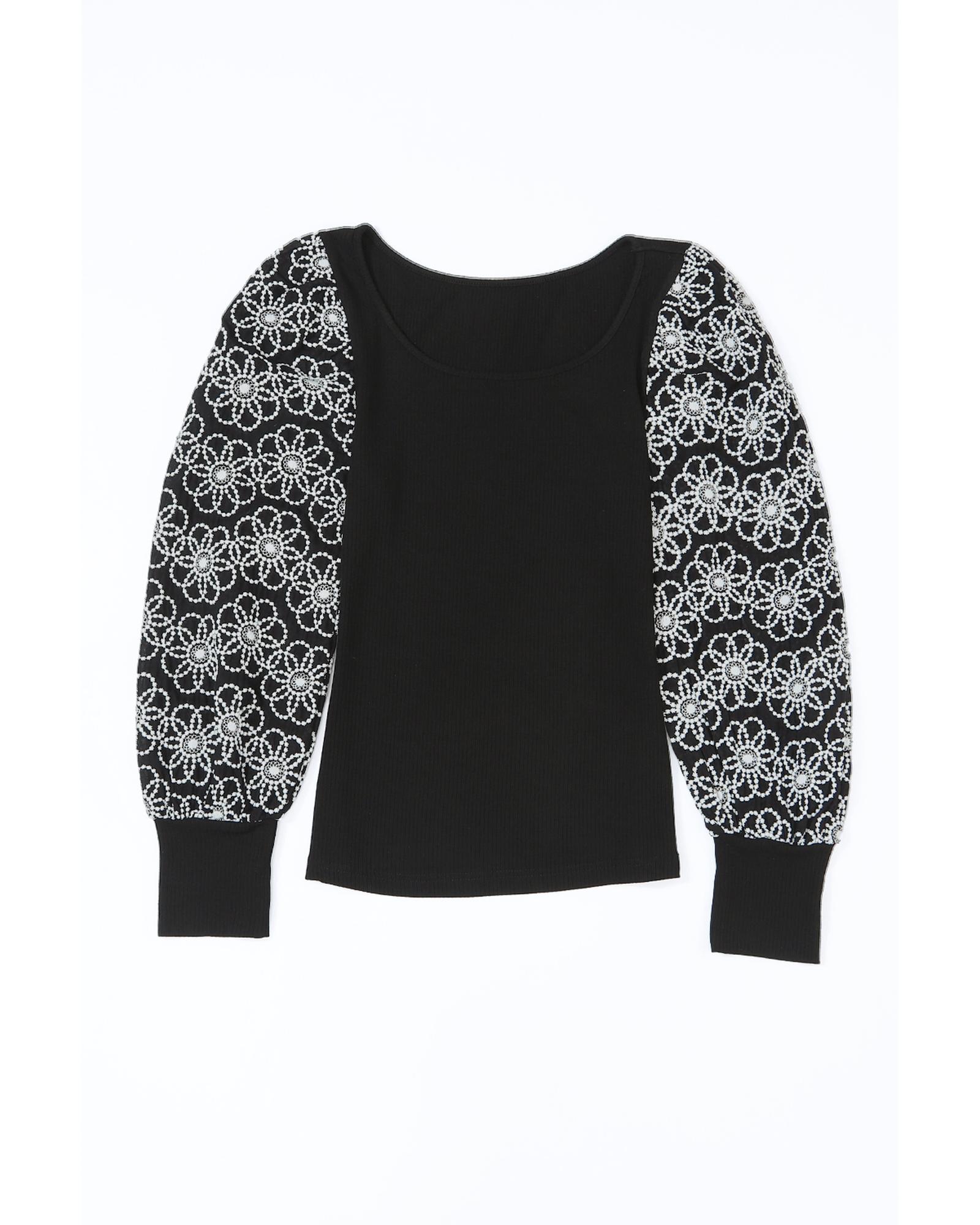 Black Flower Puff Sleeve Ribbed Knit Top – S