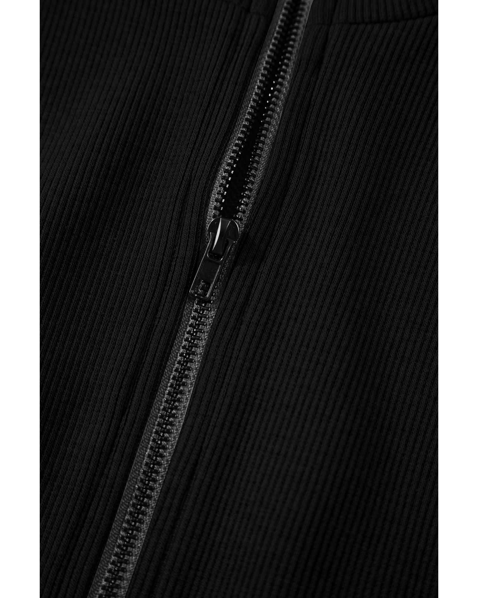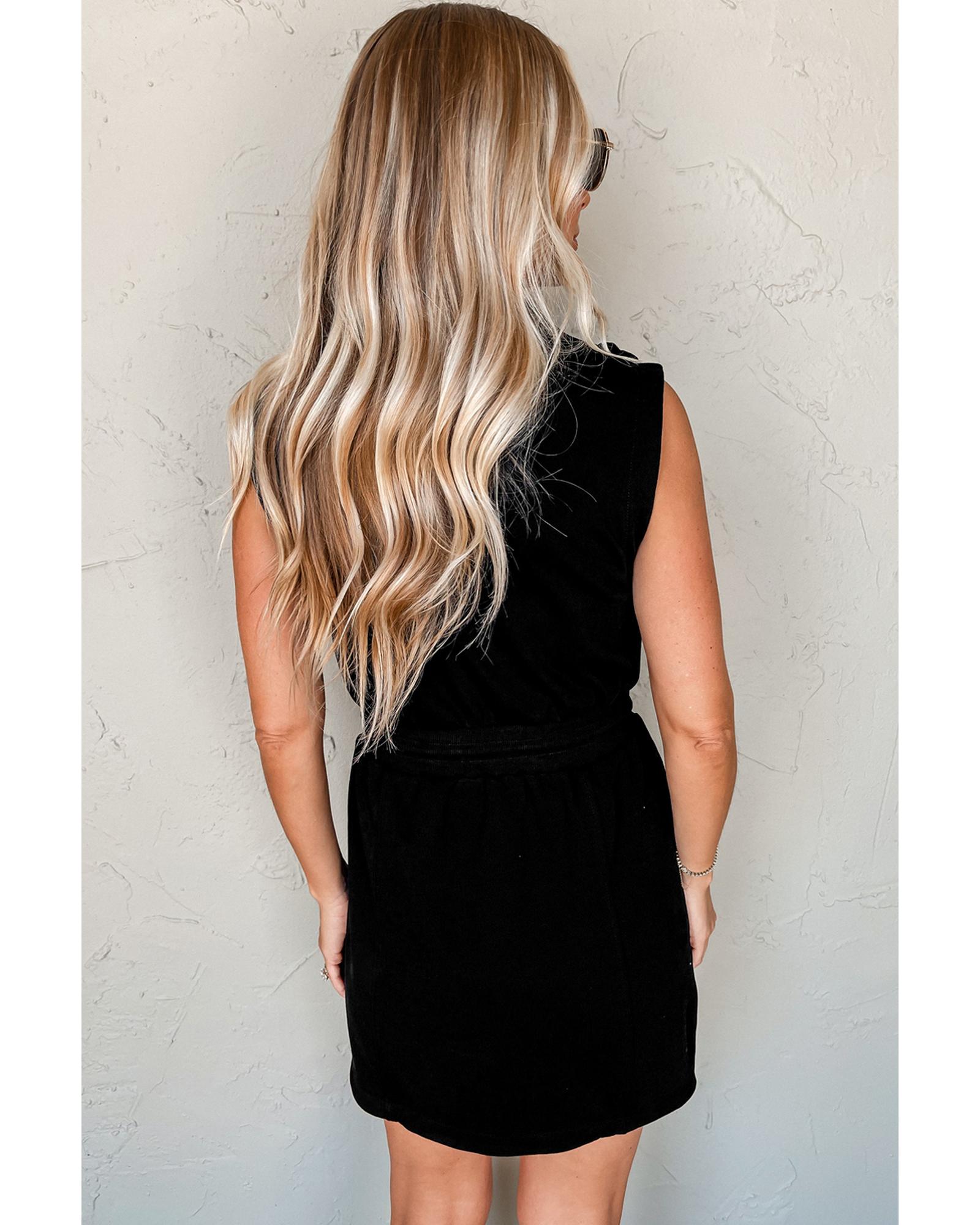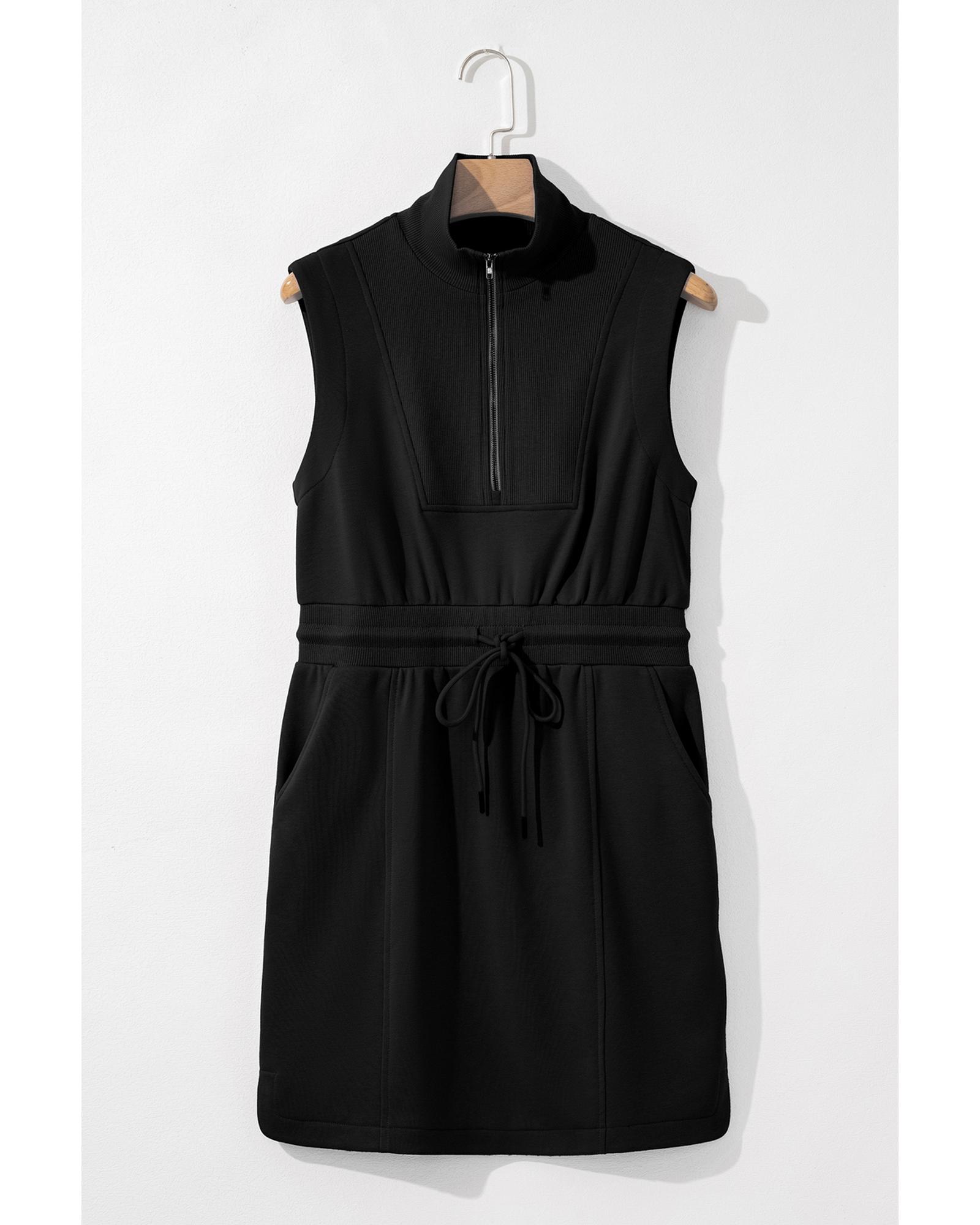 Black French Terry Zipped Collar Sleeveless Drawstring Waist Mini Dress – L
