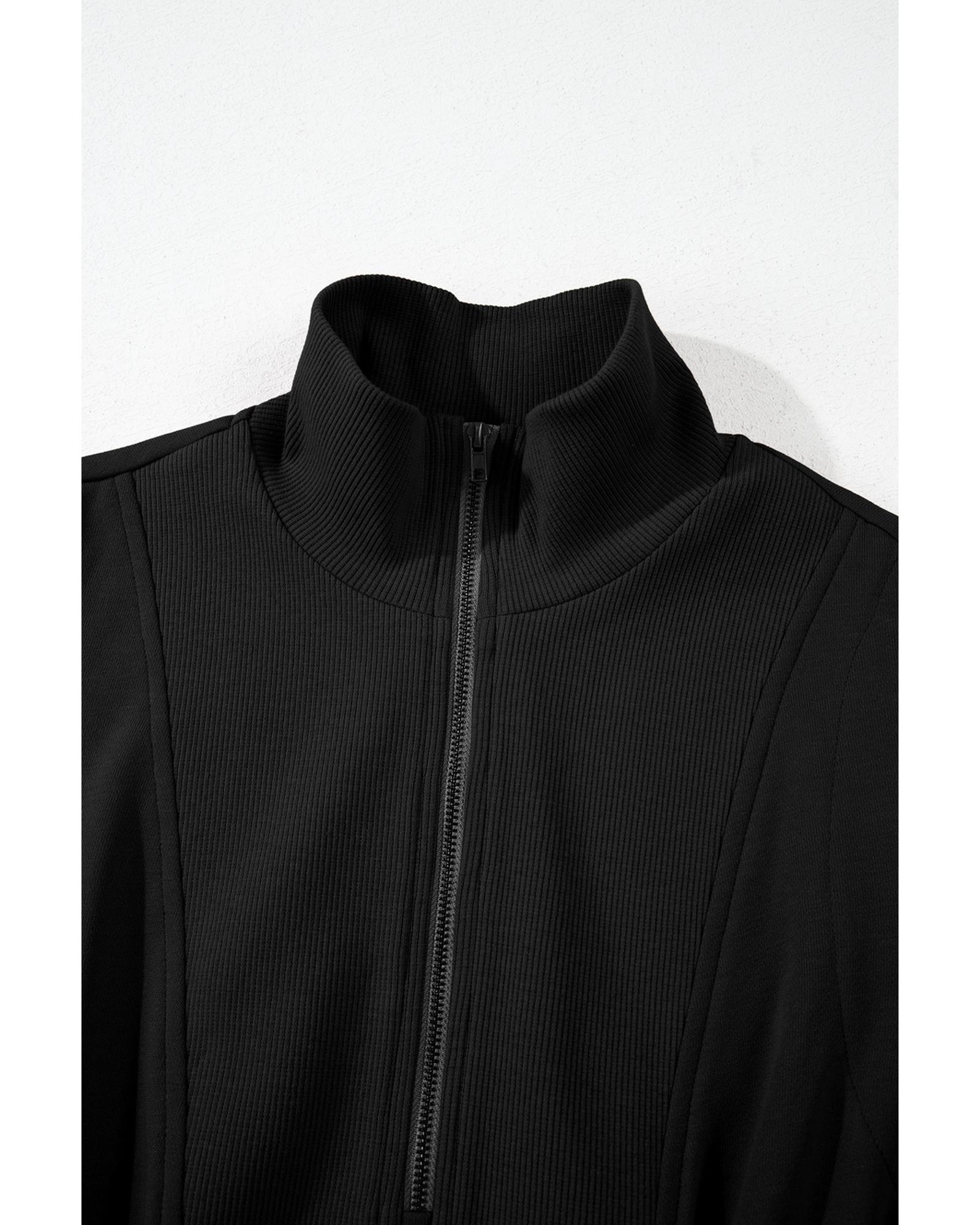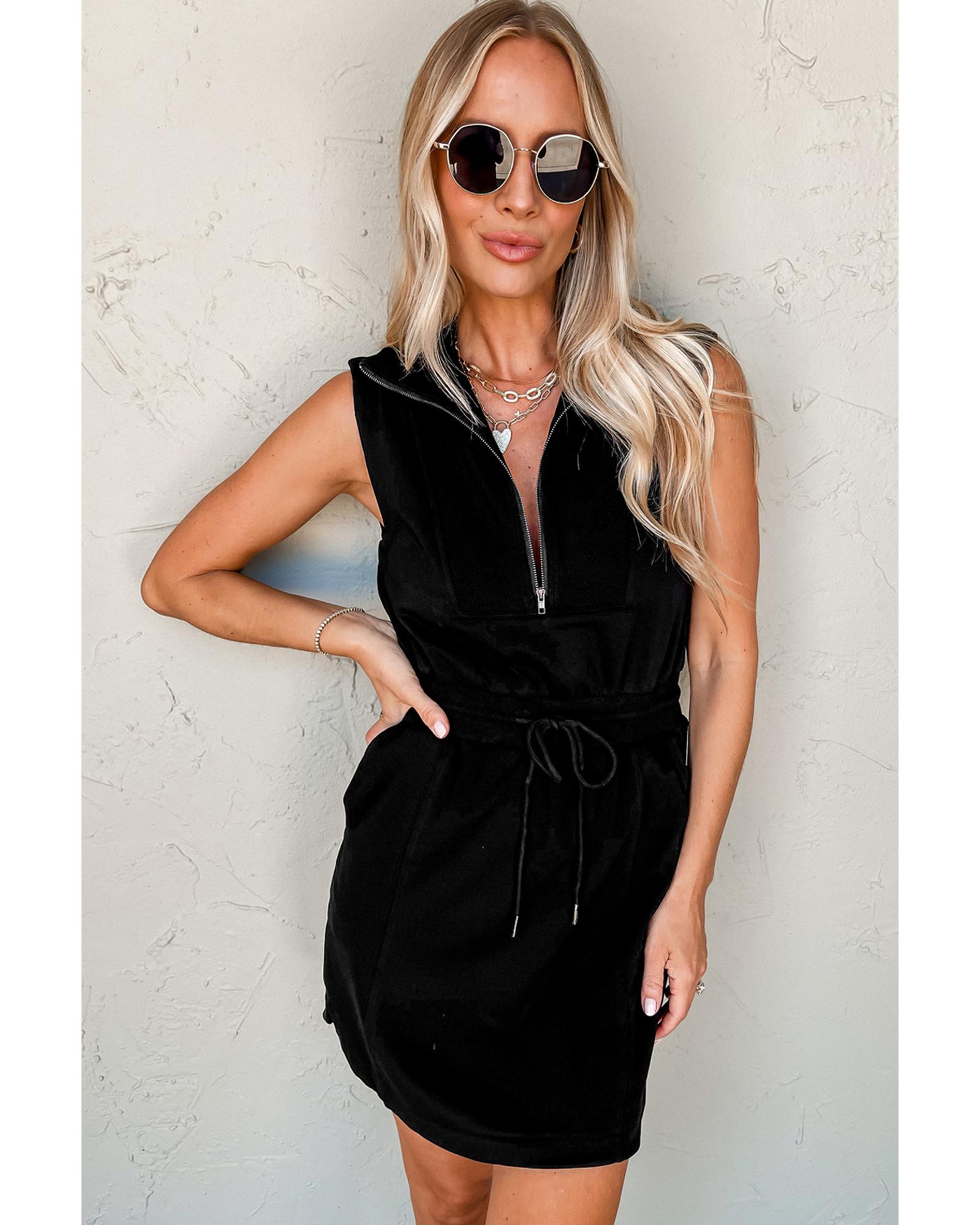 Black French Terry Zipped Collar Sleeveless Drawstring Waist Mini Dress – S