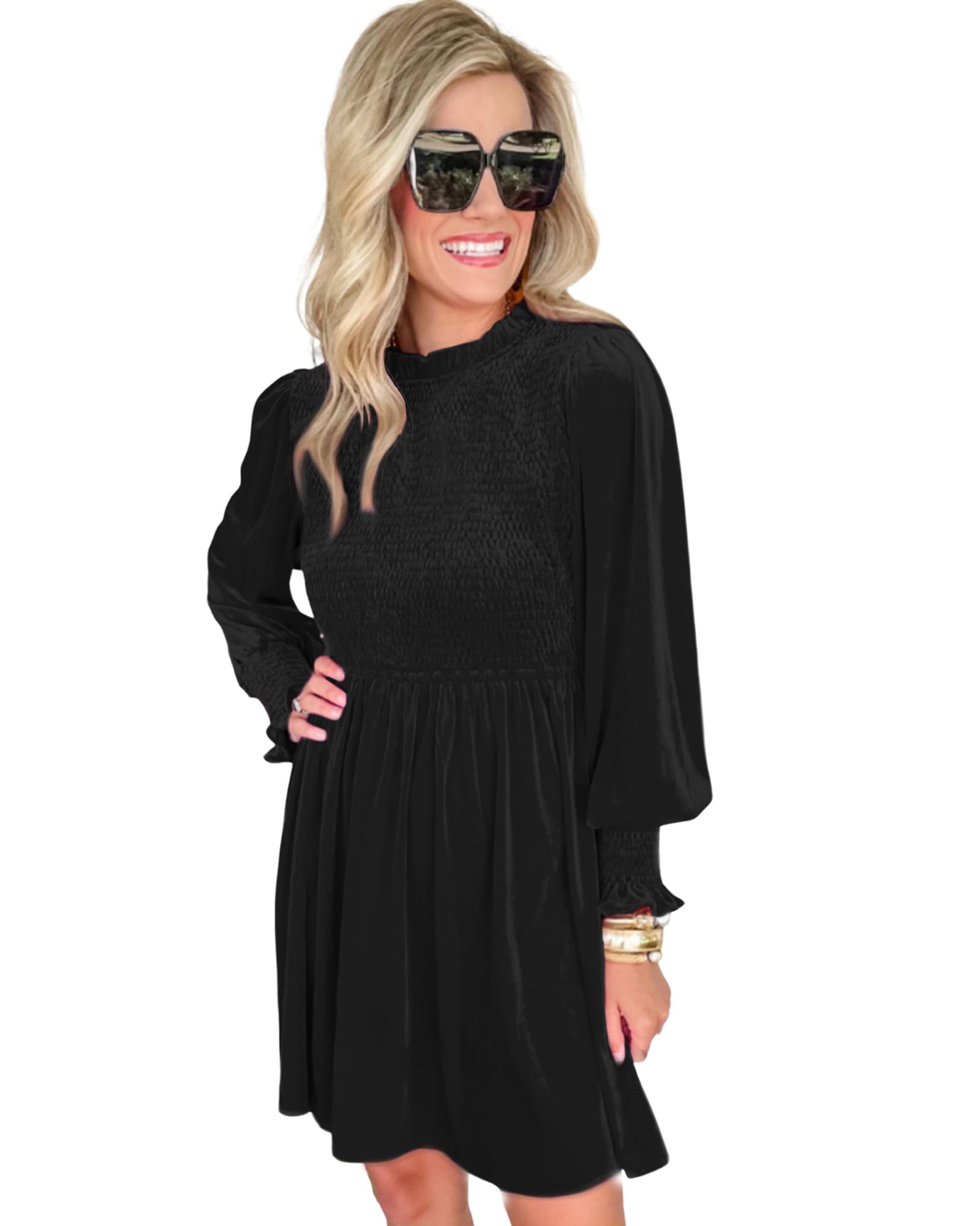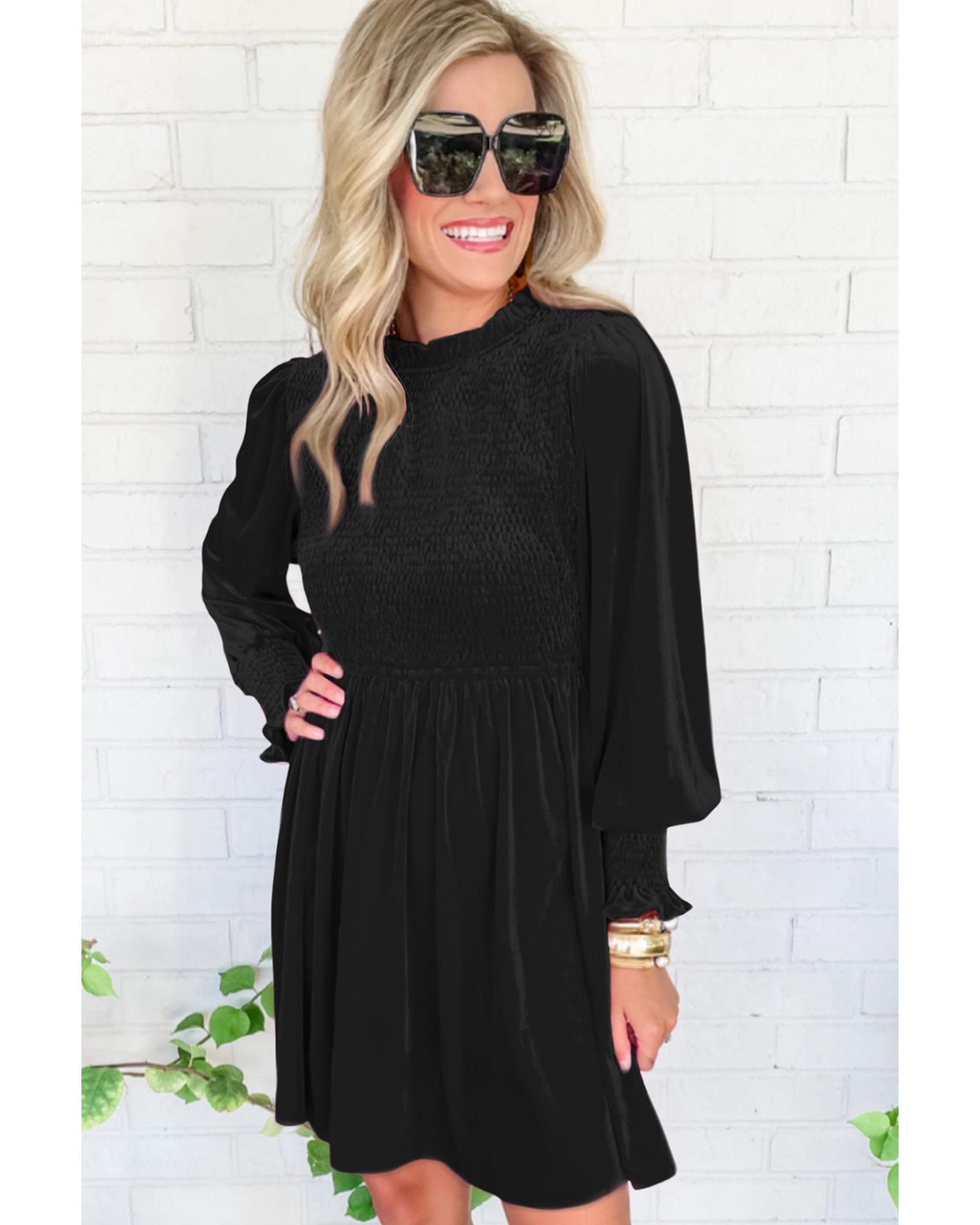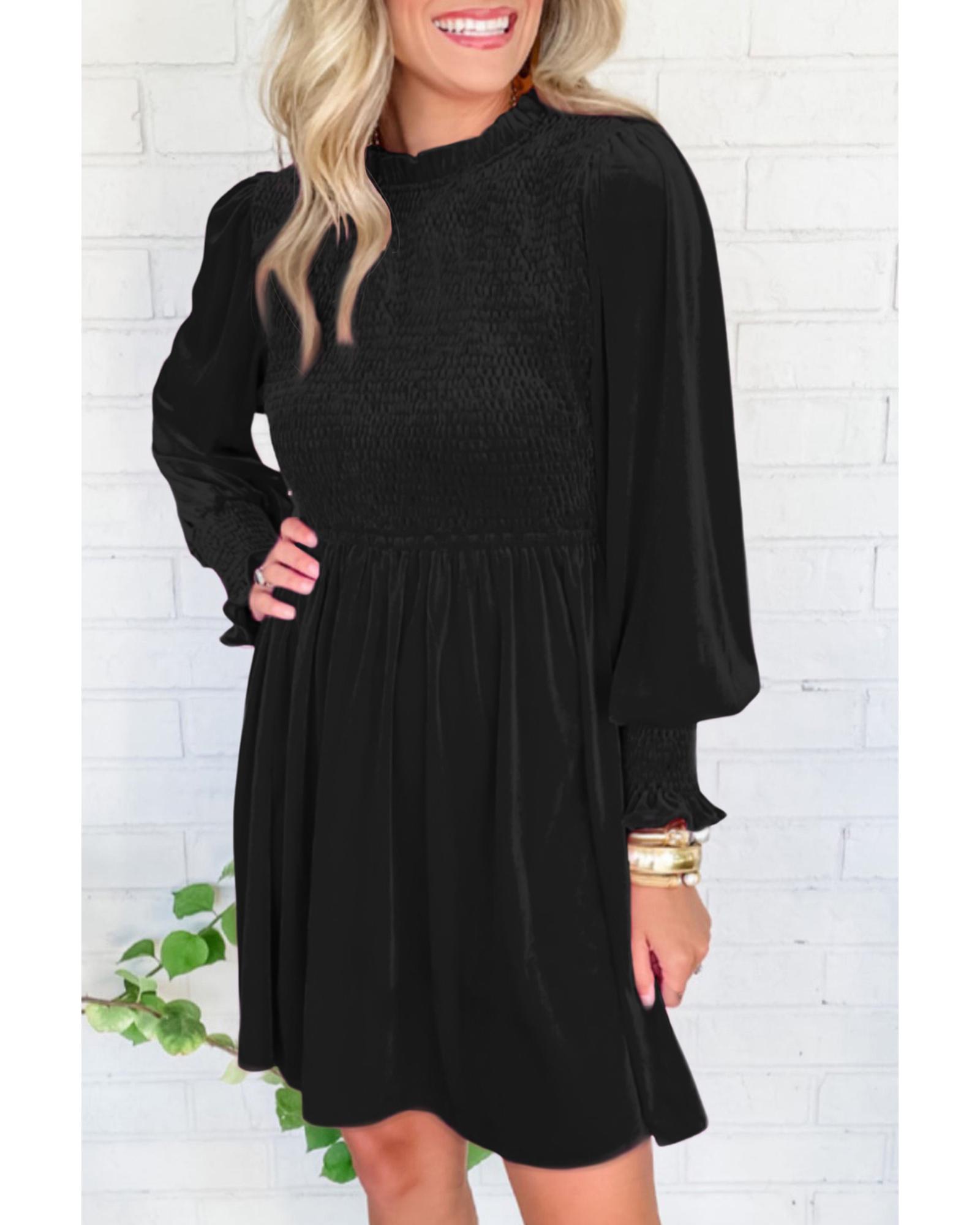 Black Frilled Neck Smocked Bodice Velvet Dress – L
