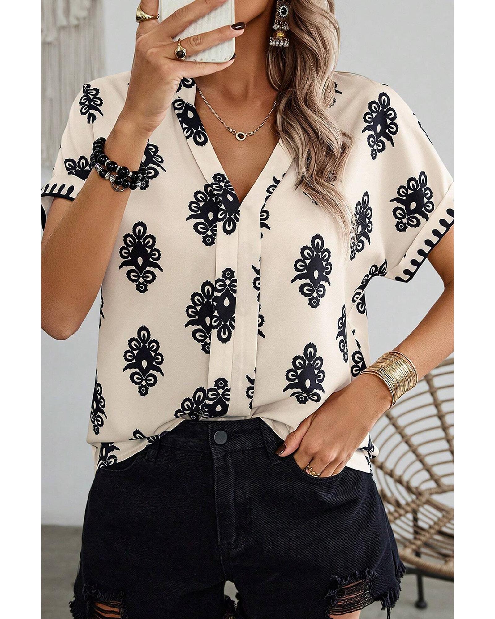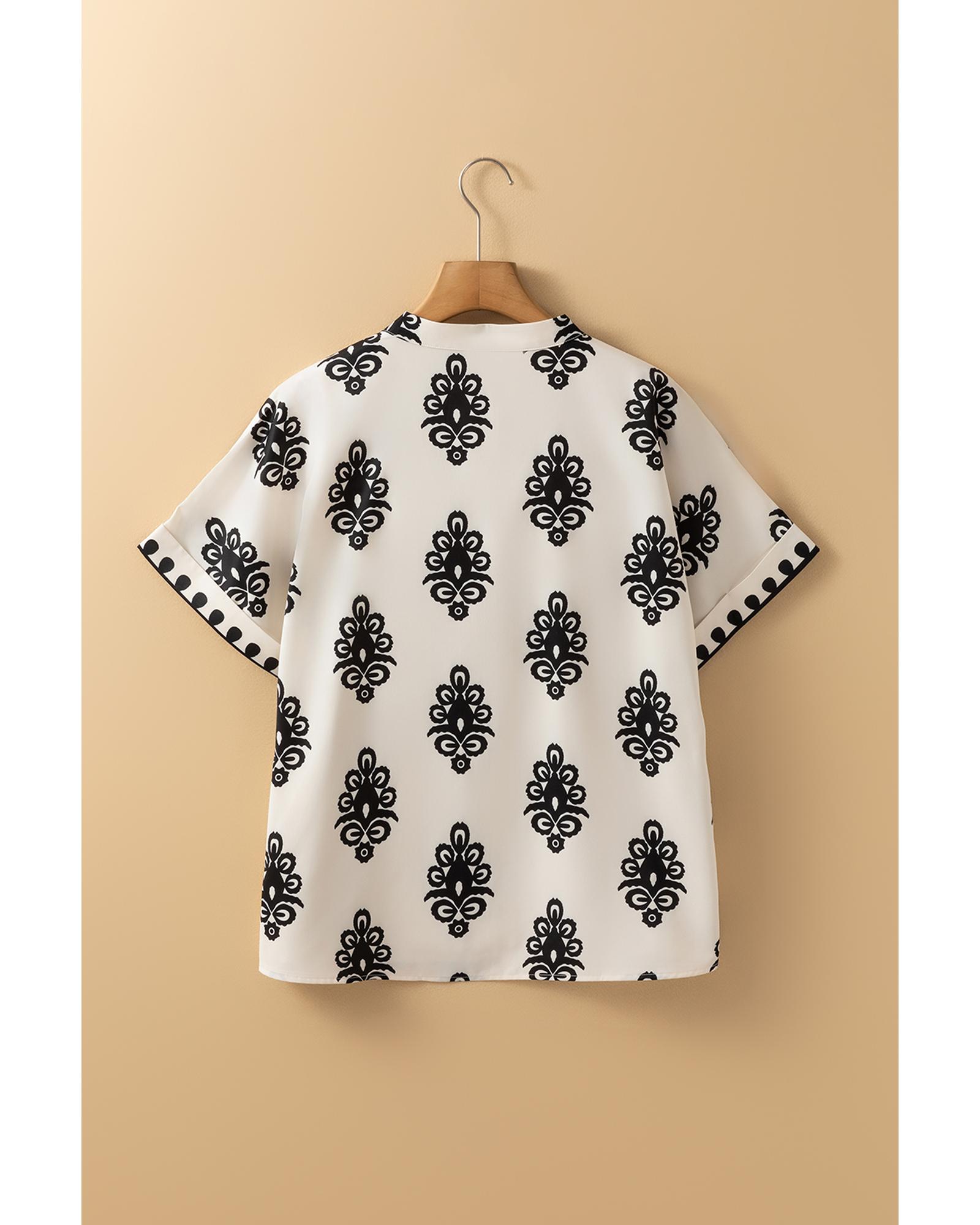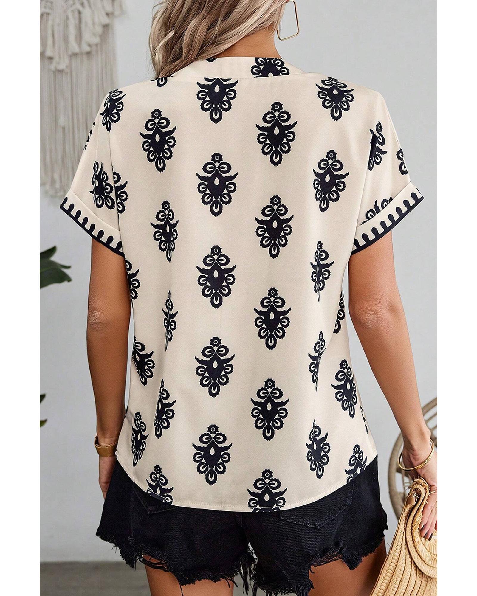 Black Geometric Print Short Sleeve V Neck Blouse – S