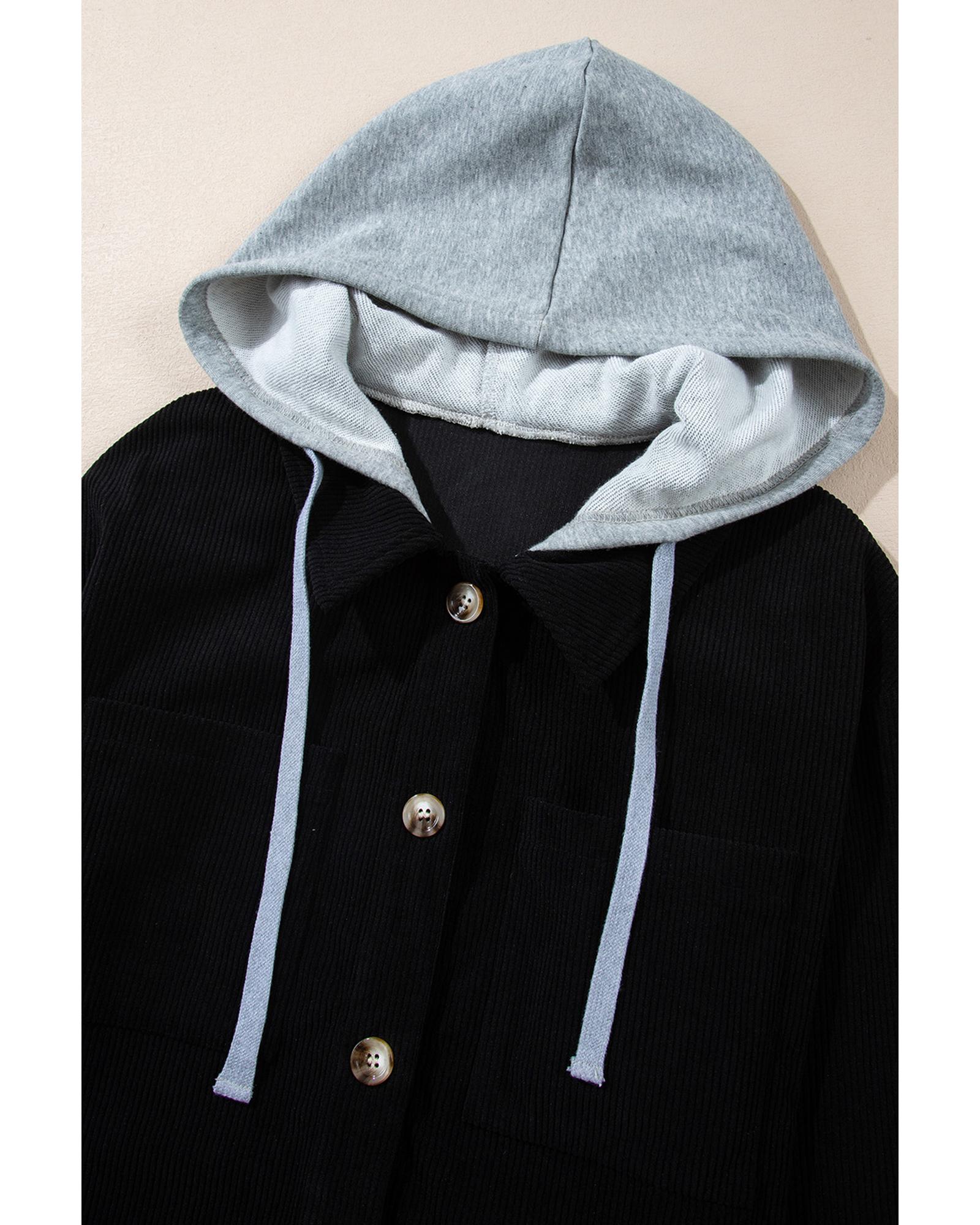 Black Hooded Drawstring Pockets Corduroy Shacket – M