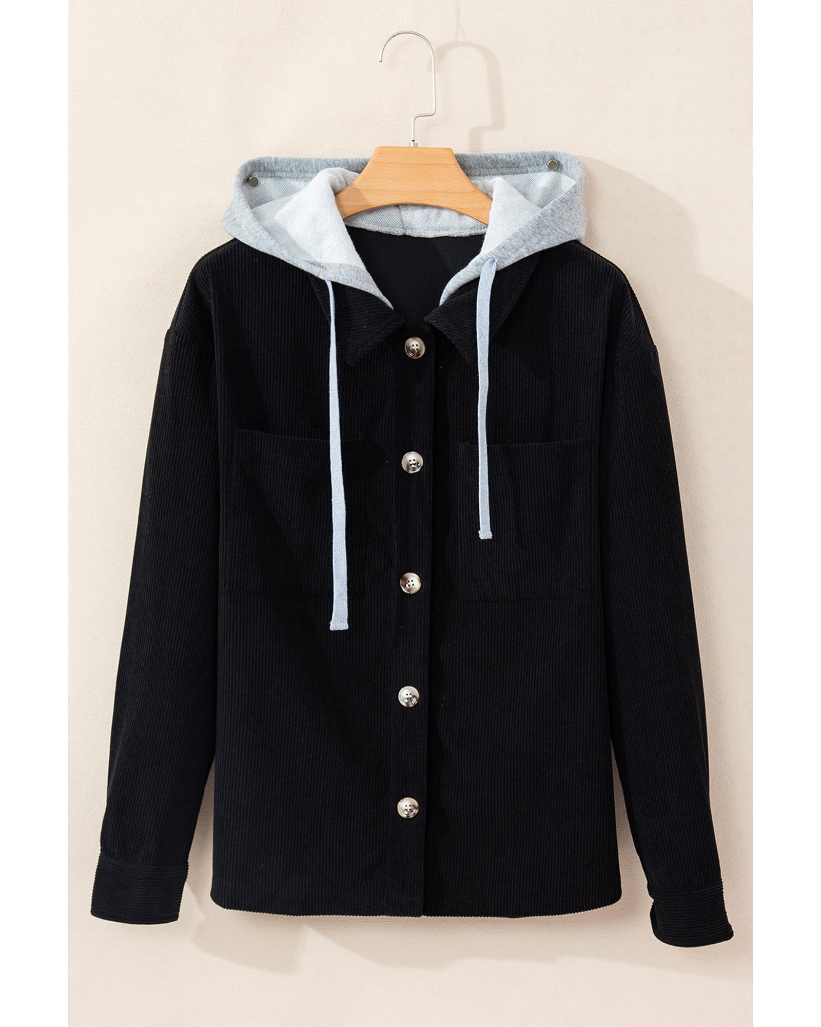 Black Hooded Drawstring Pockets Corduroy Shacket – S