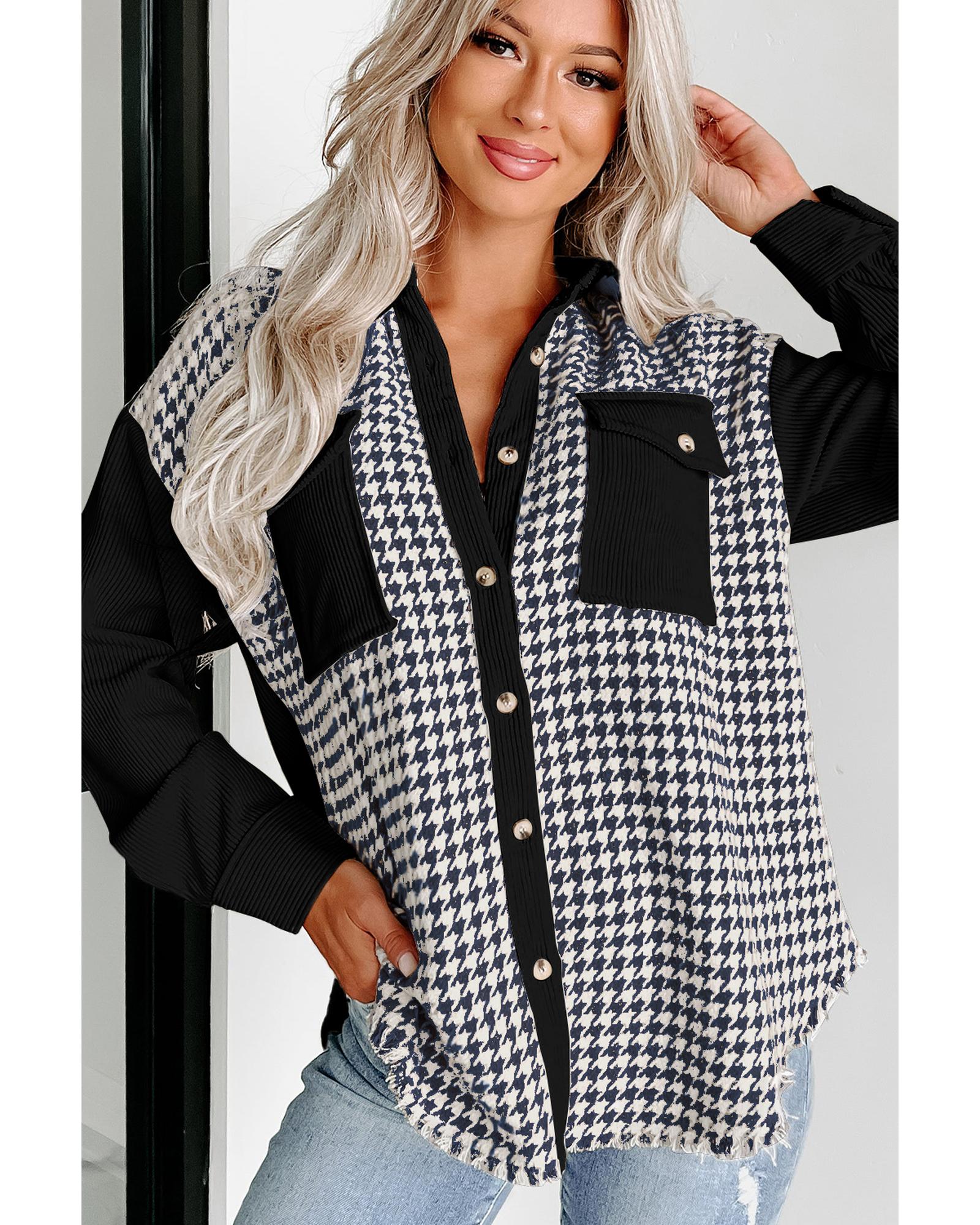 Black Houndstooth Corduroy Patchwork Flap Pocket Shacket – S