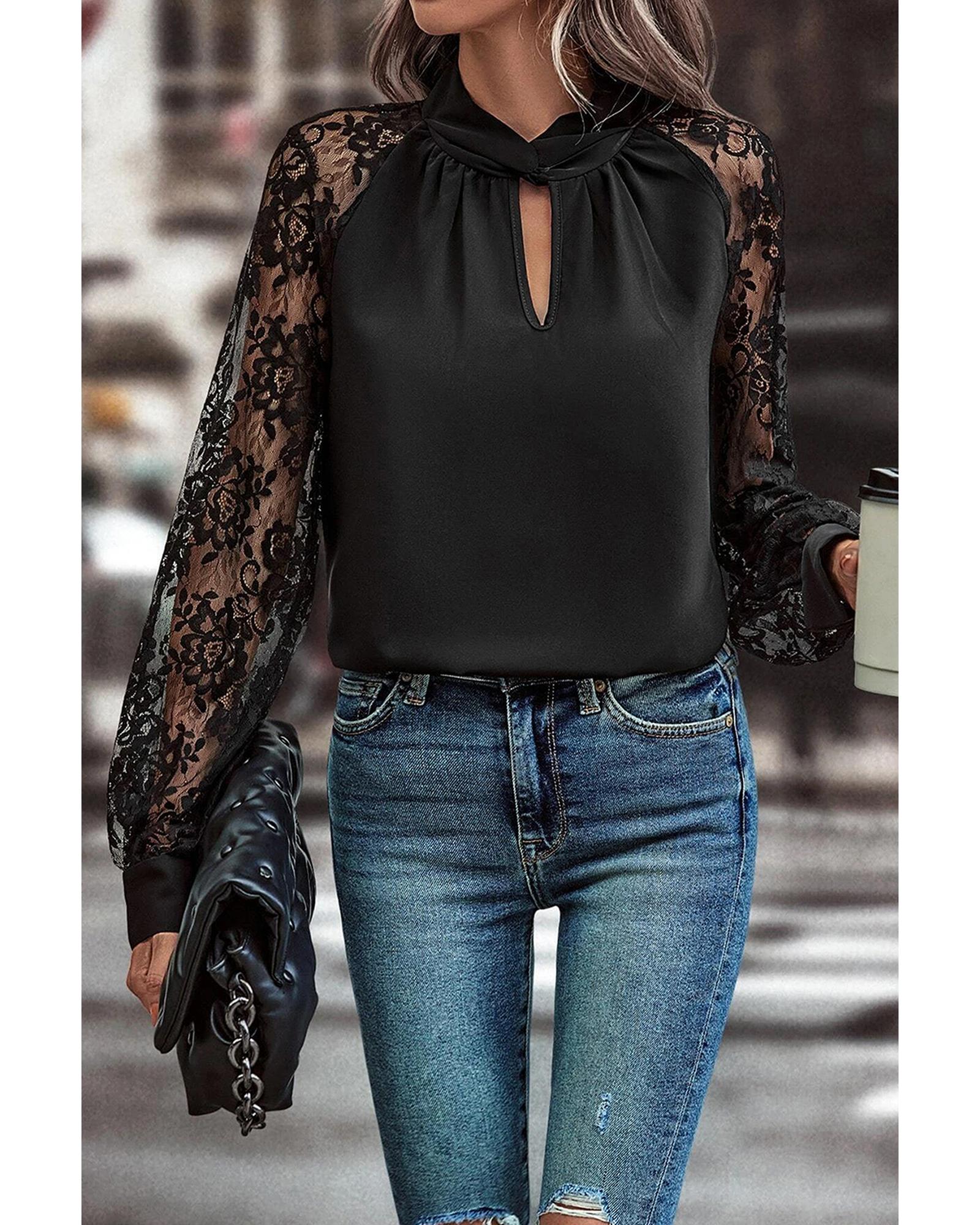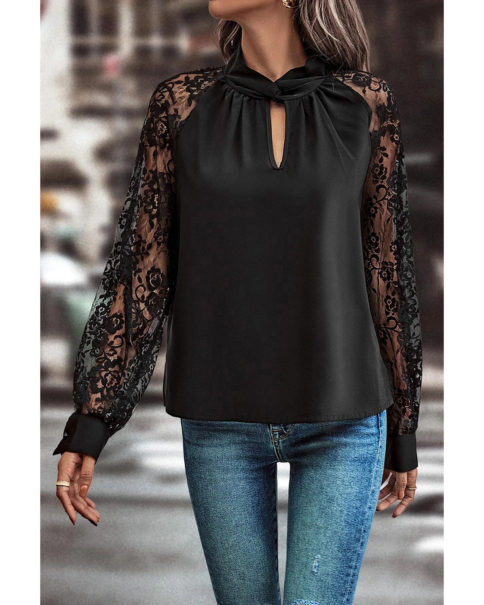 - Black Keyhole Neckline Floral Lace Raglan Sleeve Blouse