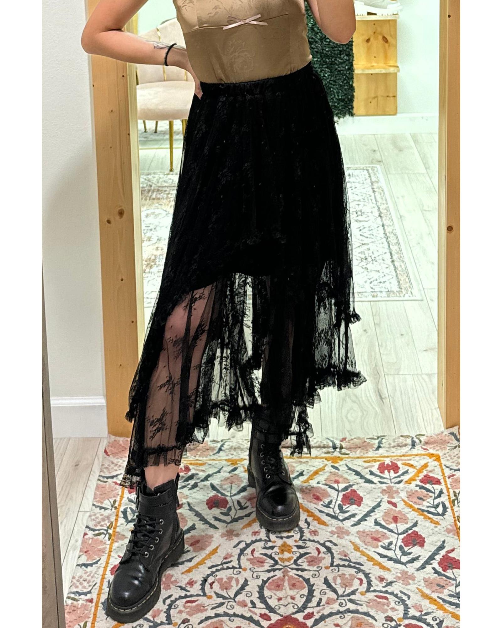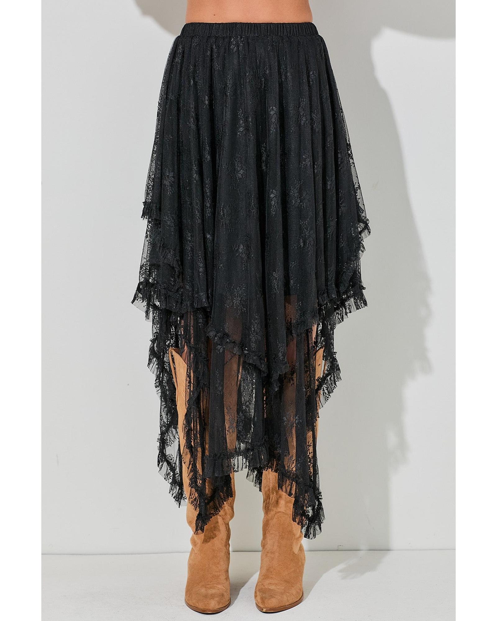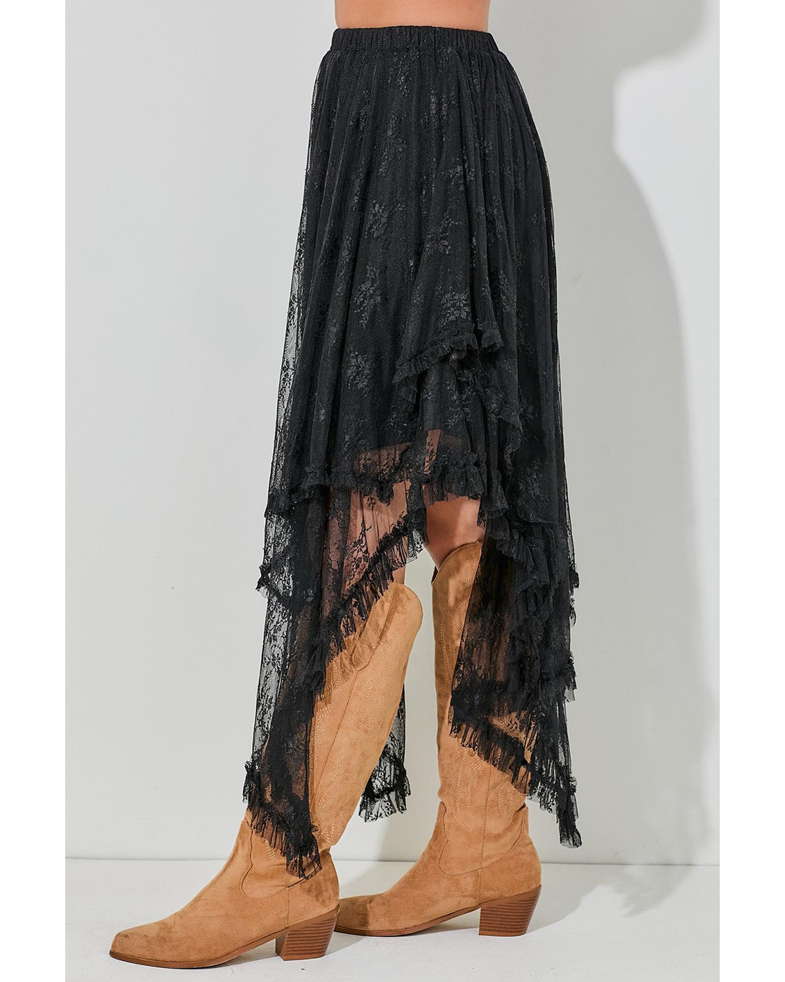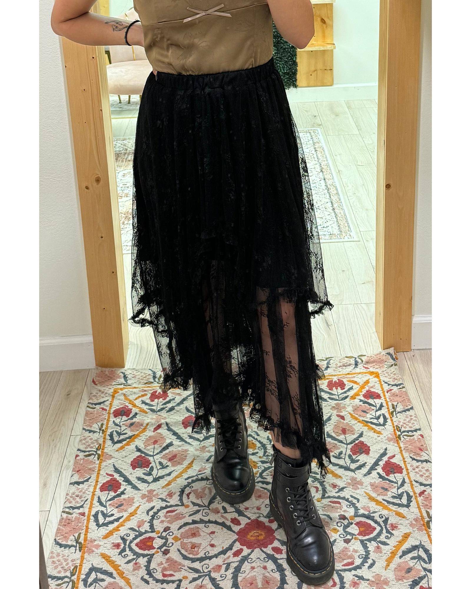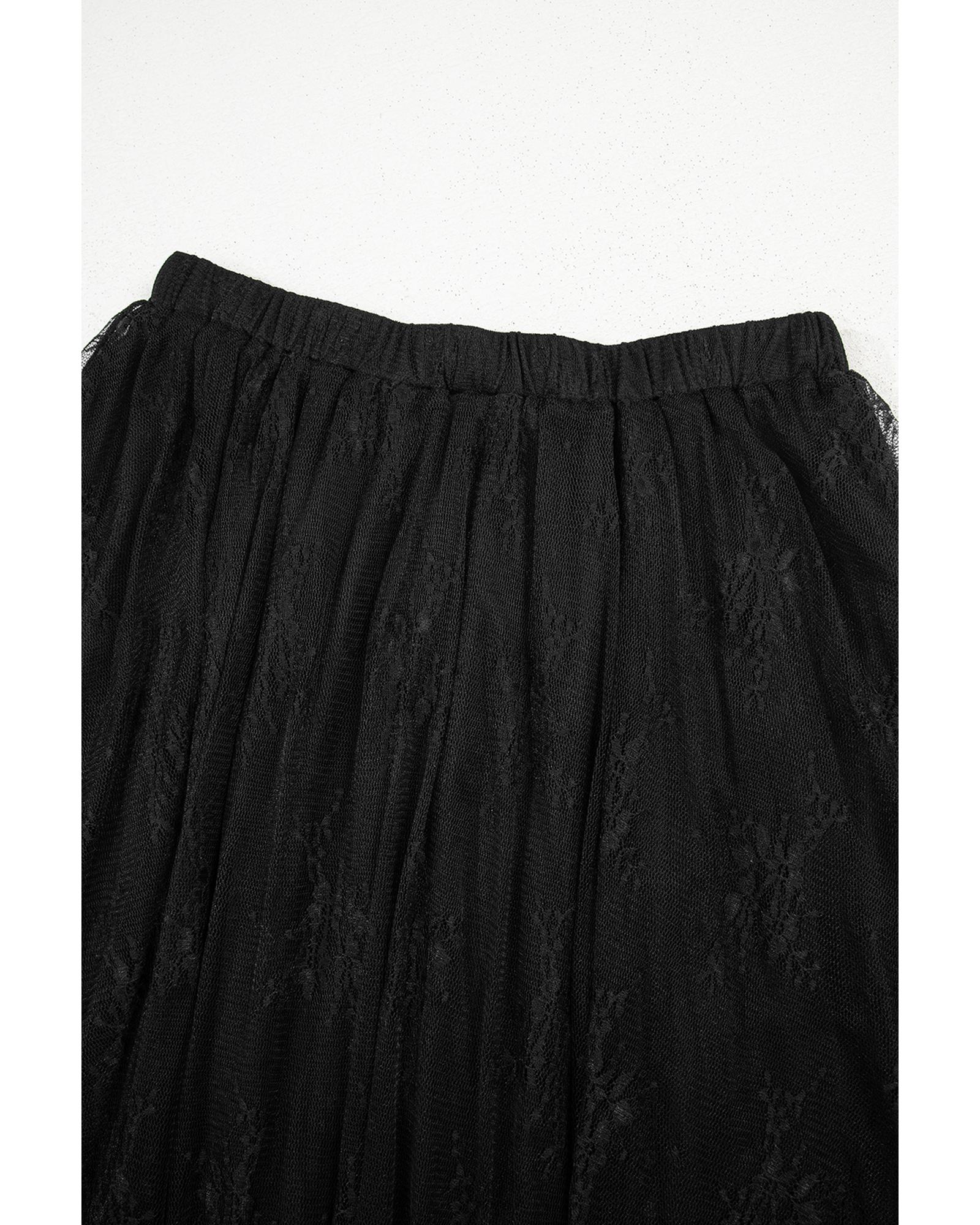 Black Lace Cascading Tiered High Waist Maxi Skirt – M