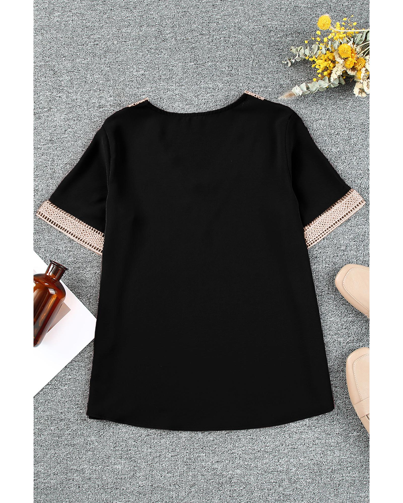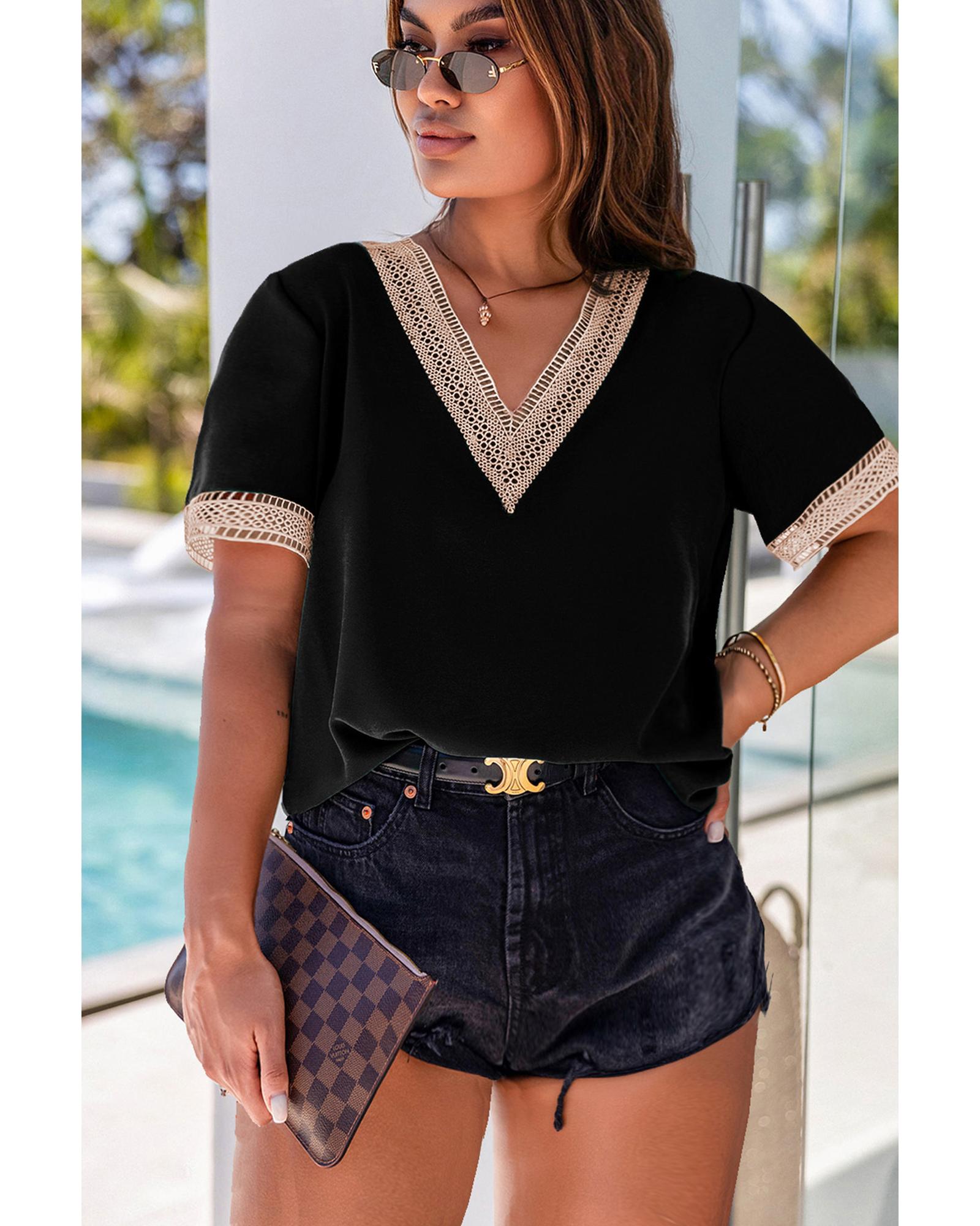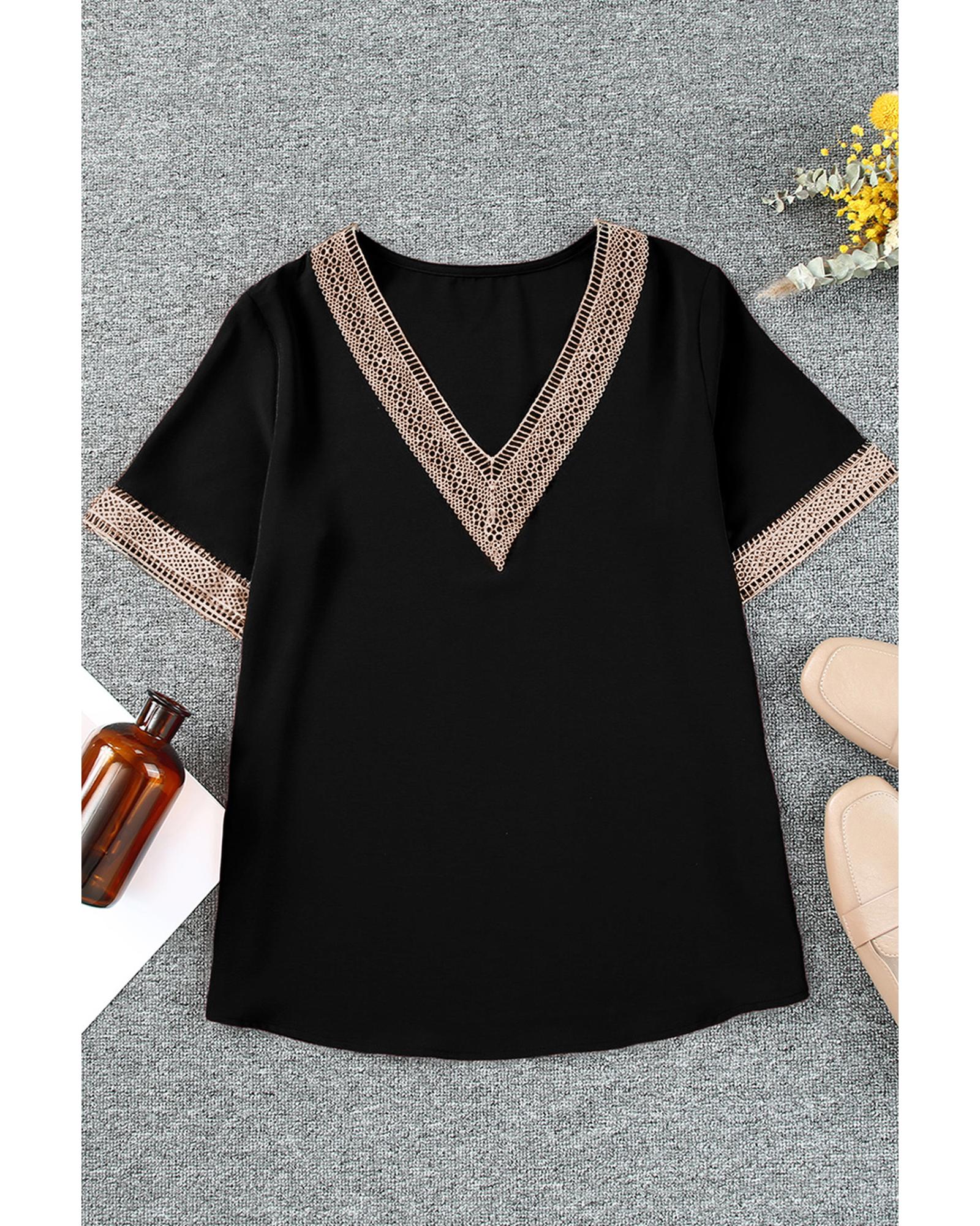 Black Lace Trim Short Sleeve V Neck Plus Size Top – 2X