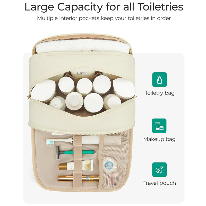 • Large Capacity with Wide Opening: Measures 30cm x 20cm x 13cm, spacious enough to hold all your travel-sized toiletries, cosmetics, and makeup tools with a fully open back pocket for easy access.