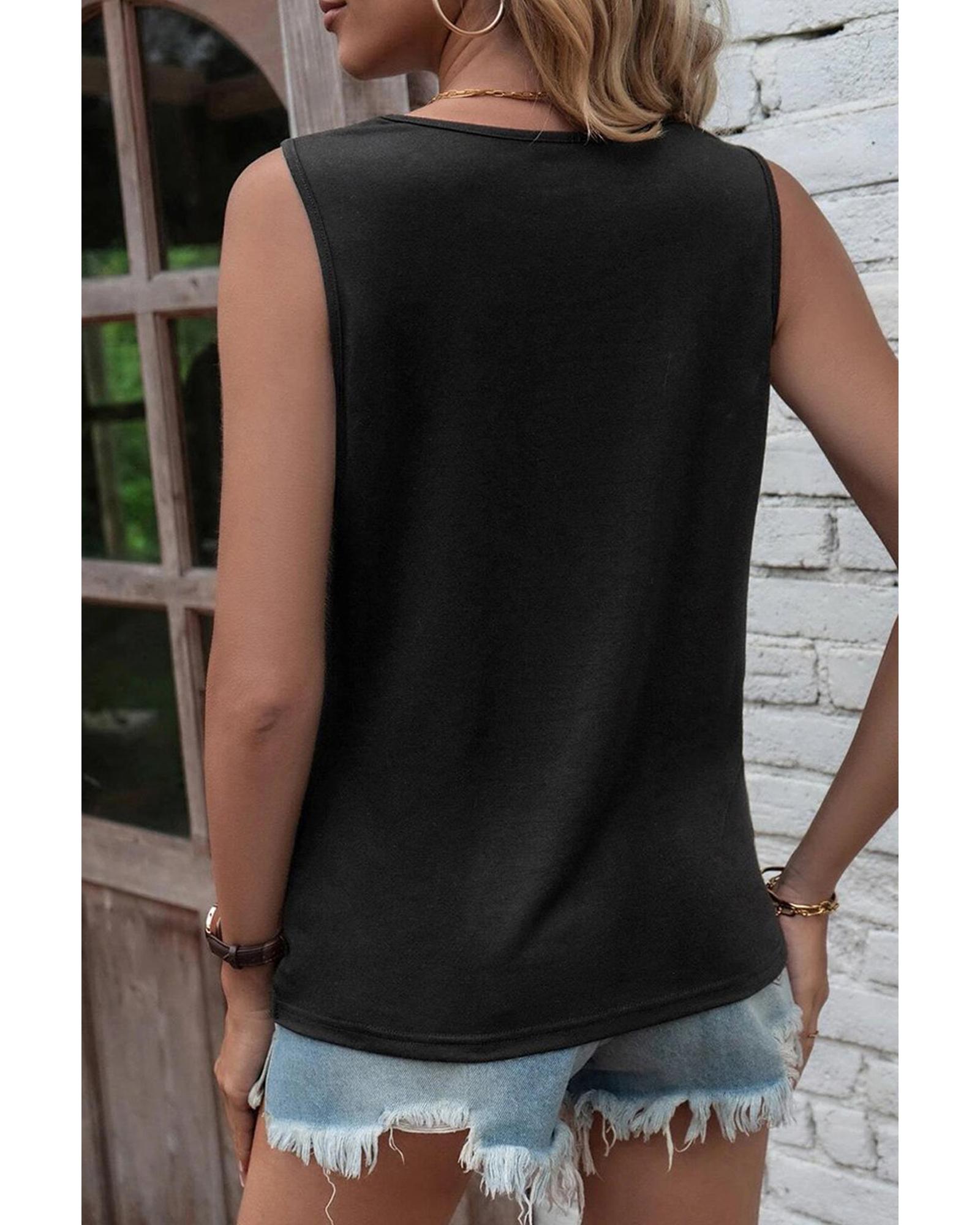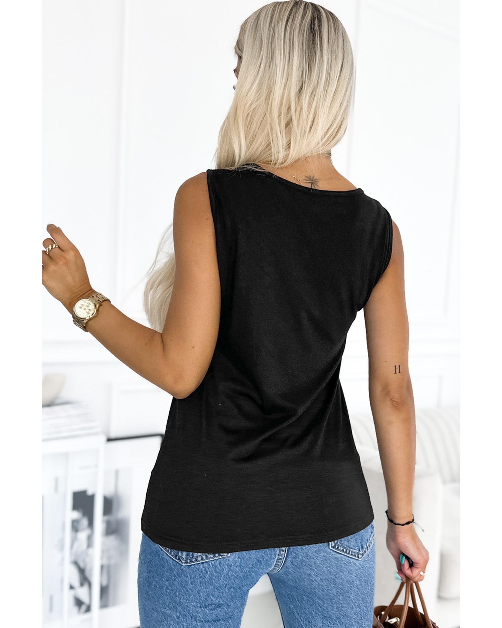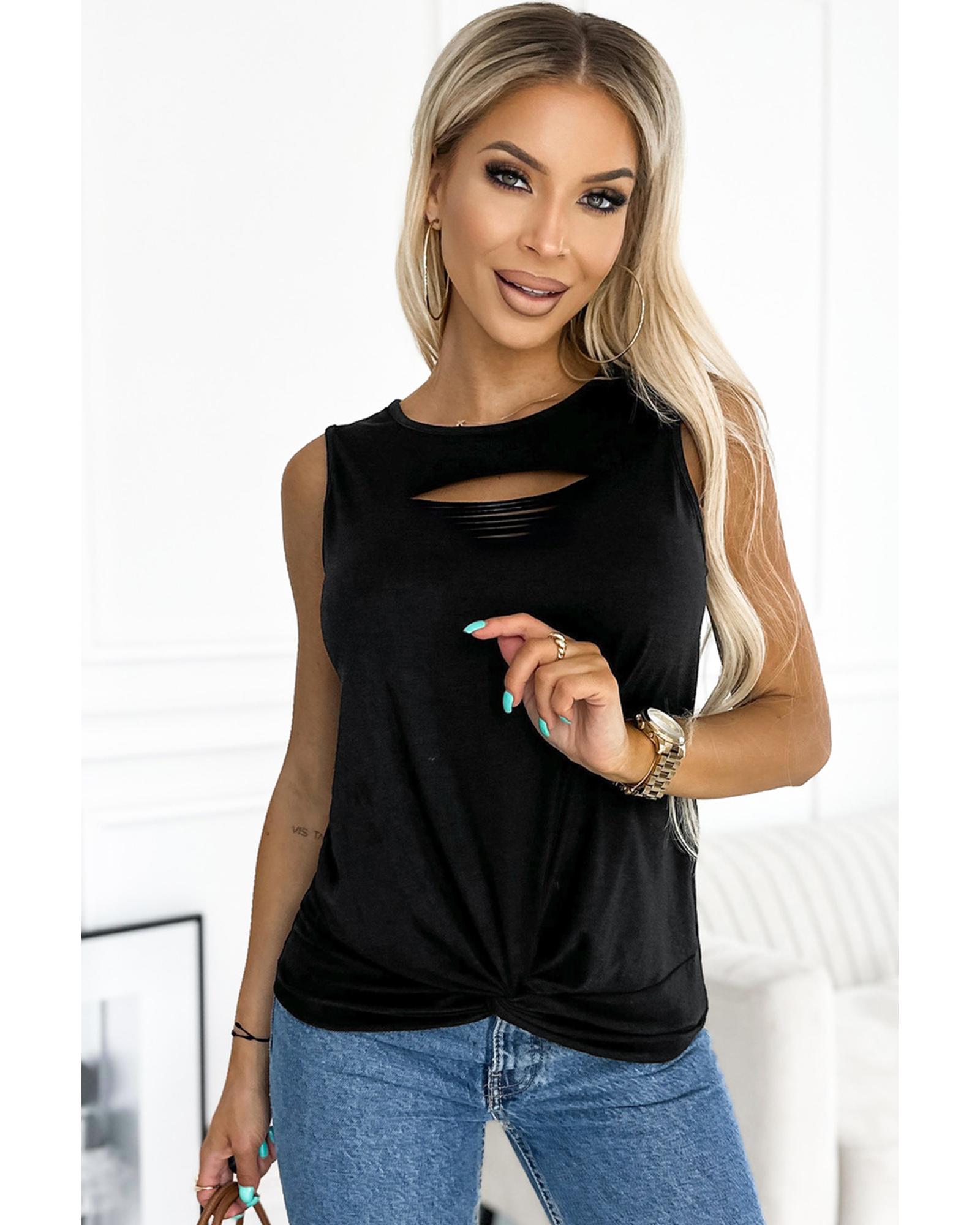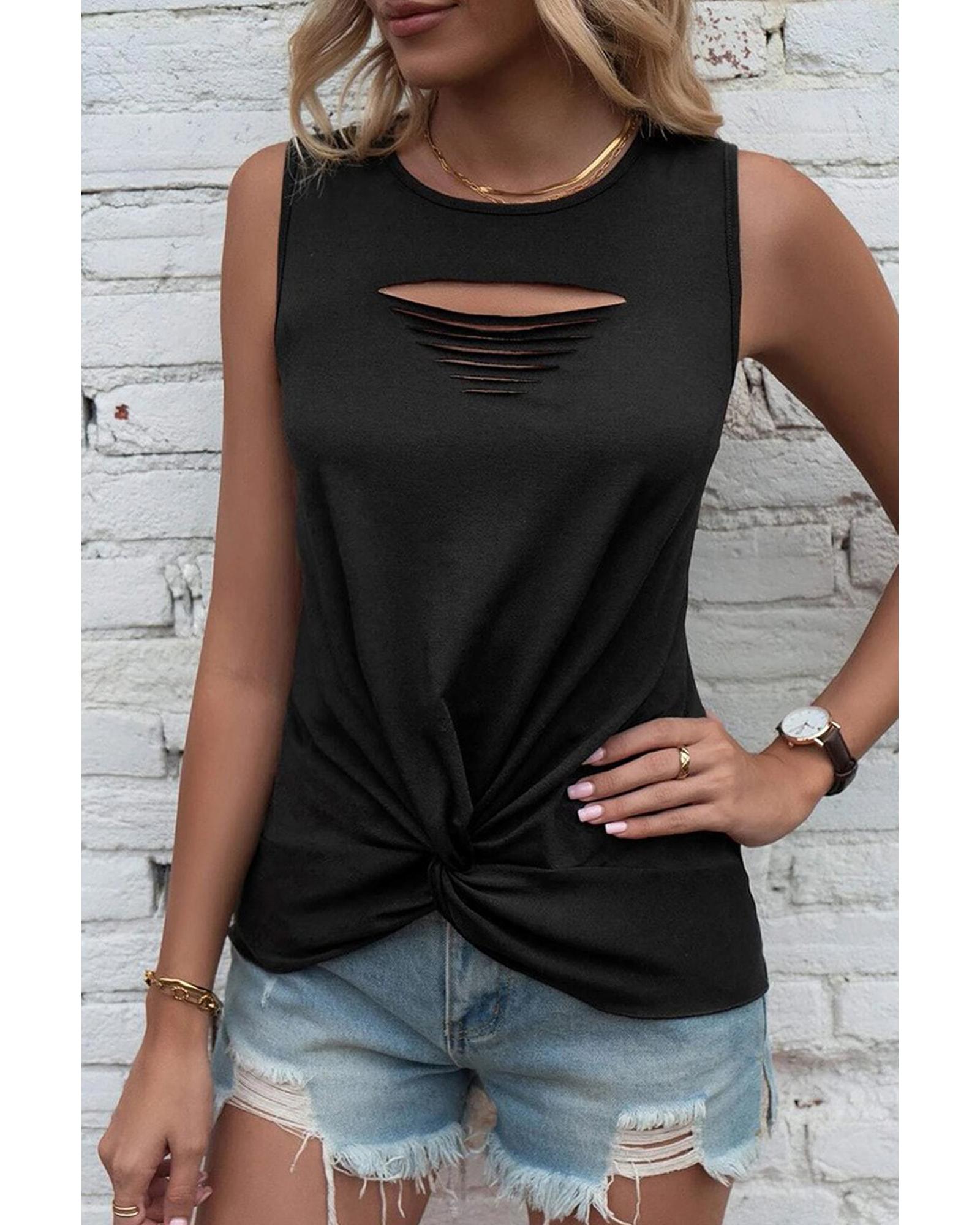 Black Laser Cut Slits Twist Front Tank Top – M