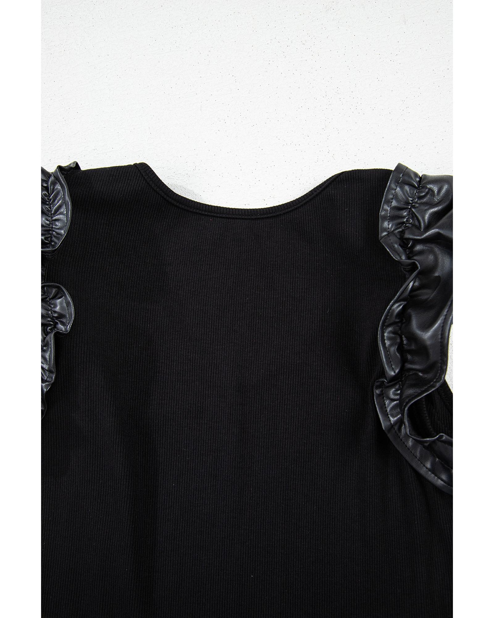 Black Leatherette Ruffle Patchwork Ribbed V Neck Bodysuit – S