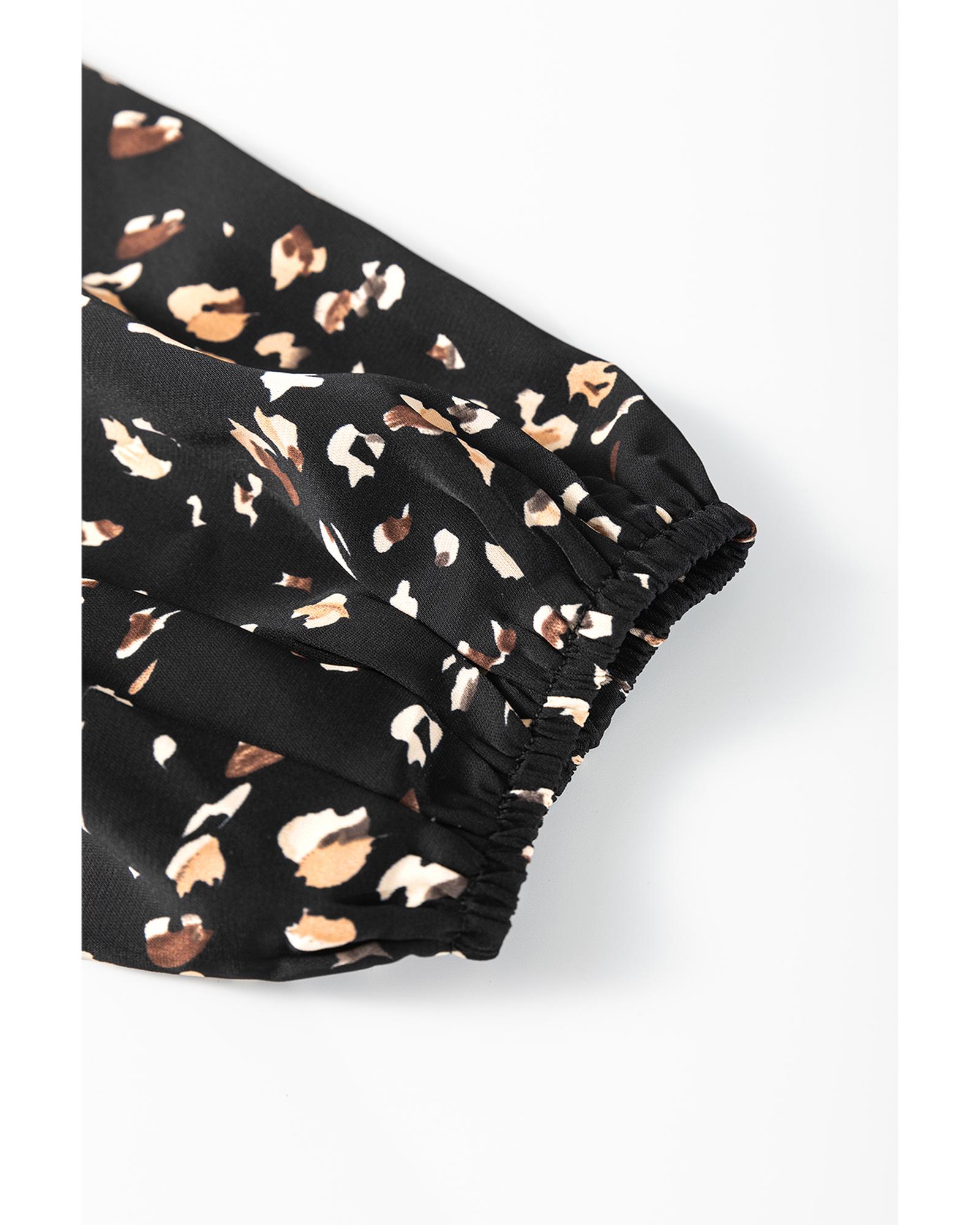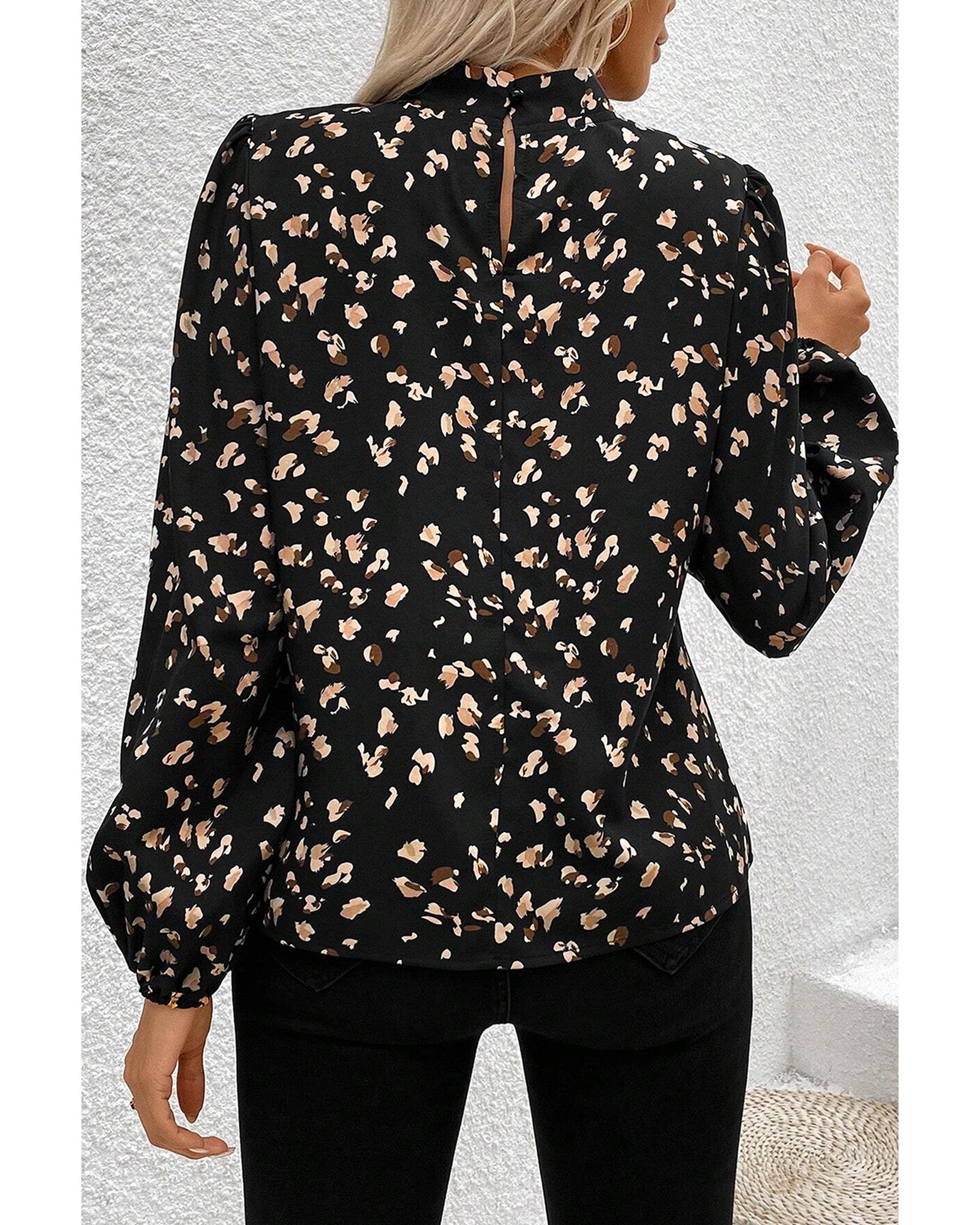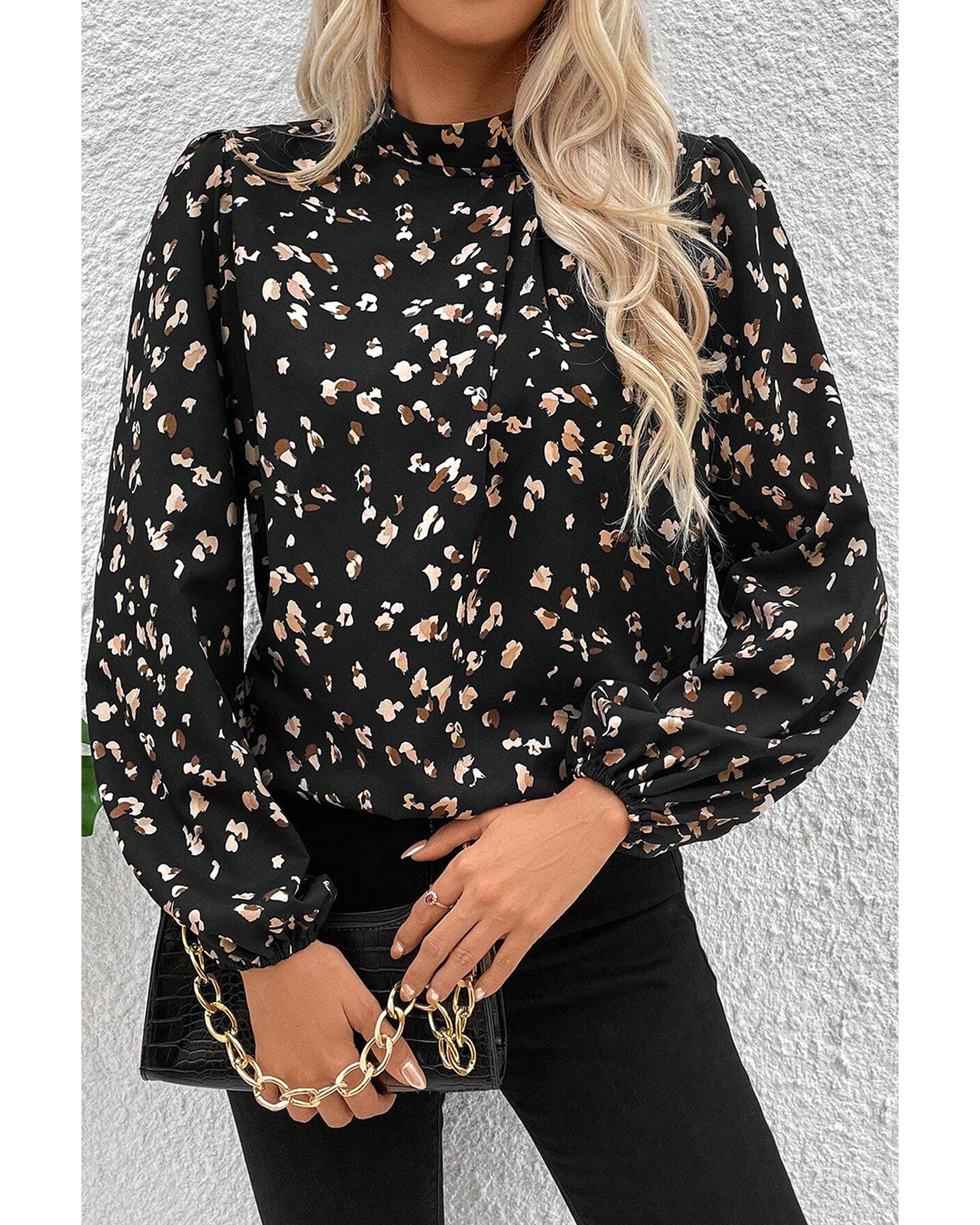 • Black Leopard Print Lantern Sleeve Mock Neck Pleated Blouse
