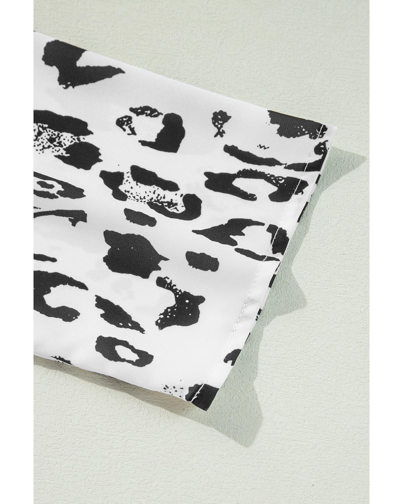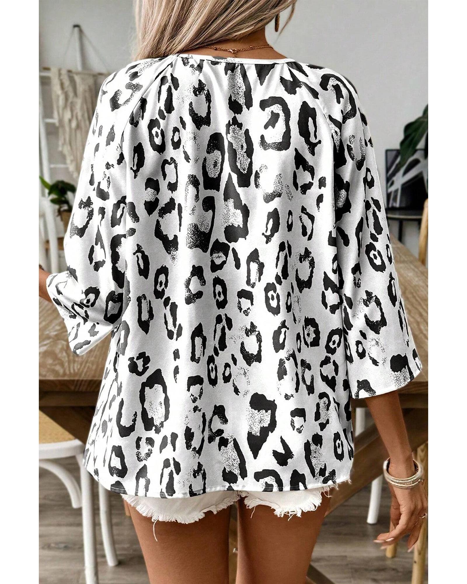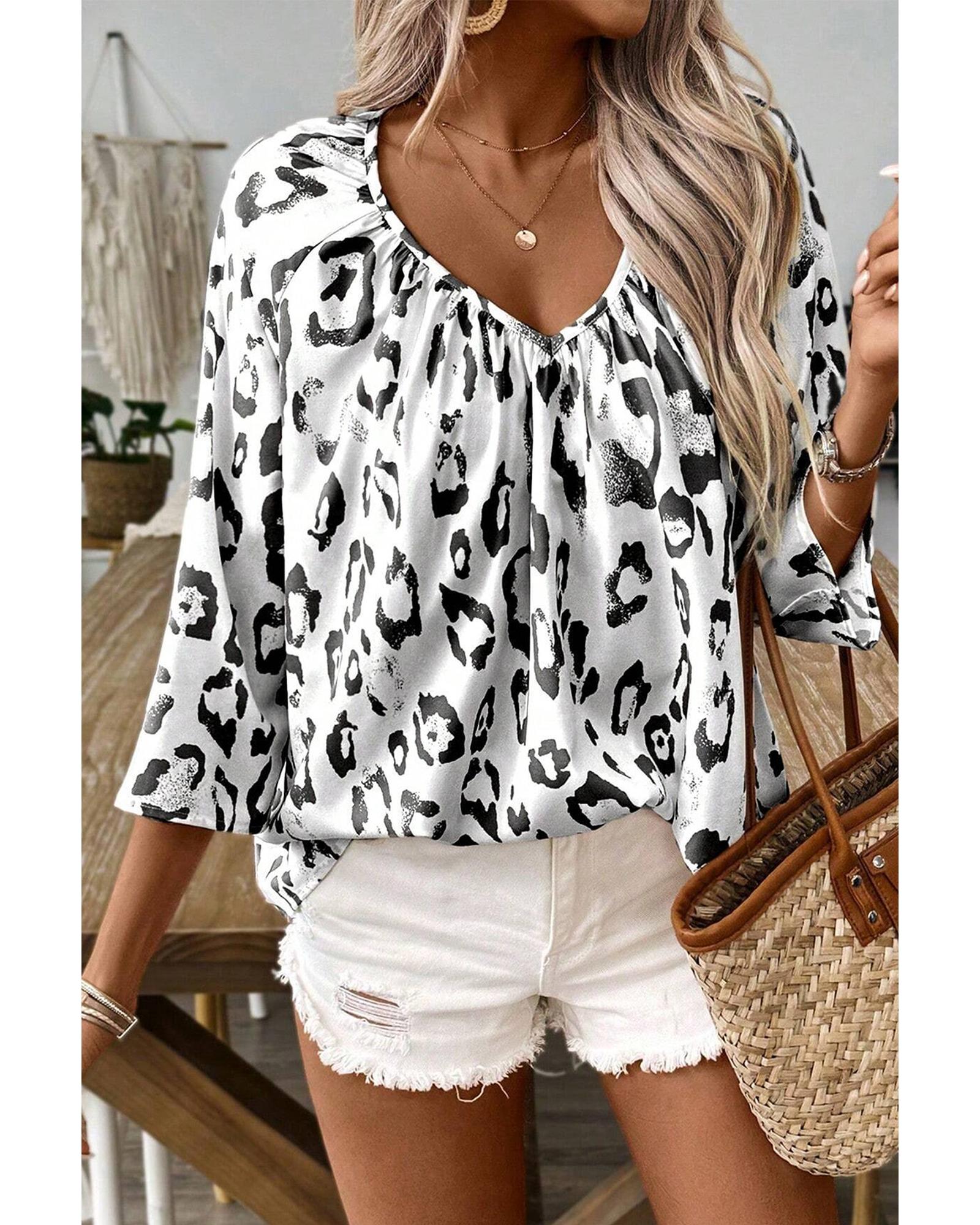 - Black Leopard Print Ruched V Neck 3/4 Sleeve Blouse