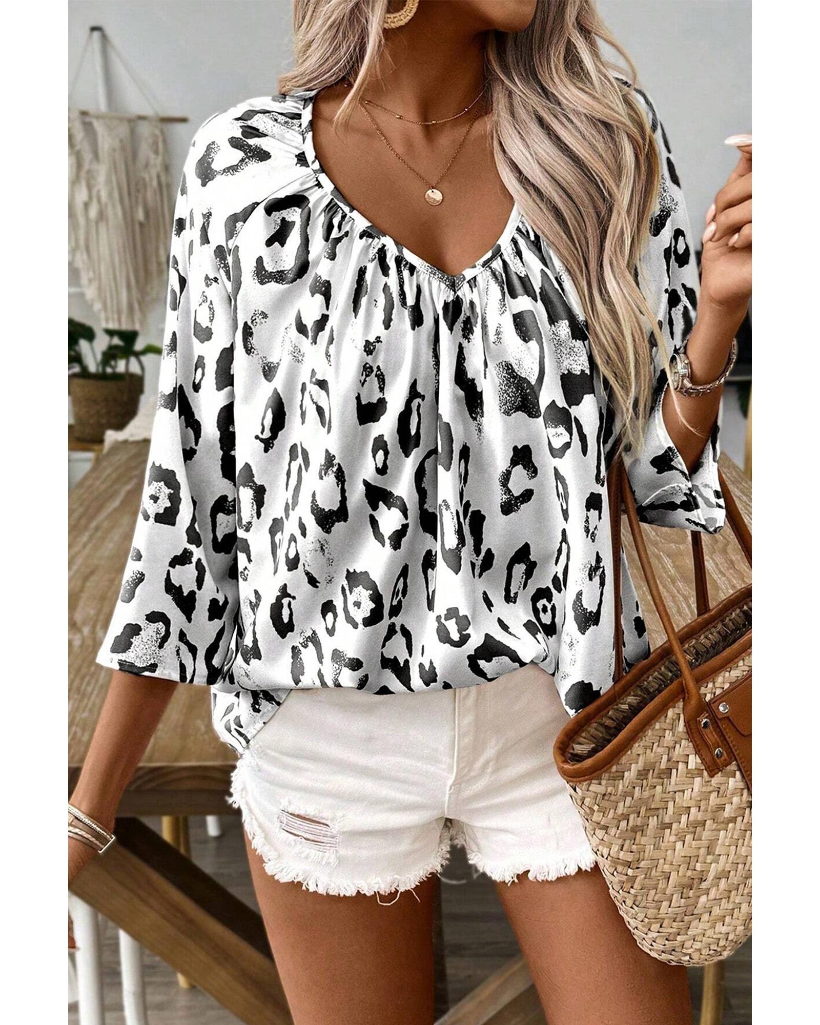 - Black Leopard Print Ruched V Neck 3/4 Sleeve Blouse