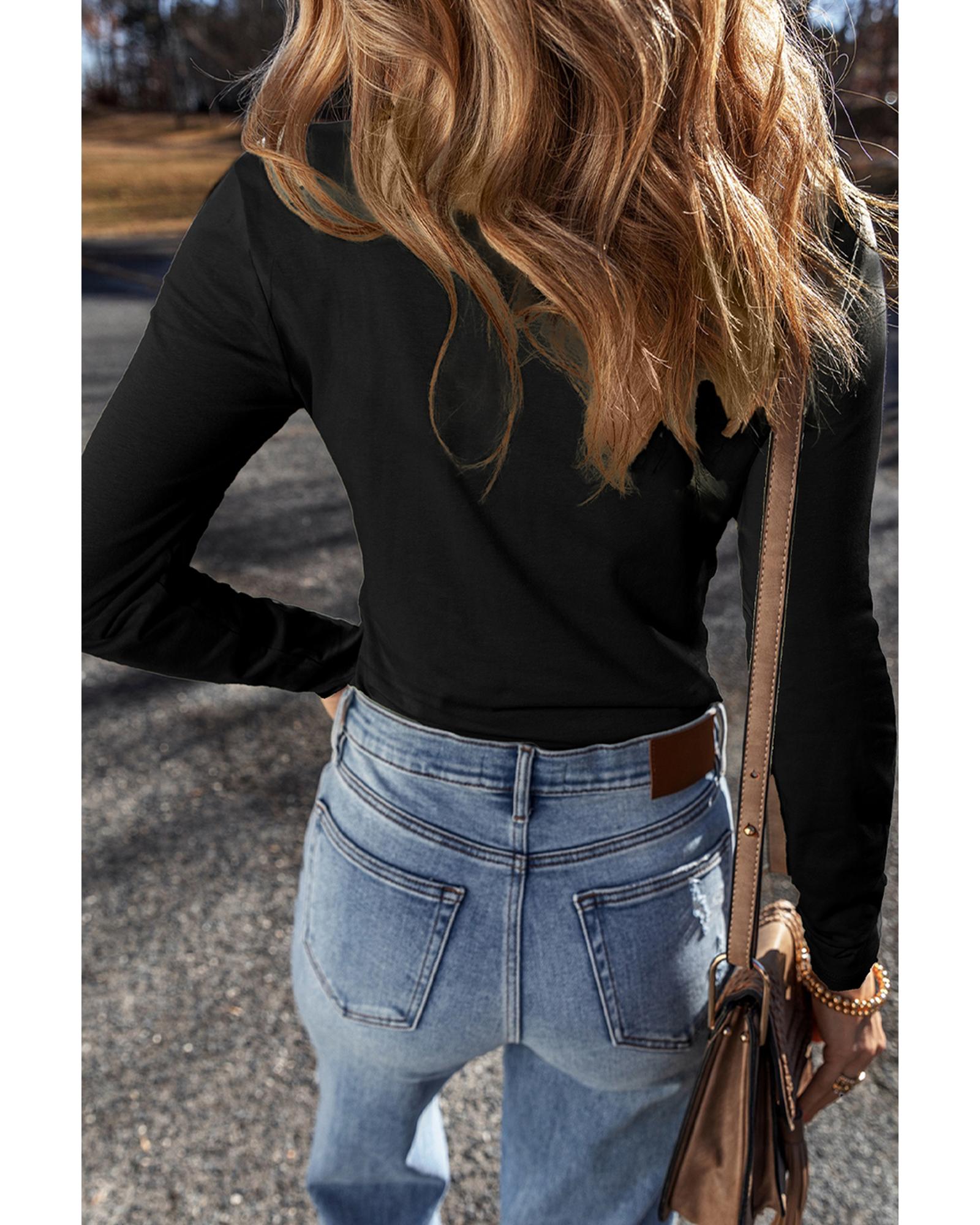 - Black Long Sleeve Buttons V Neck Slim Fit Top