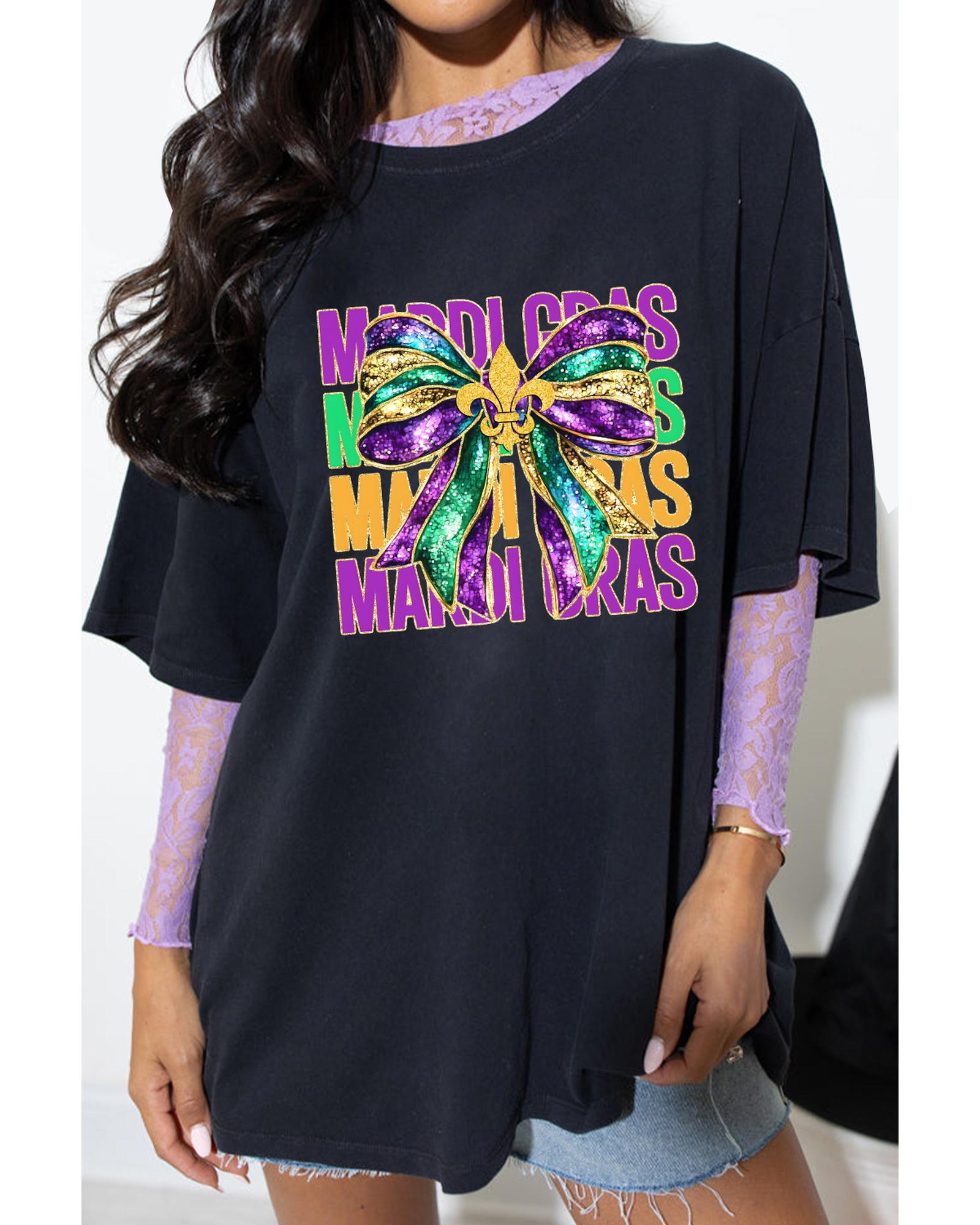 - Black MARDI GRAS Fleur de Lis Bowknot Printed Crewneck Tee